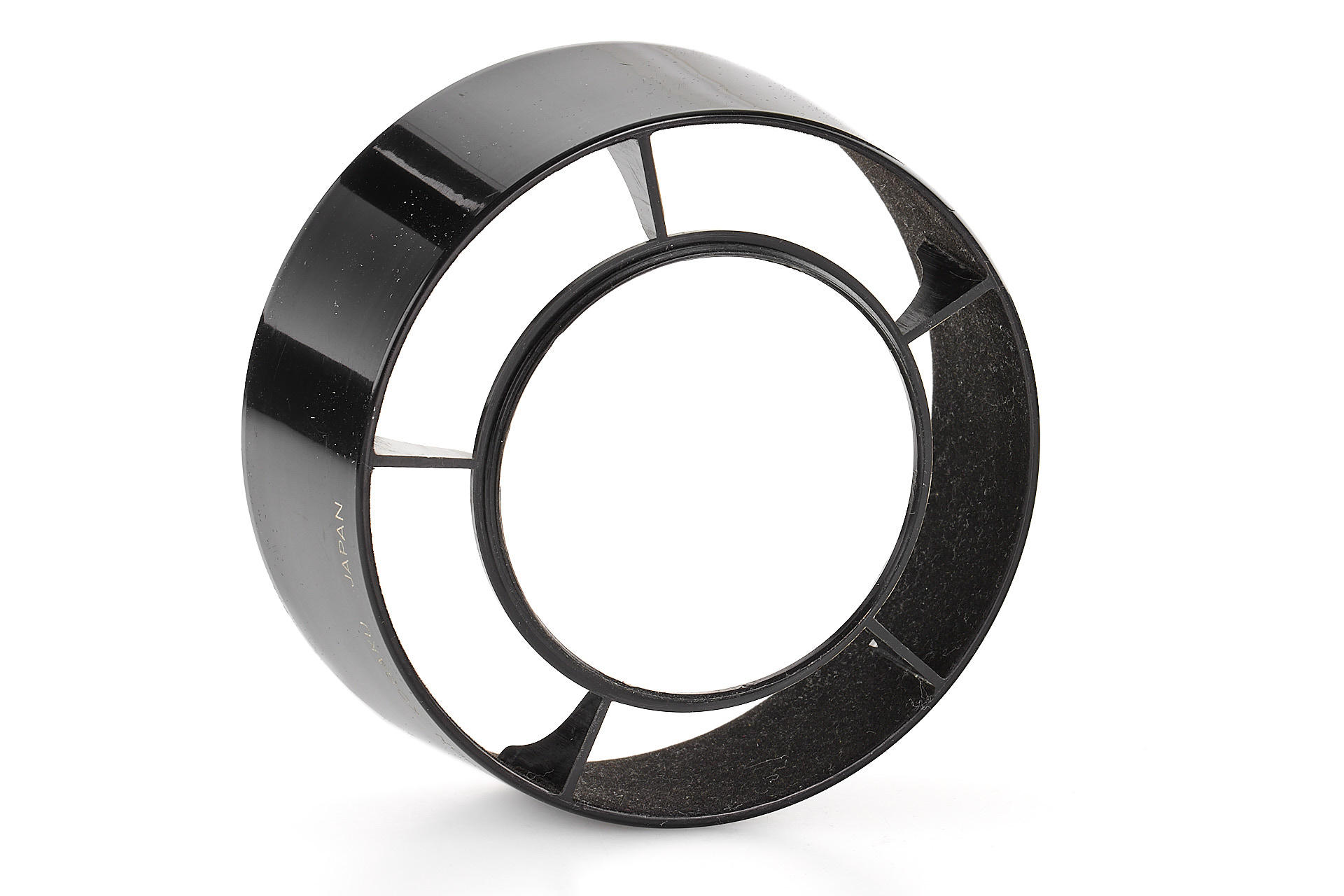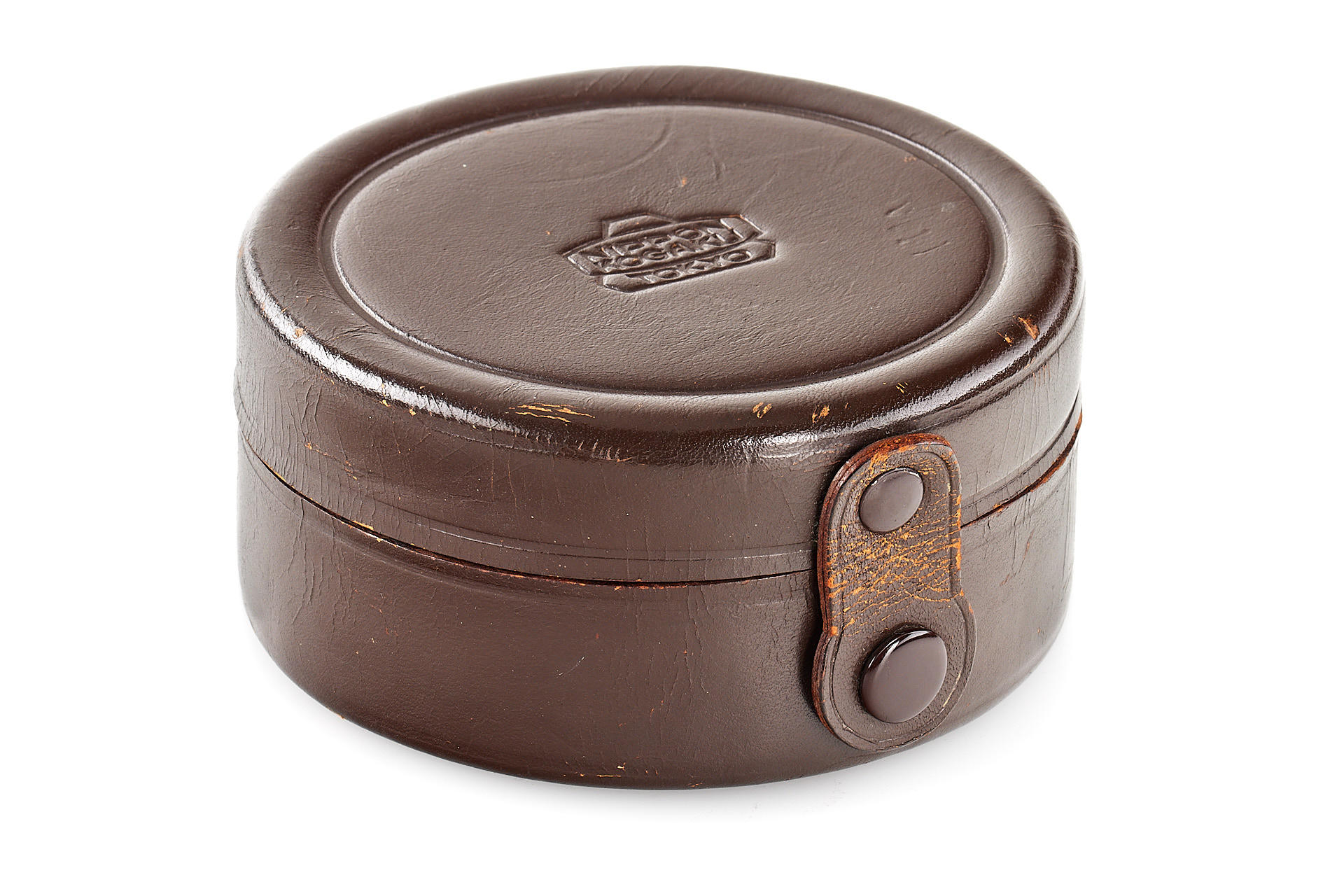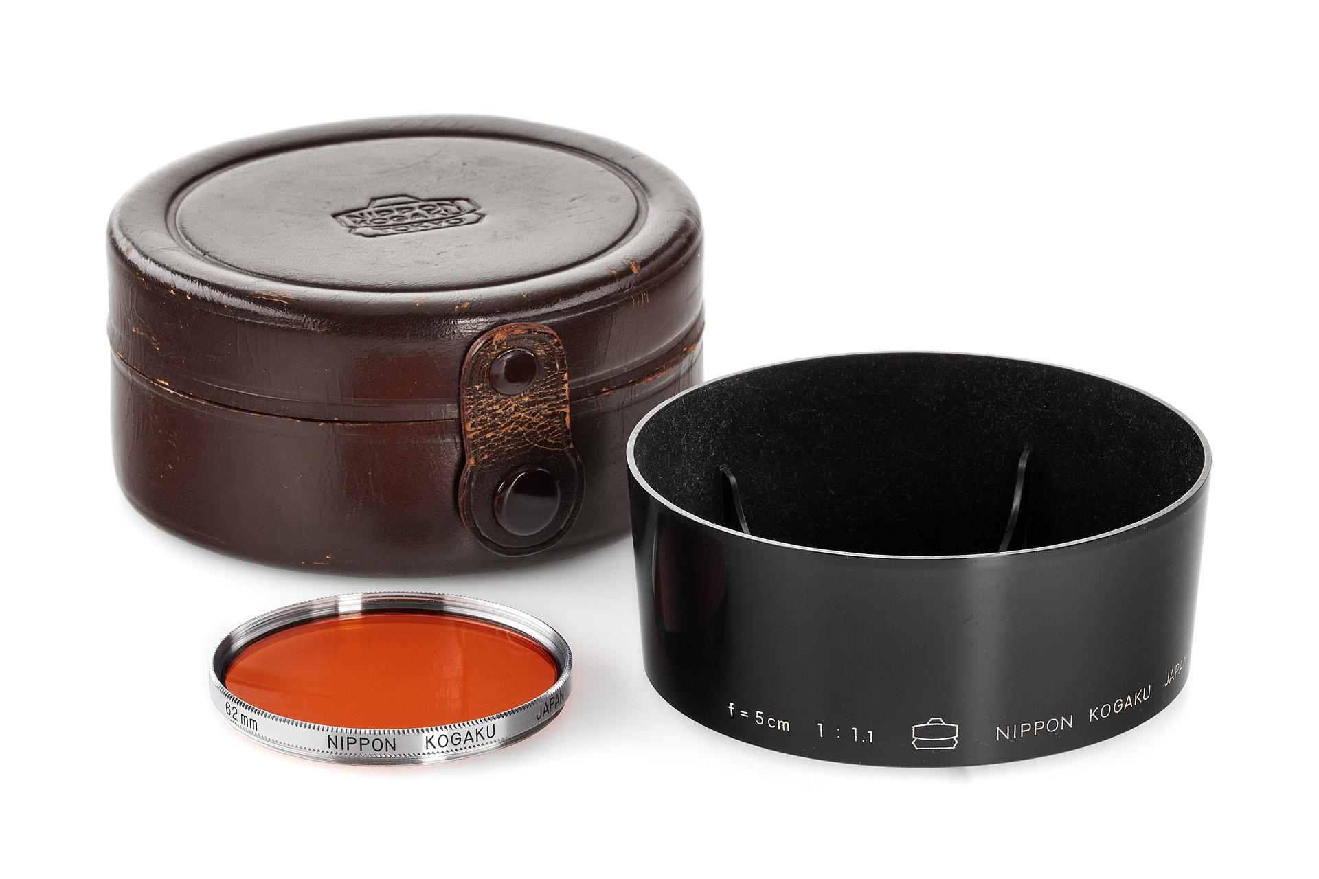 Very rare and impressive special vented hood, plastic version in absolutely mint condition, together with maker's special fitted brown leather case and orange filter O57, hard to find undamaged like this one is!