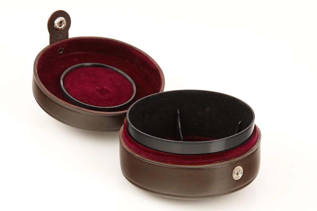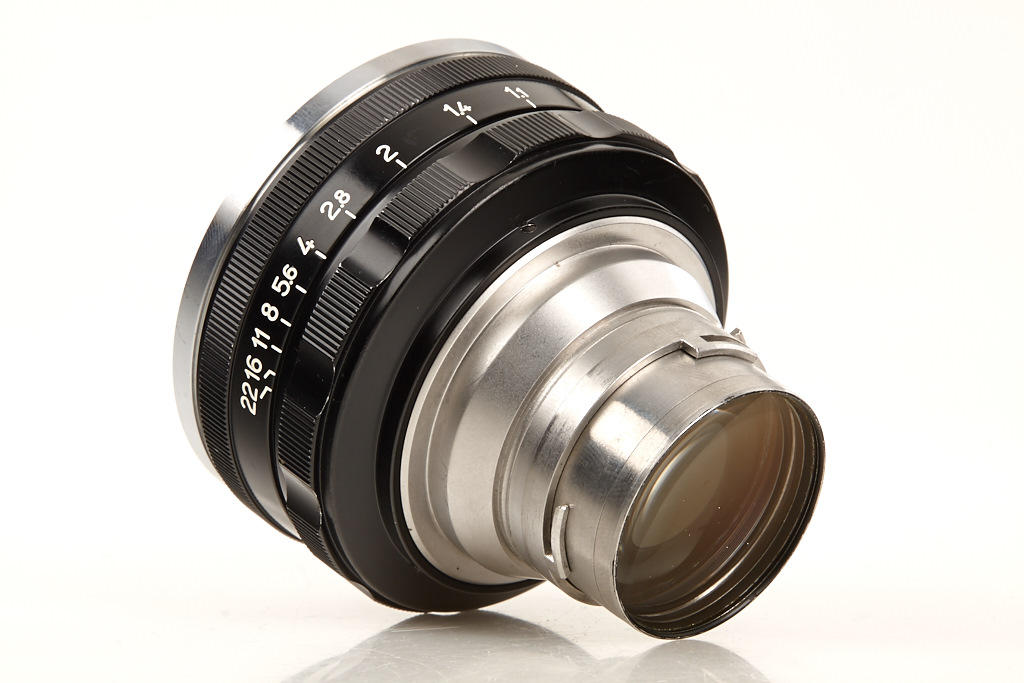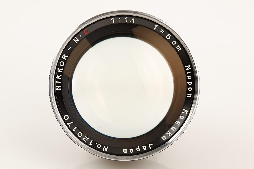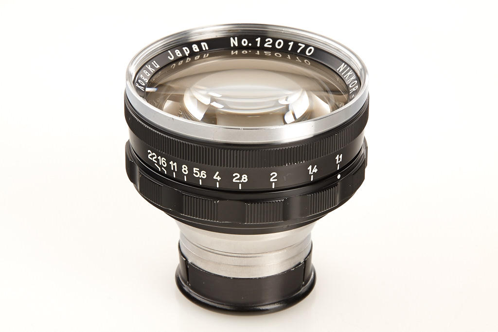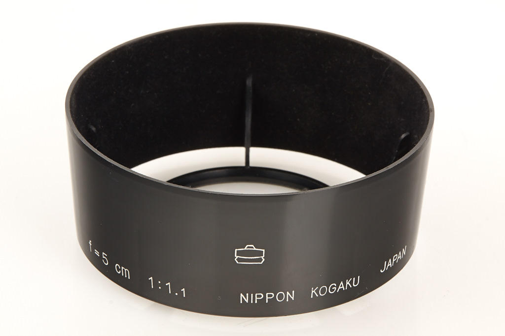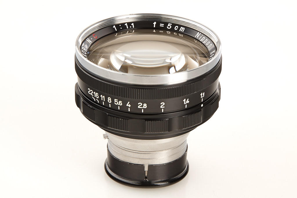 rare and extremely fast lens for Nikon rangefinder cameras with internal bayonet, original front and rear cap, very small cleaning mark on front lens element, original hood (small crack in thread, case)