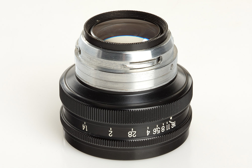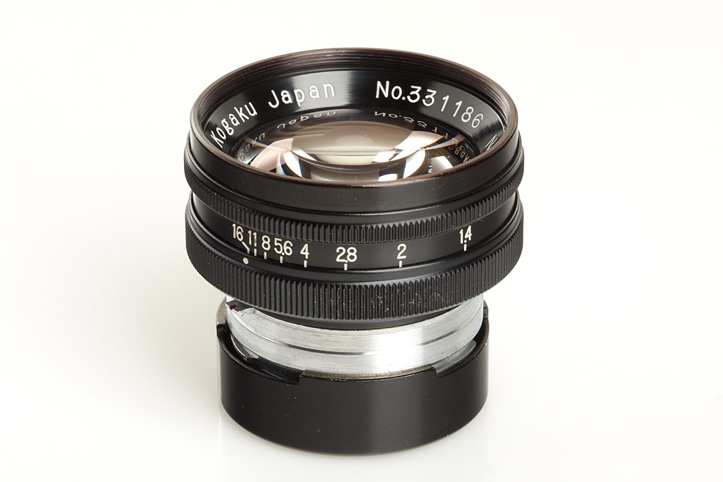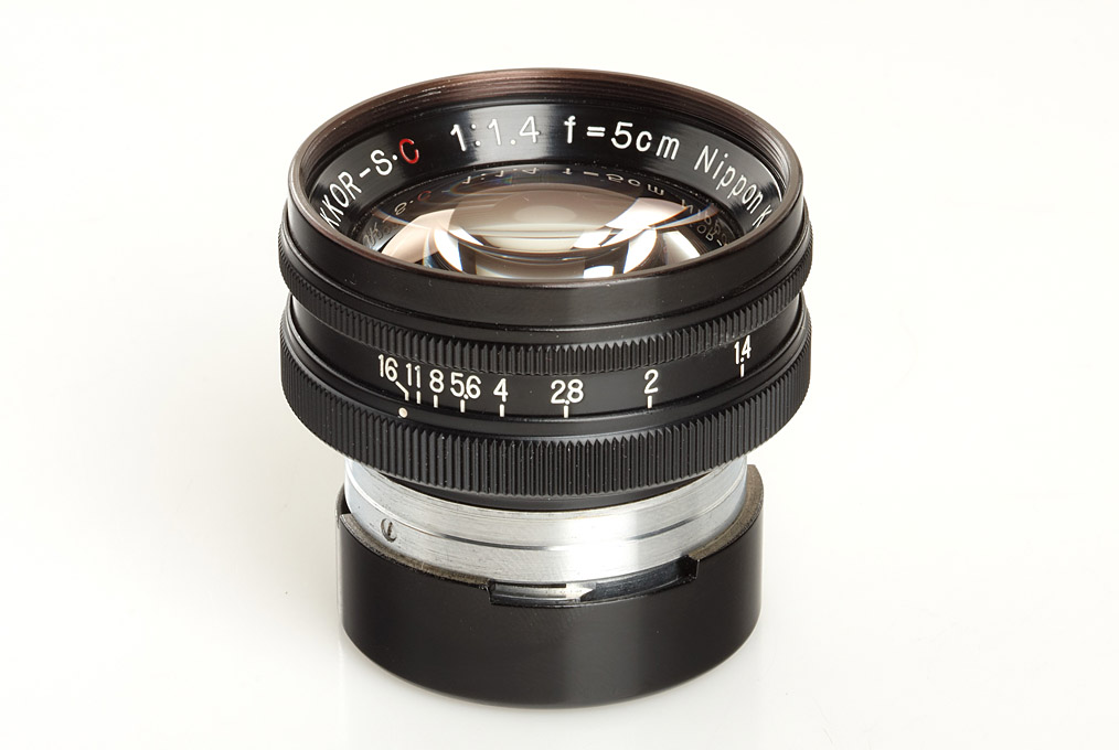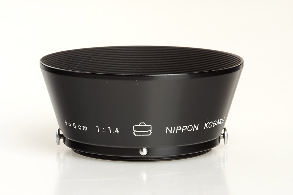very rare all-black Nikkor, first version in near mint condition with both caps, matching metal hood in mint condition with maker's box