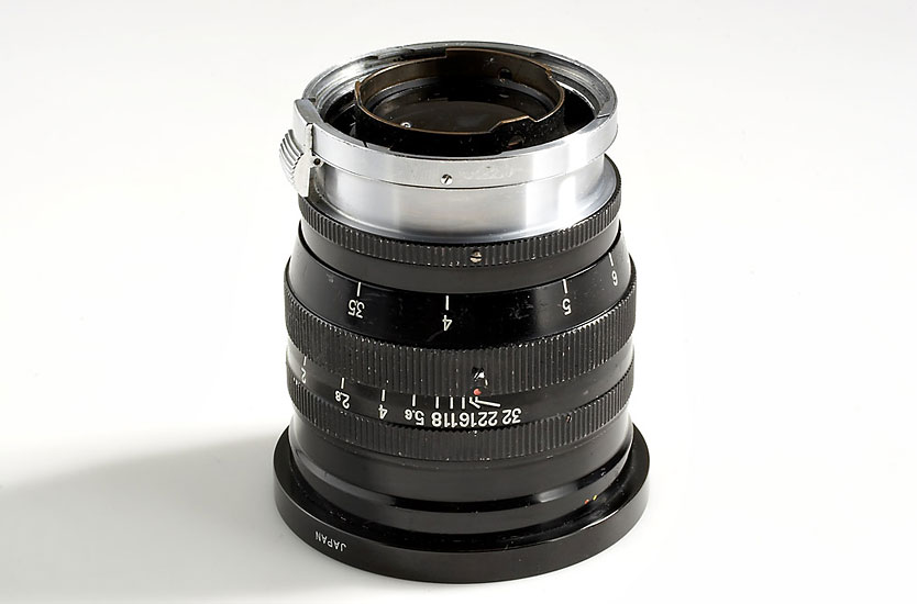 rare, black paint 8.5cm f/1.5 Nikkor with "C" (for Contax) with original hood, both caps, many cleaning marks on front lens element