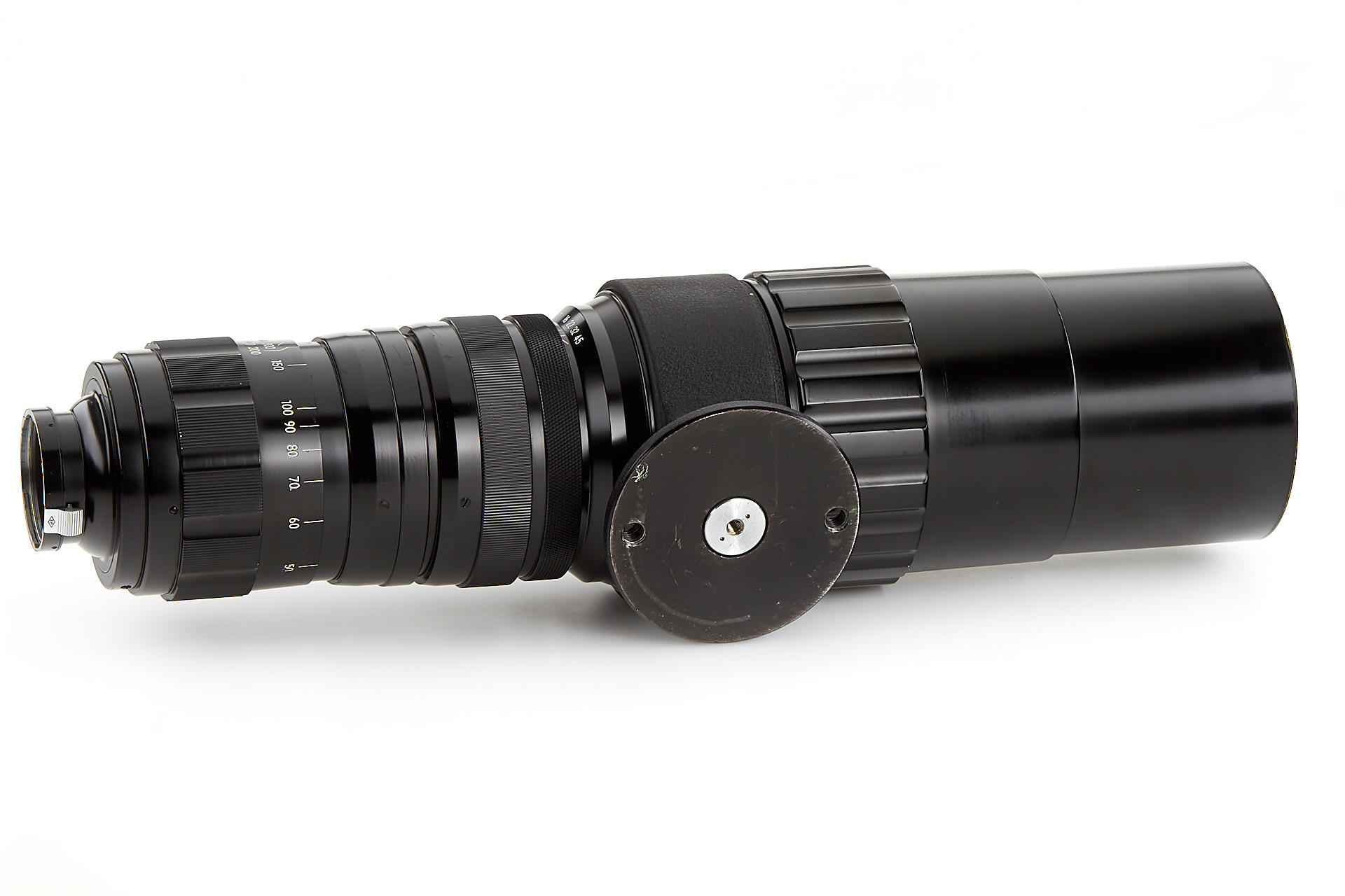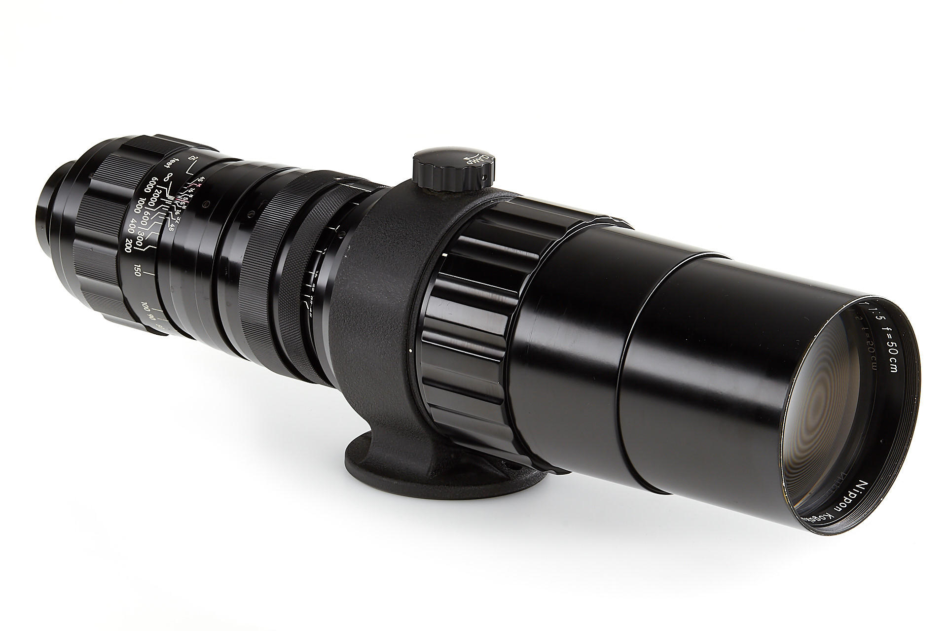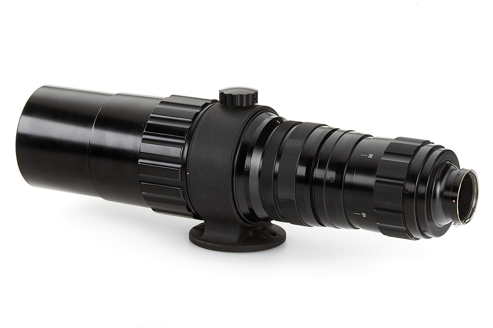 massive telephoto lens, made for use with reflex housing, one of the last made - production ceased with no.647285, total production in Nikon bayonet mount was 157 units only, in near mint condition, clean optics, metal hood and front cap, maker's wooden case (inspection slip, keys)