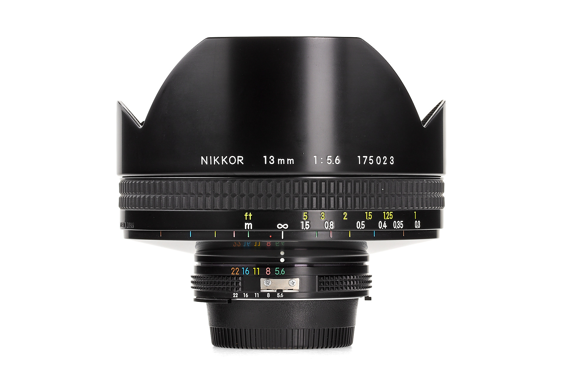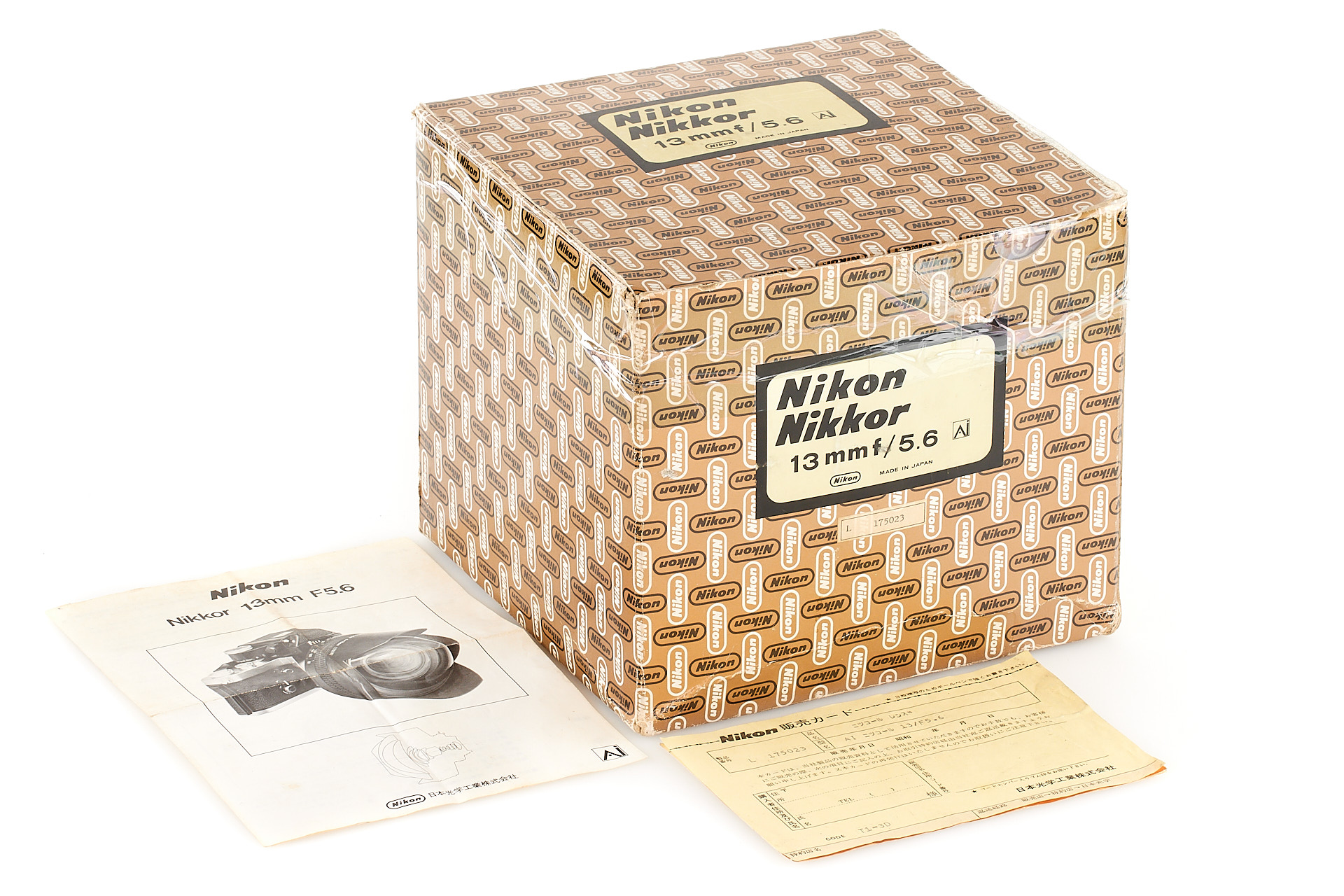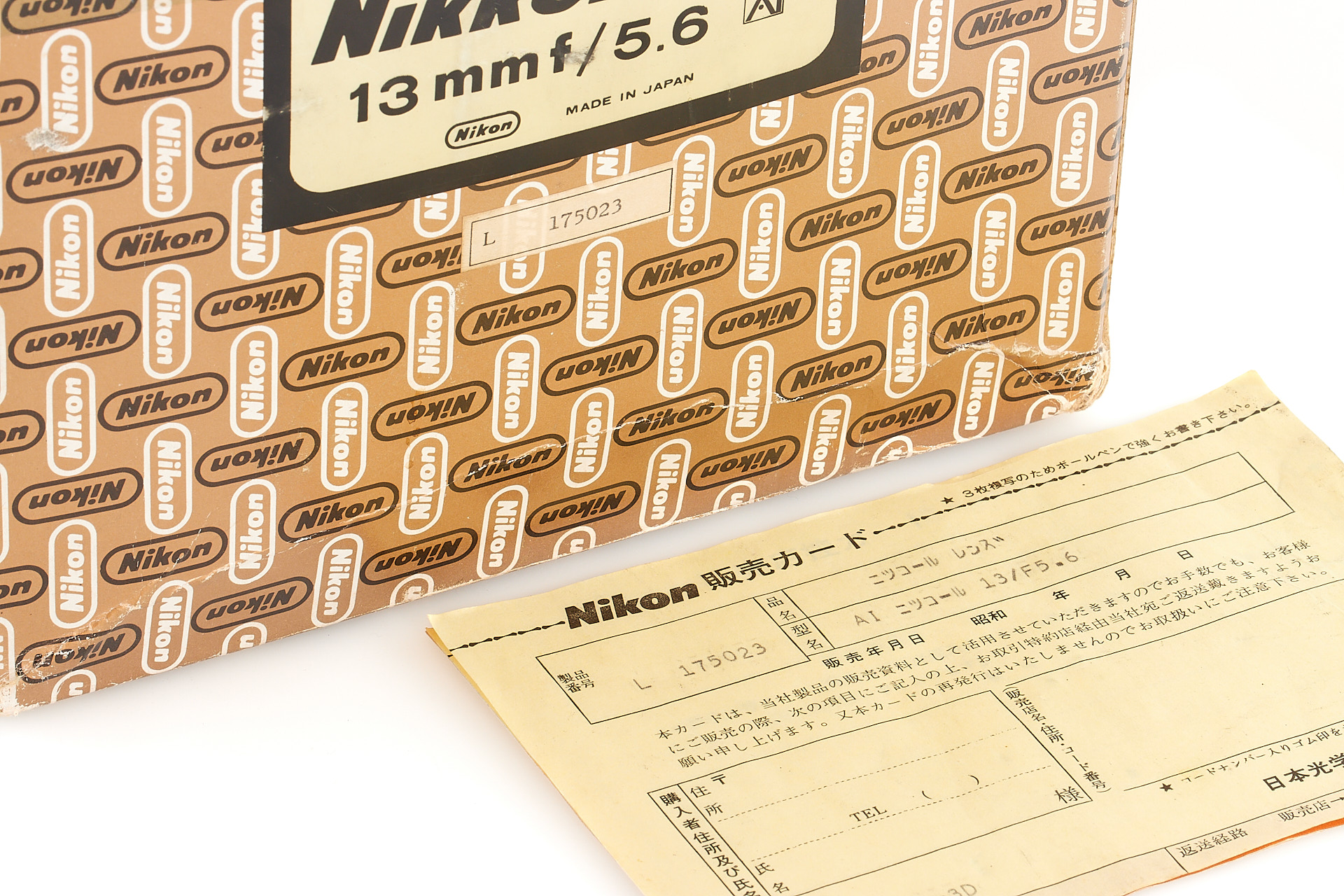 AI-Version, in nahezu neuwertigem Zustand, mit perfekter Optik, mit Originaldeckel, vier Filtern, Etui, Herstellerbox mit passender Nummer, japanischer Garantiekarte und Anleitung (Etui und Box getragen). Zum Zeitpunkt seiner Einführung war das Nikon 13mm das weltweit weiteste, unverzerrte professionelle SLR-Objektiv. Es ermöglicht, näher an das Motiv heranzugehen, Entfernungen zu verlängern und Bilder aus sonst unvorstellbaren Perspektiven zu erzeugen. In 22 Jahren (1976-1998) wurden nur etwa 350 Exemplare hergestellt, und das auch nur auf Sonderbestellung. Das Objektiv kommt nur selten auf den Markt und ist in diesem guten Zustand schwer zu finden.