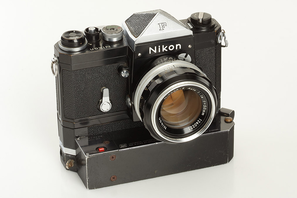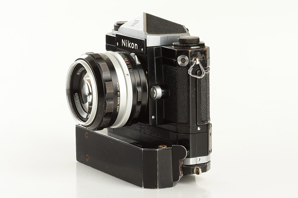 famous camera outfit used by Clint Eastwood in Hollywood movie 'The Bridges of Madison Country' (with Meryl Steep), black Nikon F with chrome eyelevel prism finder, Nikkor-S Auto 1.4/50mm no.1240225, F-36 motor drive no.157646 (type 9), TPI Powercon Model 36S cordless battery pack - the story of the film and the cameras is printed in Nikon Magazine of the Nikon Owner's Club International Issue 3 2001. With two photographs showing Clint Eastwood with his Nikon on the set.