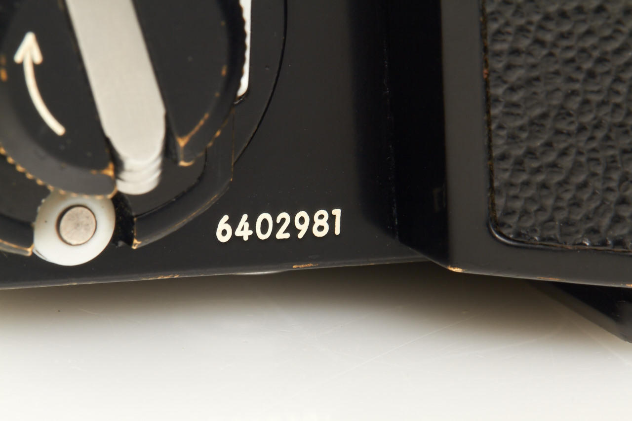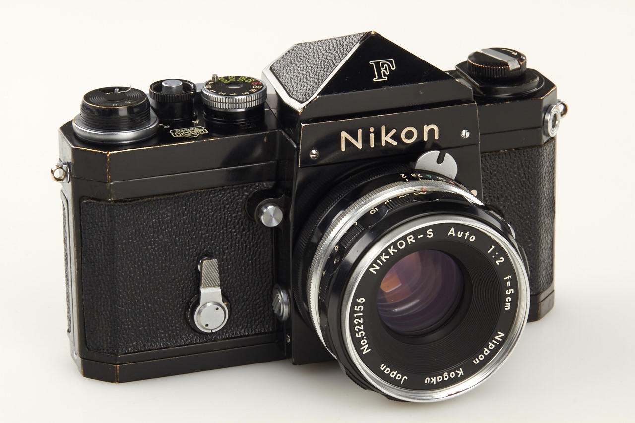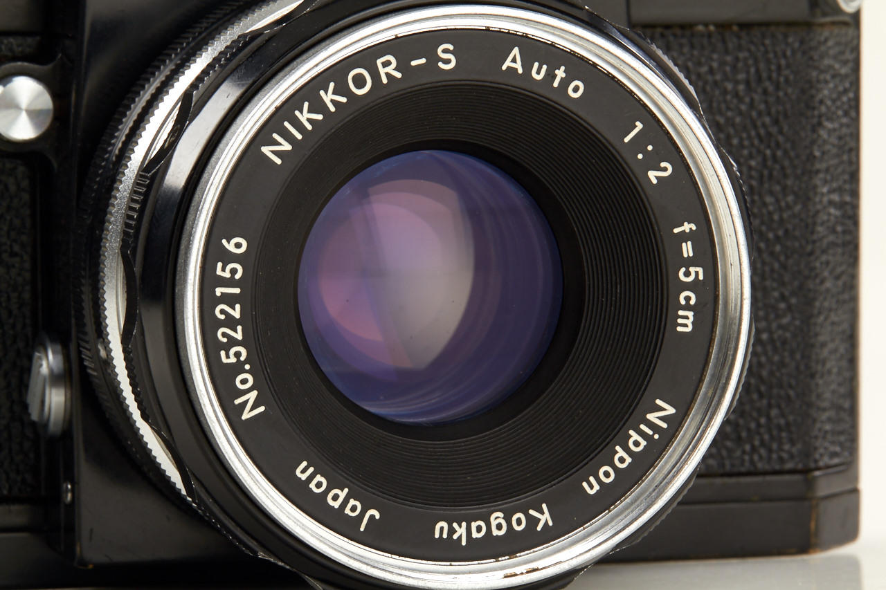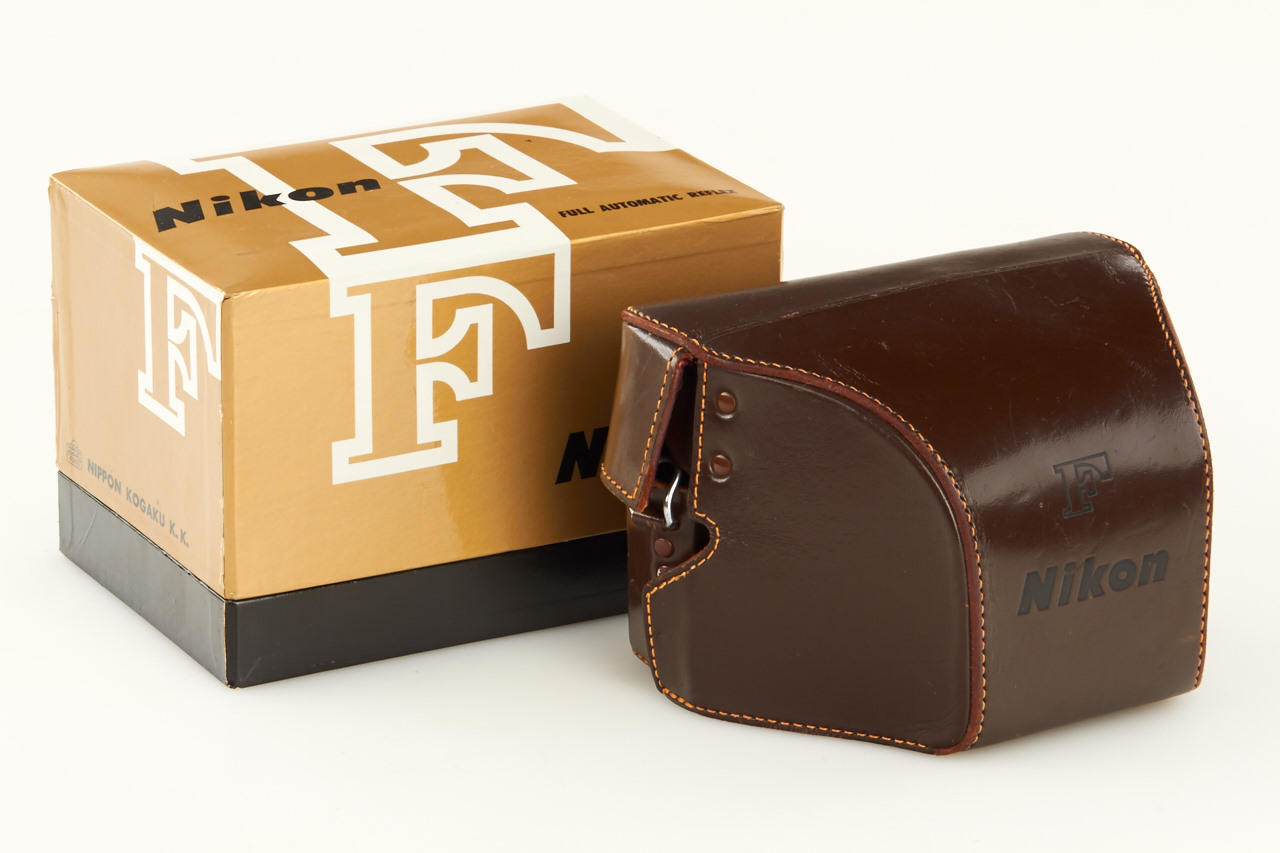 very early black paint body with all correct features in fully working order, eyelevel finder engraved 'NIPPON KOGAKU JAPAN', with 'Tick Mark' Nikkor-S 2/5cm no.522156 (clear lenses, some cleaning marks in front) with matching hood engraved 'NIPPON KOGAKU JAPAN' and NK - Logo, very early 'Tick Mark' Nikkor-P 2.5/10.5cm no.120460 in fine and fully original condition (cap, plastic keeper, matching hood), light meter Type 2, no.784609 in working (!) order, early Nikon F everready case in deep brown colour with light brown stitches (cond. B+), original early Nikon F maker's box showing the incorrect 'Full Automatic Reflex' inscription instead of 'Fully' in perfect condition - with both original caps for the lens and the matching body cap - all with 'NIPPON KOGAKU JAPAN' and NK - logo