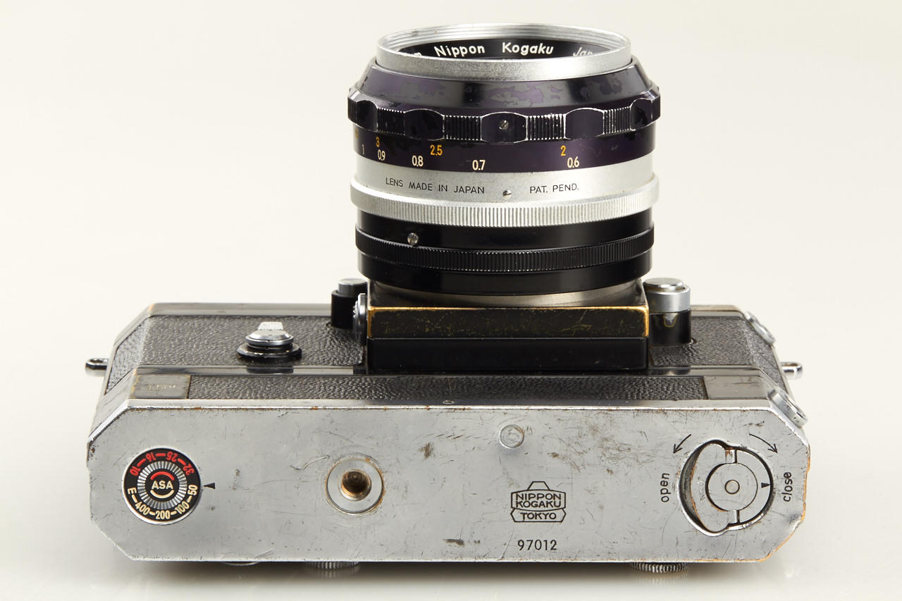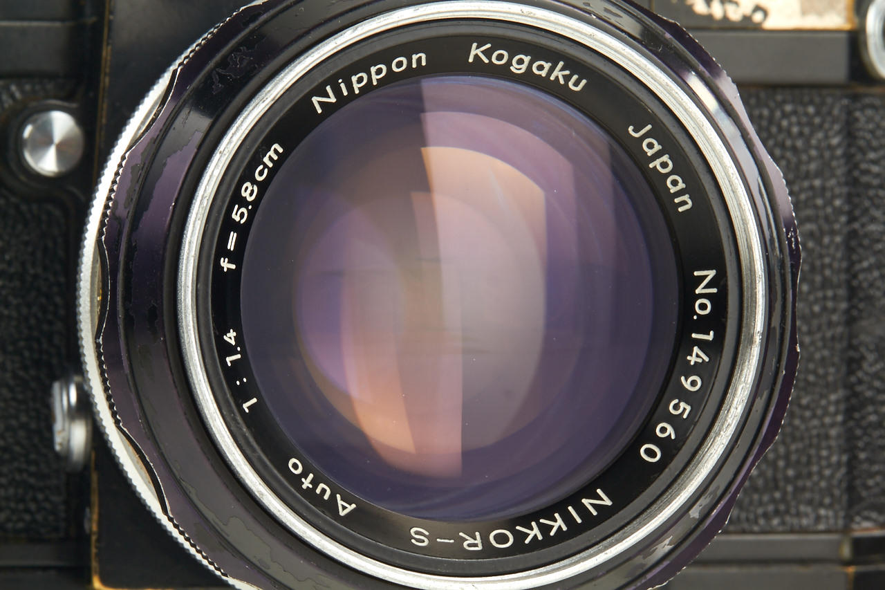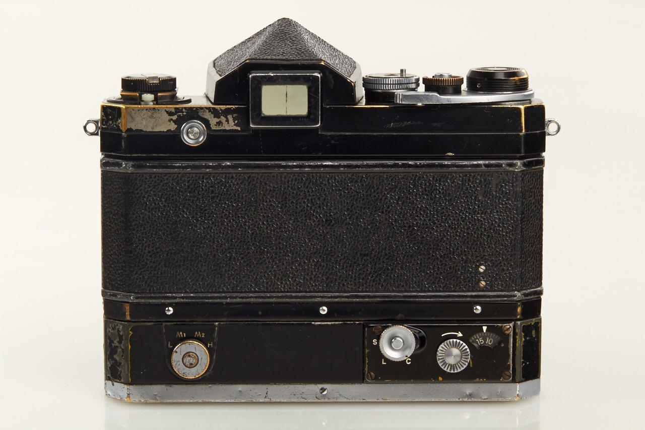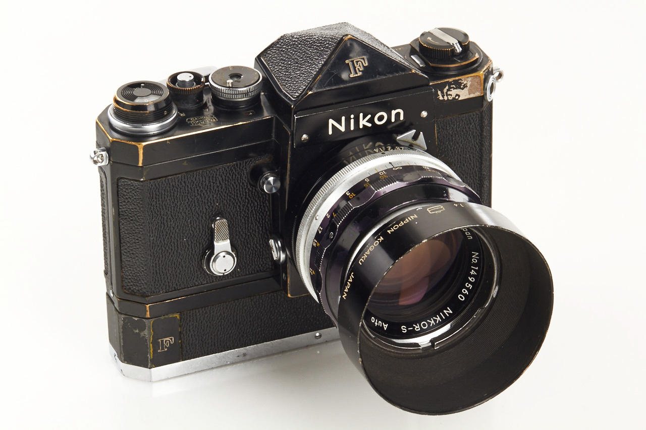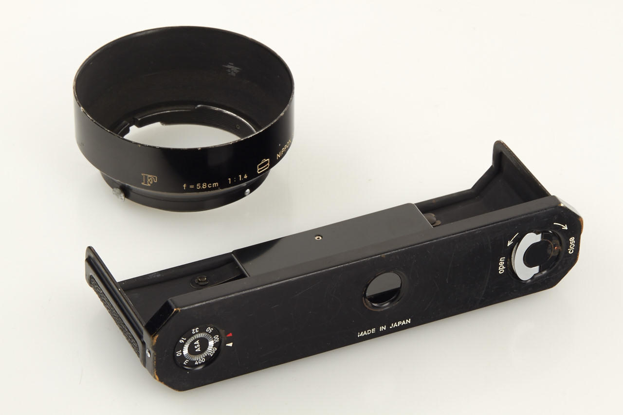 early black paint body with all correct features, eyelevel finder engraved 'NIKON F JAPAN' with rare Nikkor-S 1.4/5.8cm, Type 1, no.149560 (clear lenses, matching hood engraved 'NIPPON KOGAKU JAPAN', NK - Logo, the camera comes with F-36 motor drive no.97012 (cond.C) - this is the most early motor drive for the Nikon F known to exist (production started with number 97001), illustrated in 'Ulli Koch, NIKON F, Volume III, The Accessories', page 94, with matching separate battery pack in grey with correct grey cable and shoulder strap (cond.B), additional and correct regular back type 3, camera & motor drive in perfect working order, both original caps for the lens and cap for the body, all matching, engraved 'NIPPON KOGAKU JAPAN' and NK - logo.