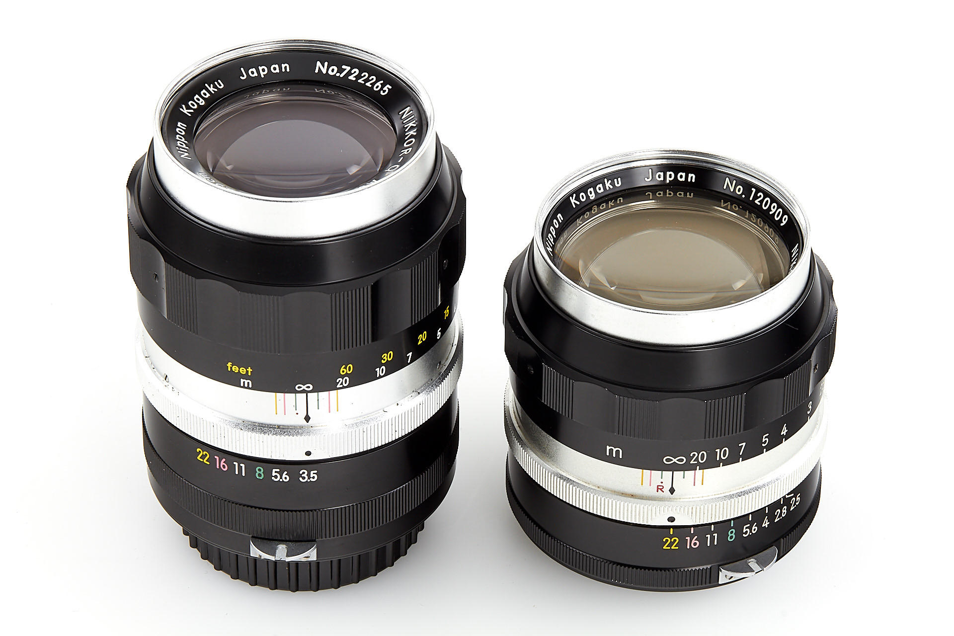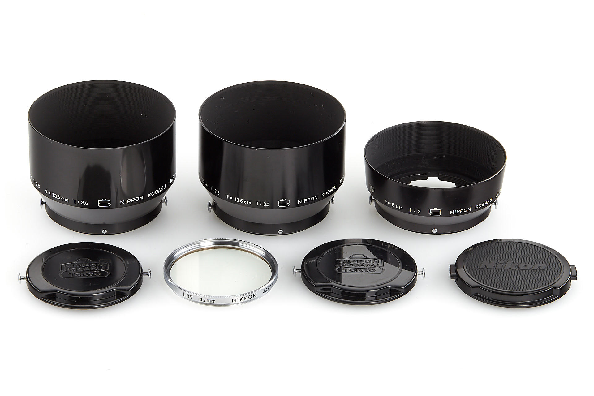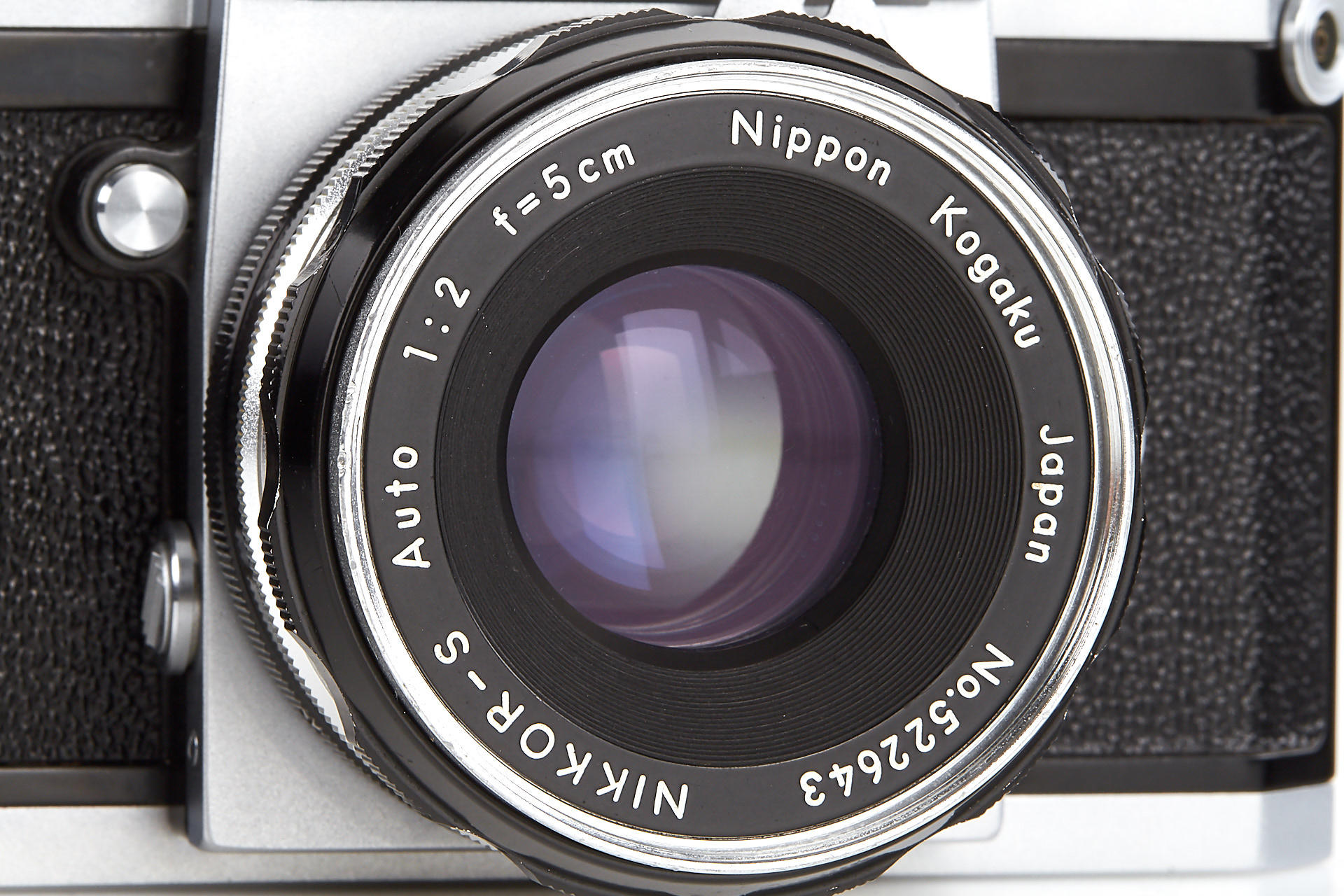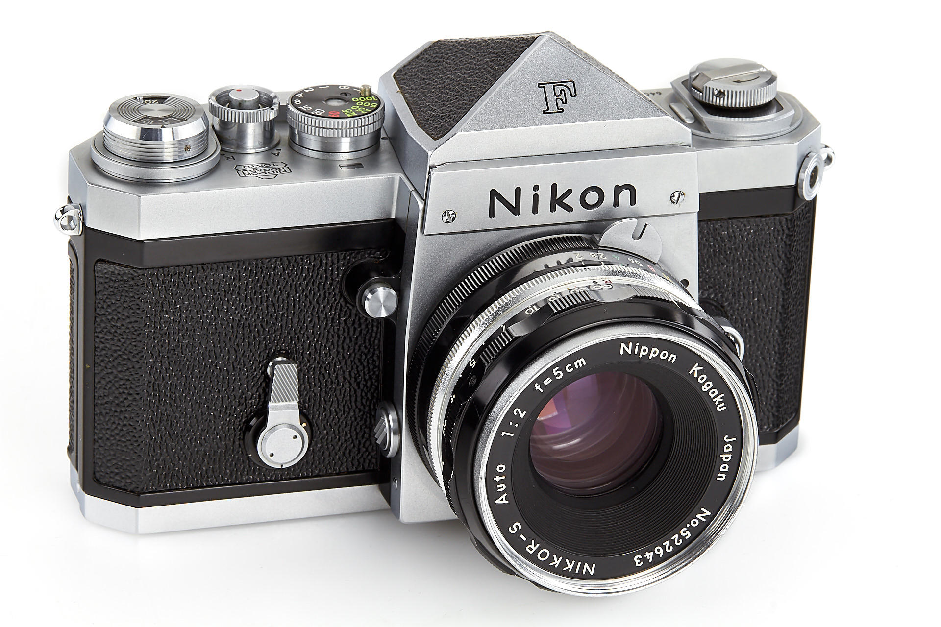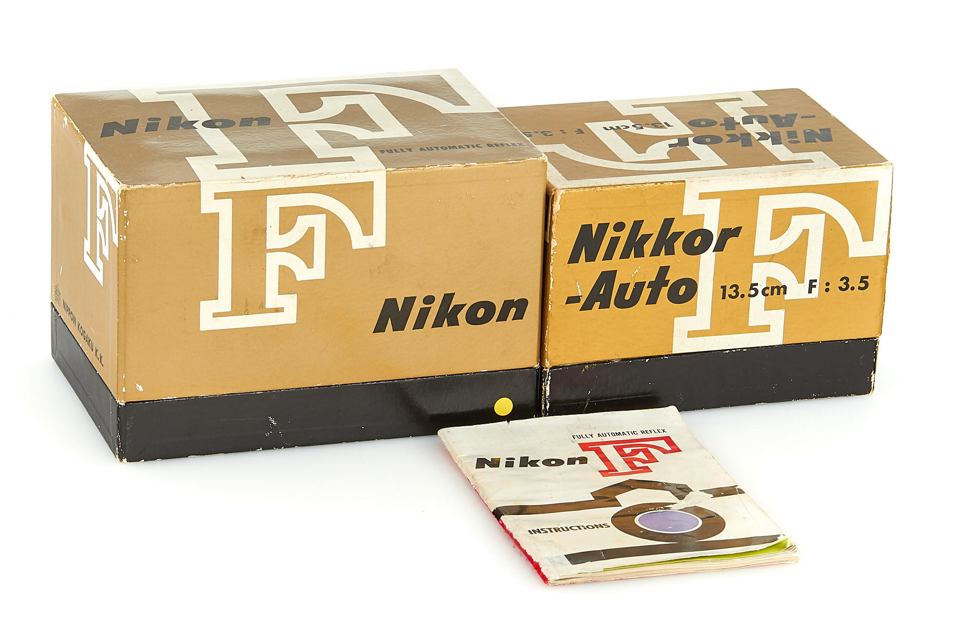 very early Nikon F, with prism finder engraved 'NKT', all original features and in beautiful, almost mint condition, with matching tick-mark Nikkor-S 2/5cm no.522643 (near mint, good optics, caps and hood), unnumbered maker's box for the camera, instructions, leather case, rare tick-mark Nikkor-P Auto 2.5/10.5cm no.120909 (near mint, good optics, hood, front cap, keeper), boxed near mint Nikkor-Q Auto 3.5/13.5cm no.722265 (front cap, hood, keeper)