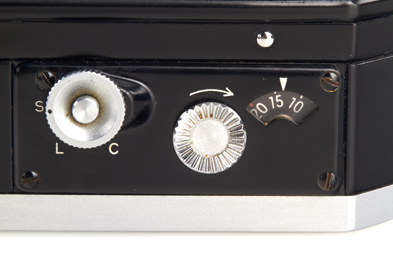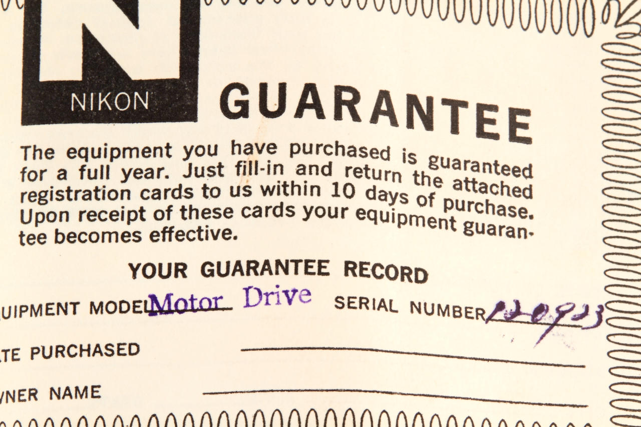 beautiful set including almost new Tokyo Motor Drive type 6, brown battery pack with strap and connecting cable, instructions, Guarantee card with matching number, rare with maker's box with matching serial number