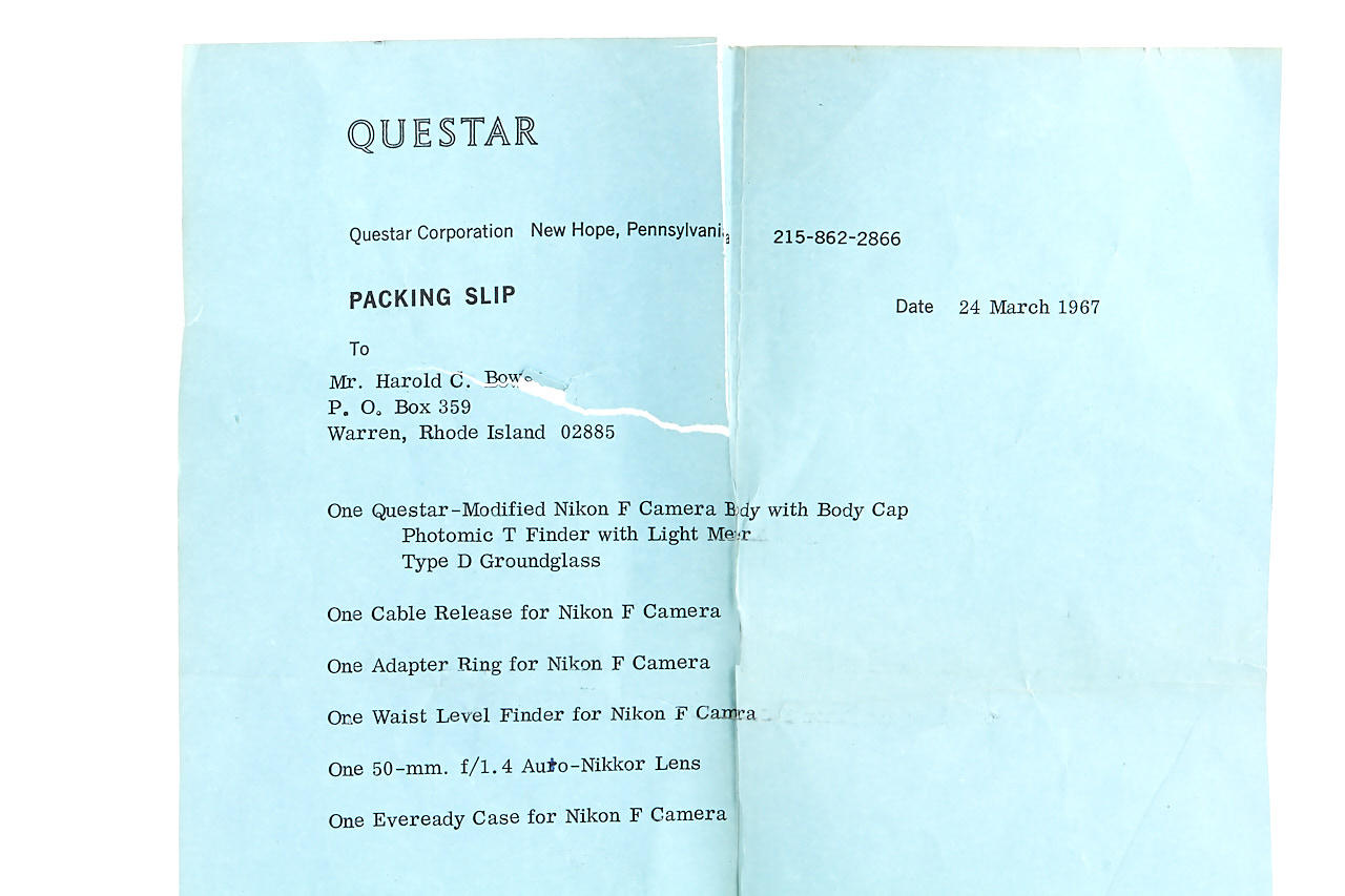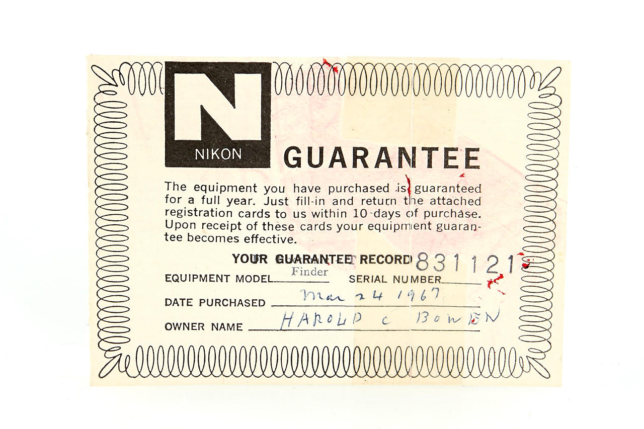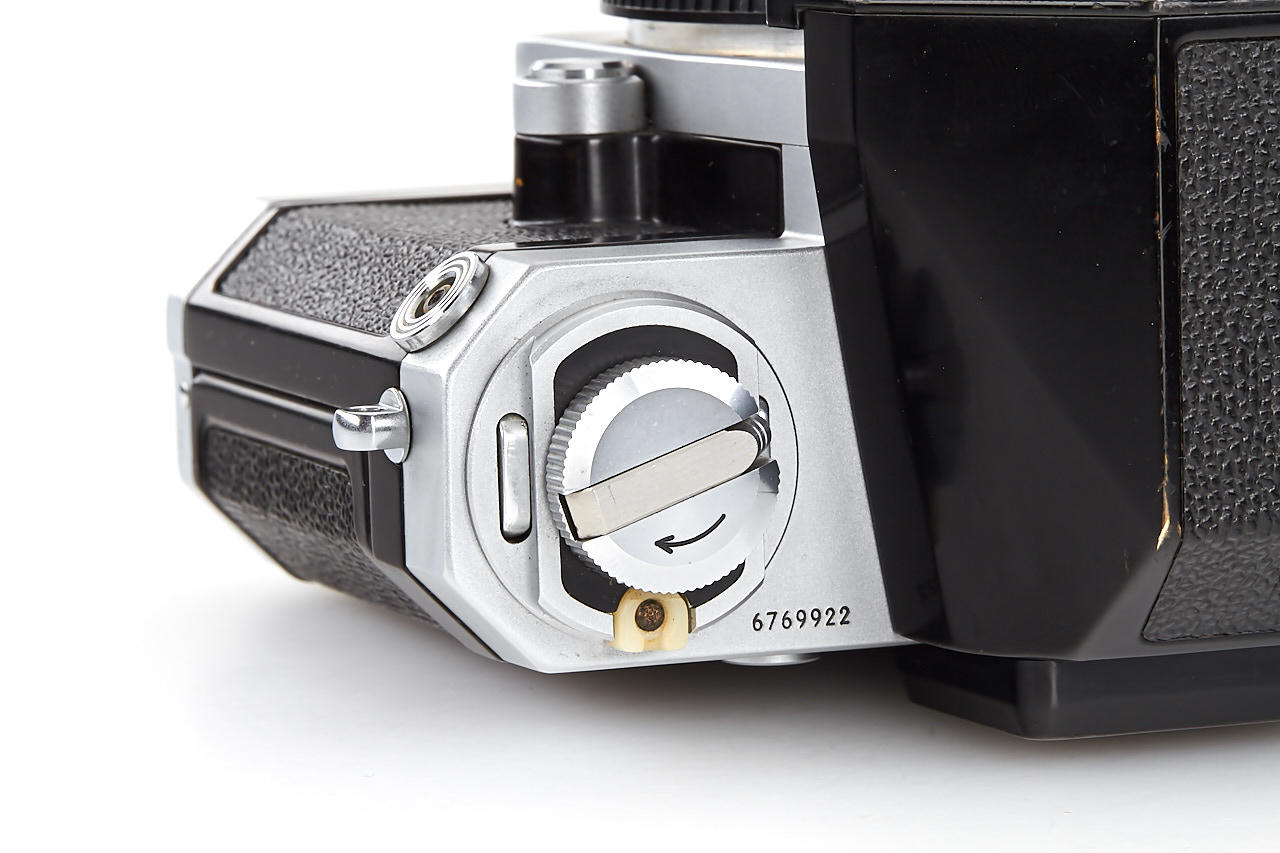 very rare and sought-after version of the Nikon F with mirror-up button, back at that time distributed by Questar, but according to Uli Koch, 'Nikon F - The Camera', p. 126, most likely factory modified, the modification has been found on bodies between no.6486777 and 7439745, in excellent condition, with Photomic T finder no.831121 (clean optics, cond. B+), guarantee card, packing list from Questar, body cap