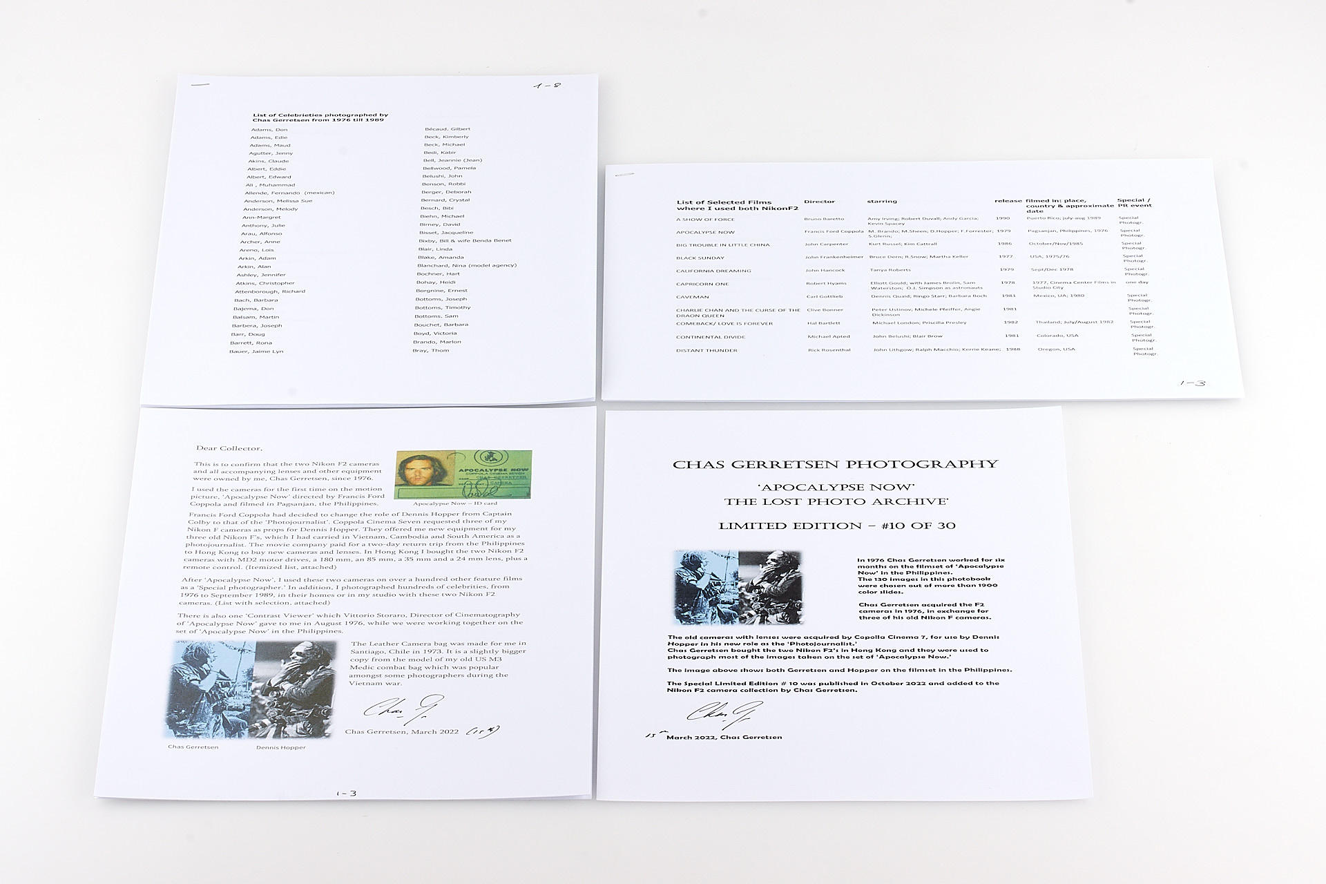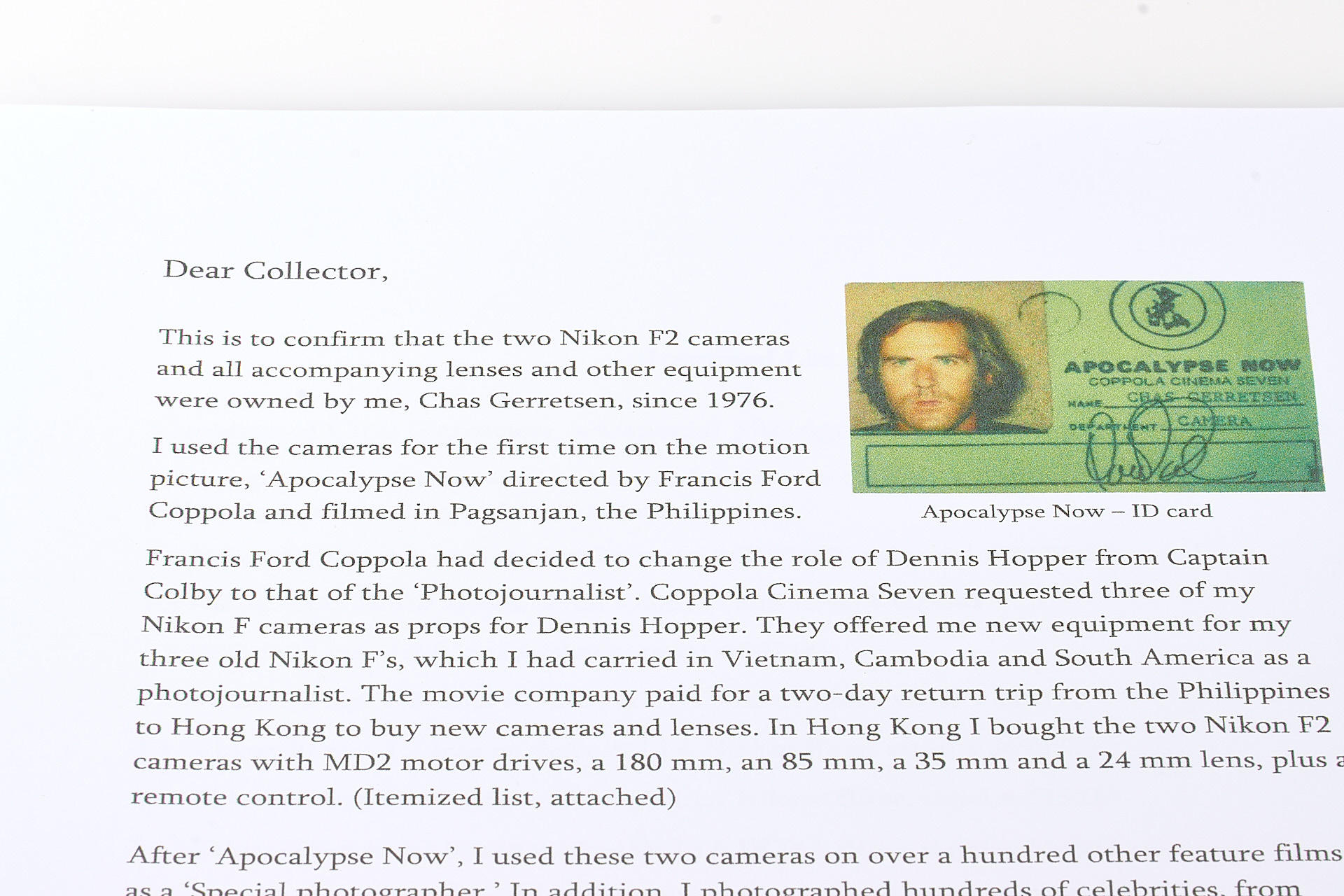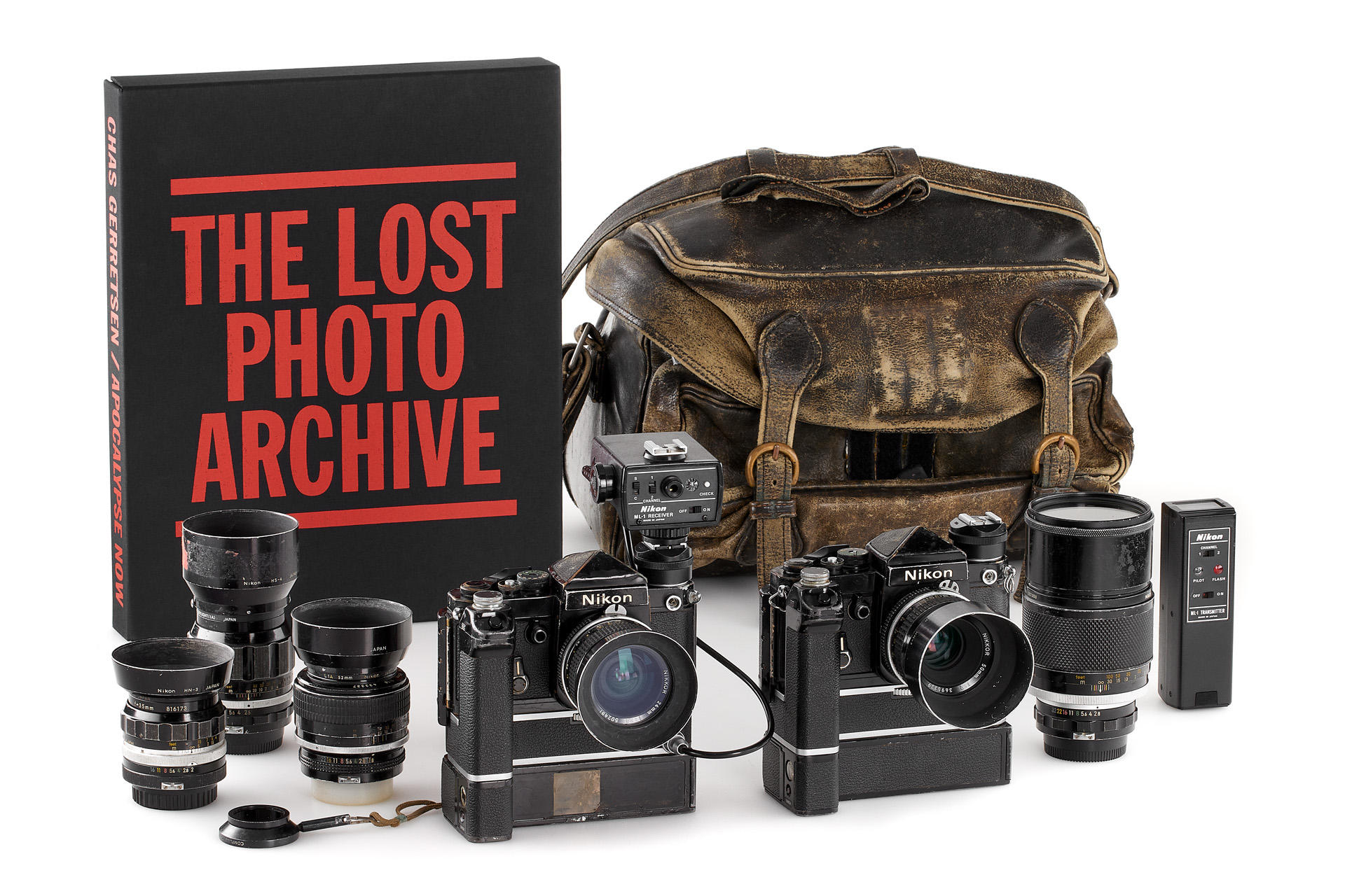 Chas Gerretsen was hired in 1976 by Francis Ford Coppola as the still photographer for his masterpiece Apocalypse Now. He acquired Nikon F2 cameras in exchange for three of his old Nikon F cameras. The old cameras with lenses were acquired by Coppola Cinema 7, for use by Dennis Hopper in his role as the 'Photojournalist'. Chas Gerretsen bought the two offered Nikon F2 cameras with lenses in Hong Kong and they were used to photograph most of the images taken on the set of 'Apocalypse Now'. Gerretsen used the cameras later on over a hundred feature films. The outfit includes two Nikon F2 bodies with MD2 motor drives, a 180mm, 105mm, 85mm, 50mm, 35mm and 24mm Nikkor lenses. The special leather camera bag was made for Gerretsen in Santiago, Chile in 1973 - it is a slightly bigger copy of a US M3 Medic combat bag, which was popular among photographers during the Vietnam war, and a contrast viewer given by Vittorio Storaro, the director of photography on 'Apocalypse Now'. Also included with this special set is a limited edition of the 'Apocalypse Now - The Lost Photo Archive' by Gerretsen with a special edition number #10 of 30, including three signed prints, as well as a provenance letter and a personal note from Gerretsen to the future owner of this special outfit.