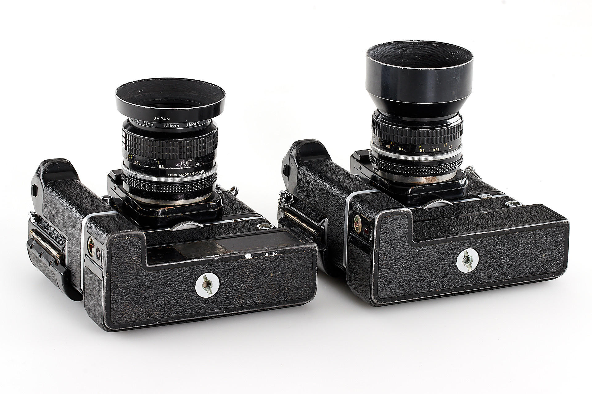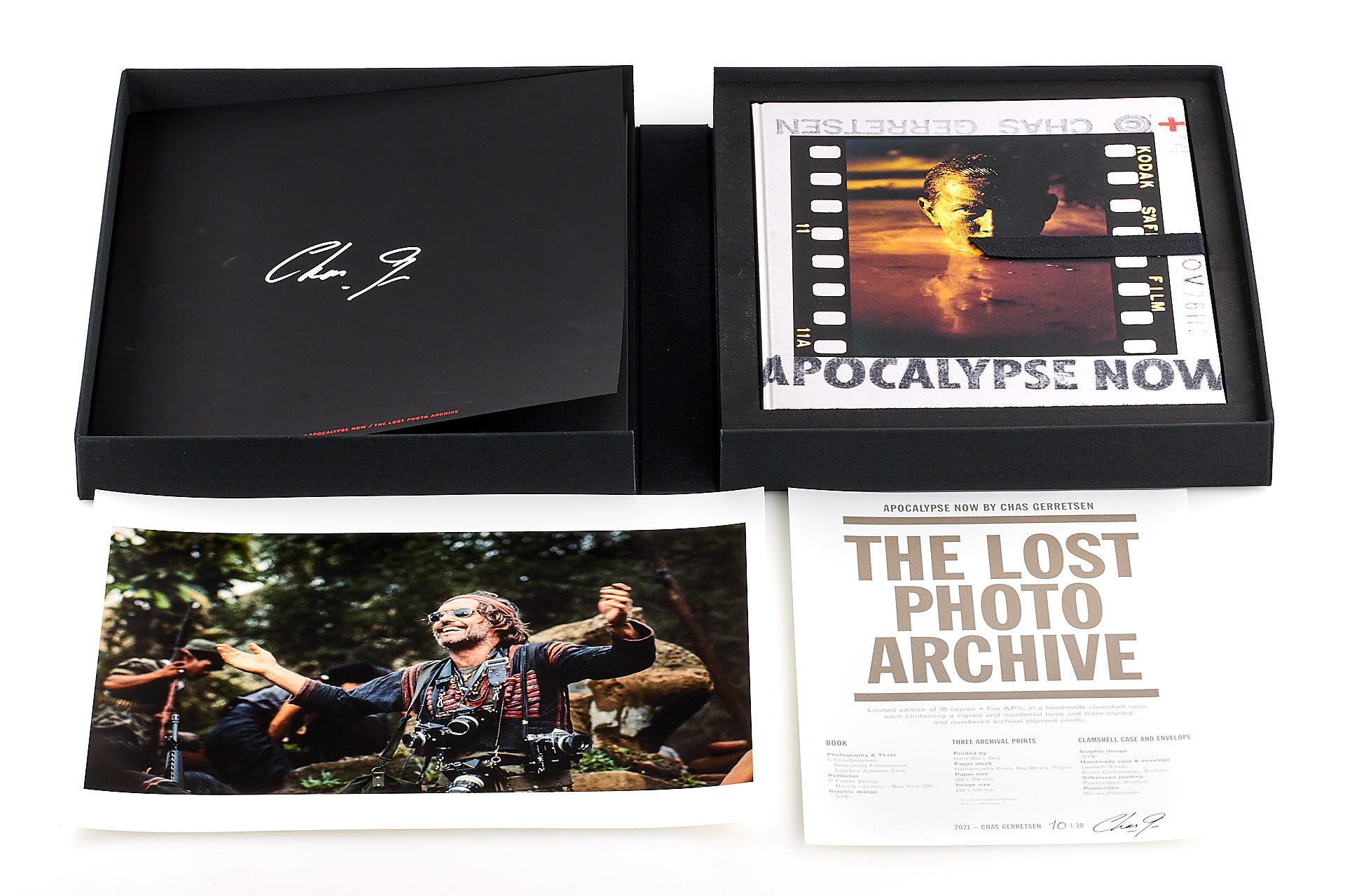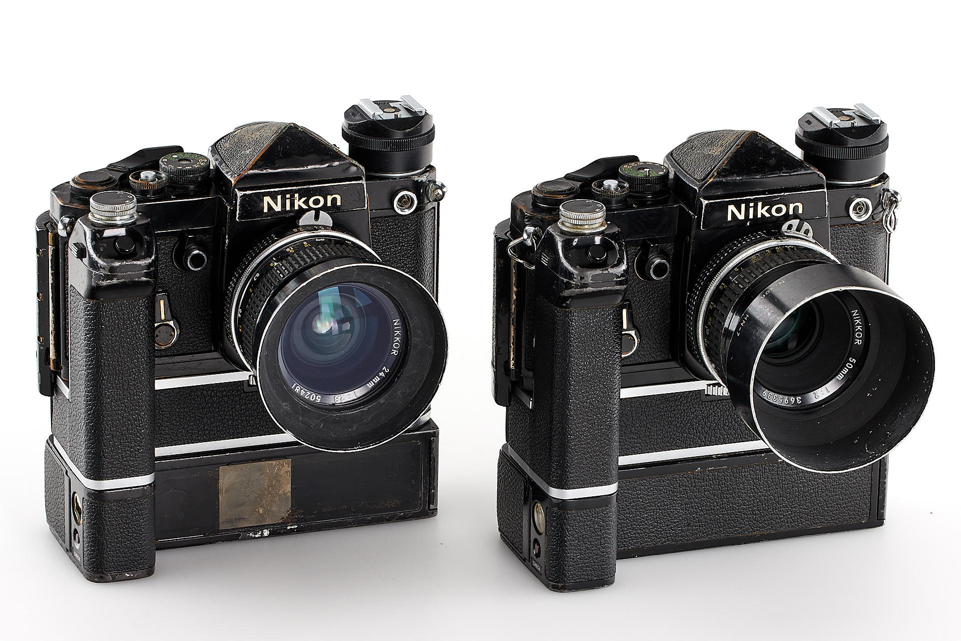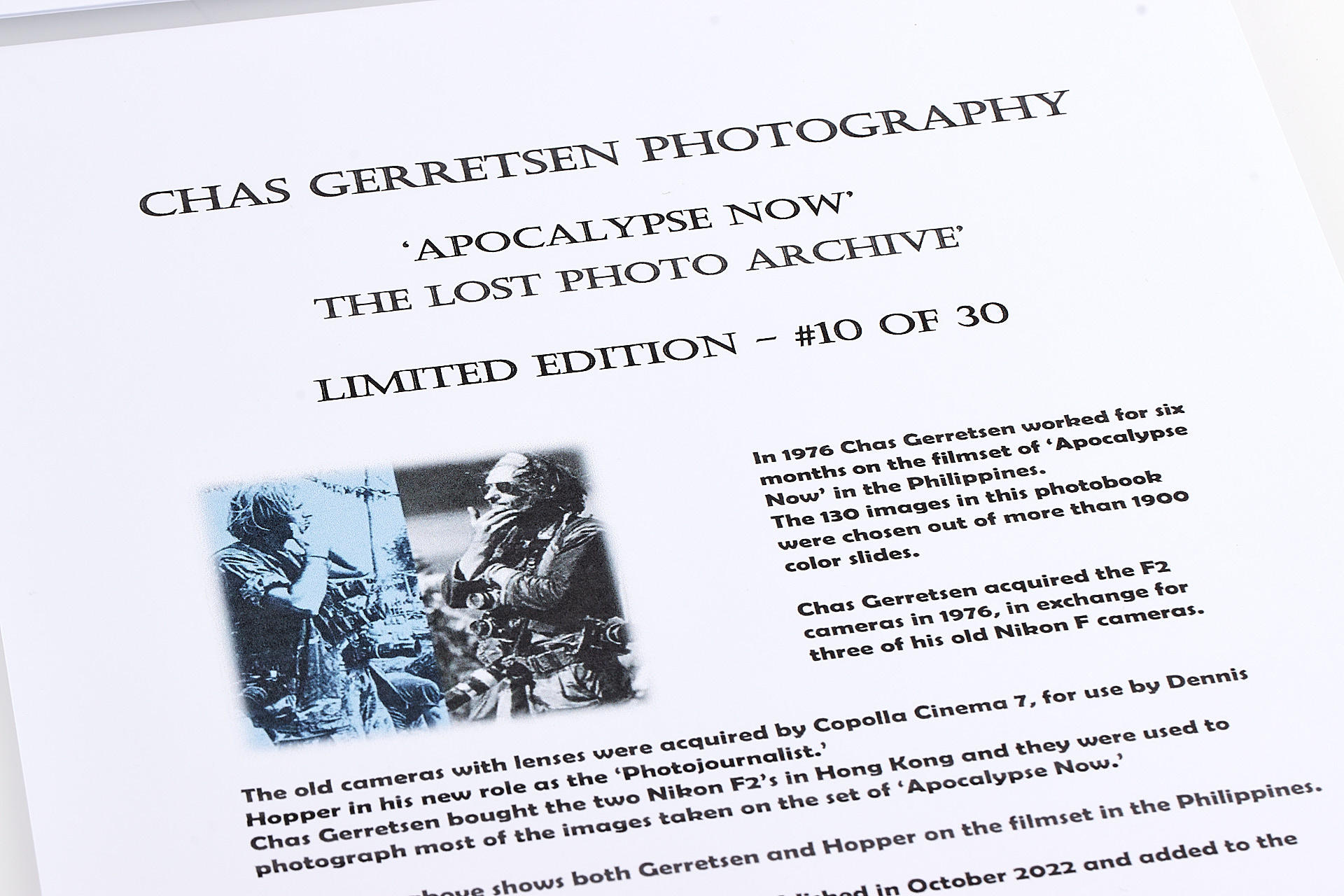 Chas Gerretsen was hired in 1976 by Francis Ford Coppola as the still photographer for his masterpiece Apocalypse Now. He acquired Nikon F2 cameras in exchange for three of his old Nikon F cameras. The old cameras with lenses were acquired by Coppola Cinema 7, for use by Dennis Hopper in his role as the 'Photojournalist'. Chas Gerretsen bought the two offered Nikon F2 cameras with lenses in Hong Kong and they were used to photograph most of the images taken on the set of 'Apocalypse Now'. Gerretsen used the cameras later on over a hundred feature films. The outfit includes two Nikon F2 bodies with MD2 motor drives, a 180mm, 105mm, 85mm, 50mm, 35mm and 24mm Nikkor lenses. The special leather camera bag was made for Gerretsen in Santiago, Chile in 1973 - it is a slightly bigger copy of a US M3 Medic combat bag, which was popular among photographers during the Vietnam war, and a contrast viewer given by Vittorio Storaro, the director of photography on 'Apocalypse Now'. Also included with this special set is a limited edition of the 'Apocalypse Now - The Lost Photo Archive' by Gerretsen with a special edition number #10 of 30, including three signed prints, as well as a provenance letter and a personal note from Gerretsen to the future owner of this special outfit.