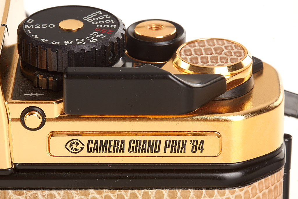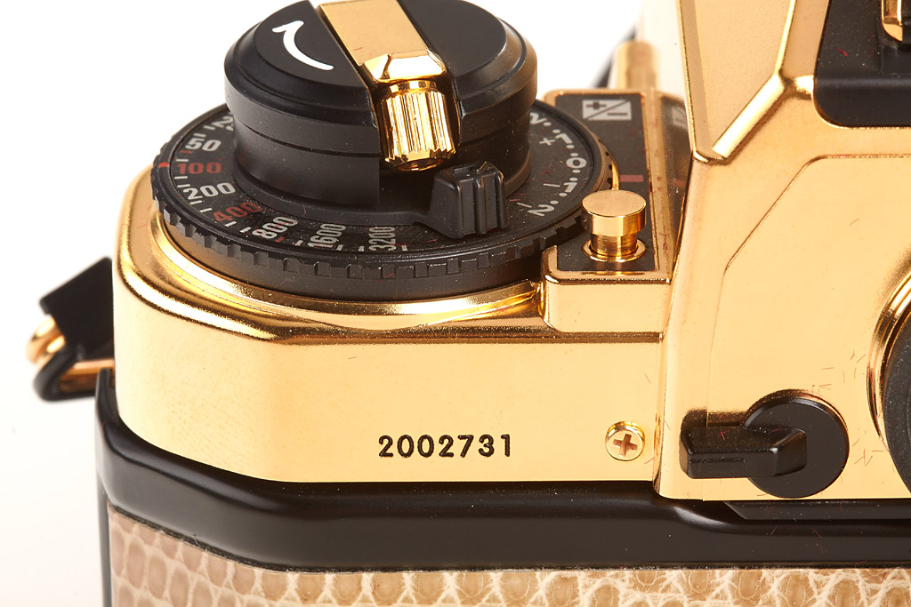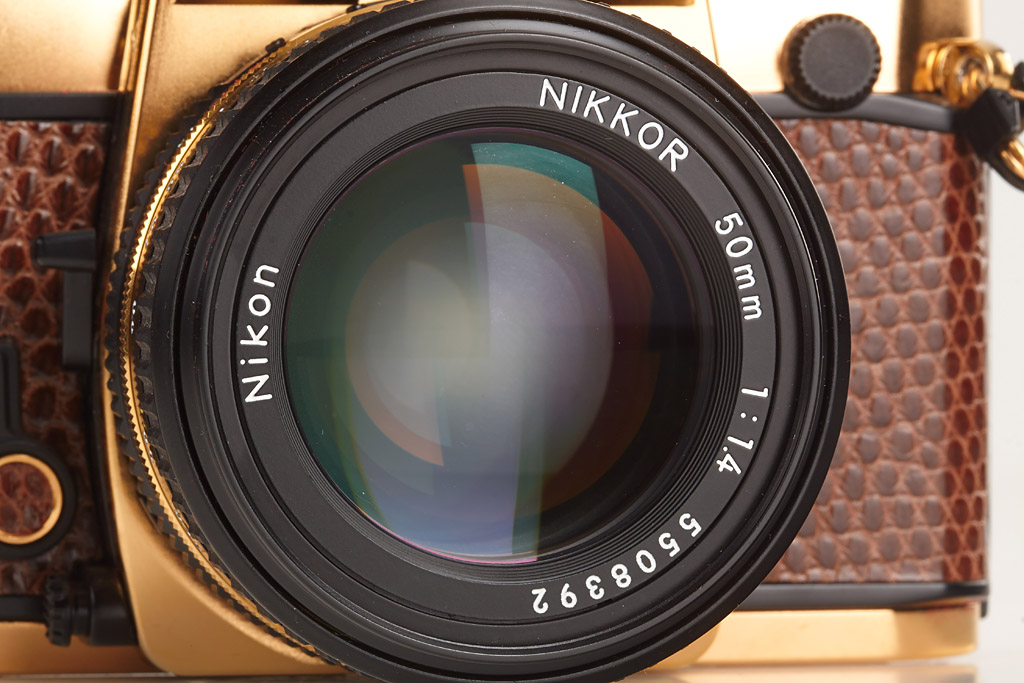 gold edition of 500 cameras, gold plated Nikkor 1.4/50mm no.5508392 (cap), papers, wooden presentation box, maker's box