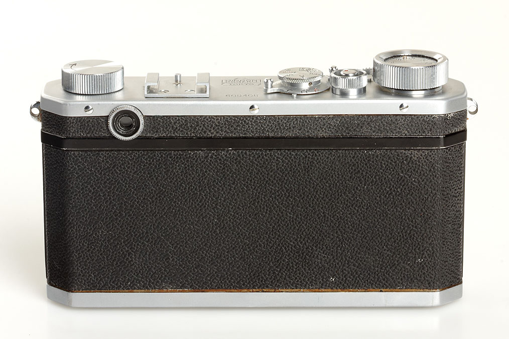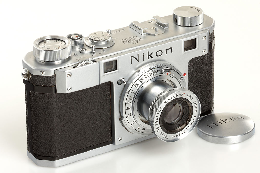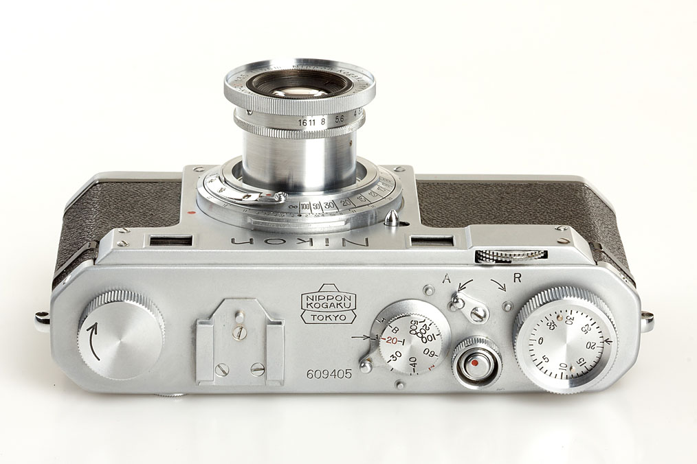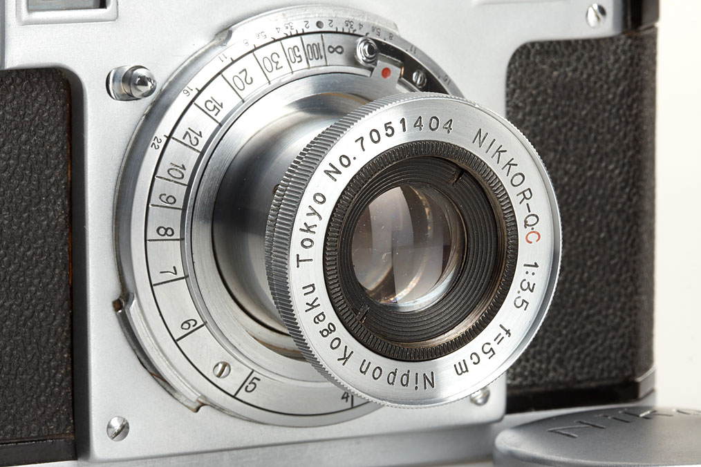 first model Nikon in close to mint original condition, version with 4 polished film guide rails, original shutter (in perfect working order), non-removable take-up spool, original back door with same number, base plate engraved 'MADE IN OCCUPIED JAPAN', matching and very rare collapsible Tokyo Nikkor-Q.C 3.5/5cm no.7051404, rare chrome cap, original ever-ready case, original instruction book, blue velvet maker's box