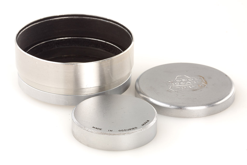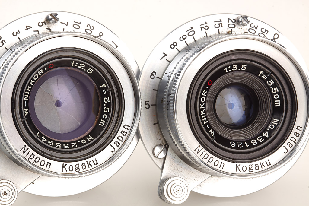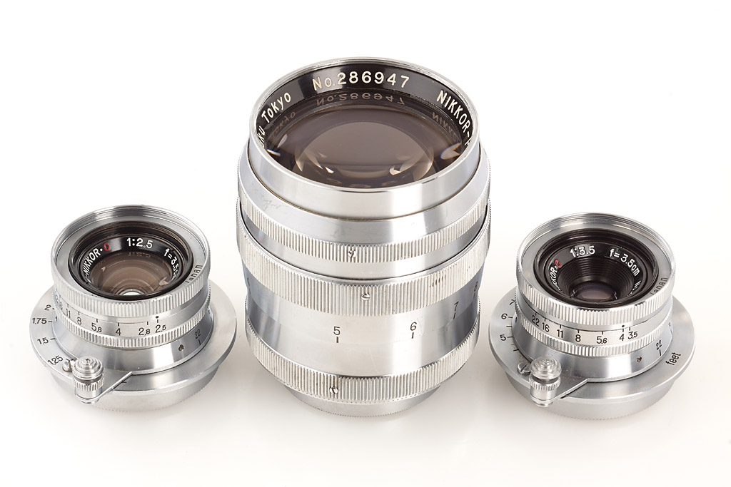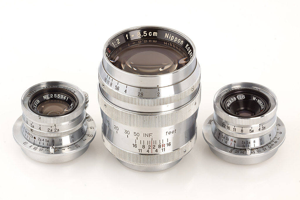 three M39 RF coupled lenses in good condition, (1) mint hrome W-Nikkor-C 2.5/3.5cm no.255941 (clean lenses, caps, keeper), (2) mint chrome W-Nikkor-C 3.5/3.5cm no.438126 (clean lenses, caps), (3) chrome Tokyo Nikkor-P.C 2/8.5cm no.286947 (cleaning marks, hood, caps, keeper) with matching finder (in keeper) (3)