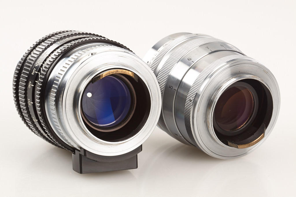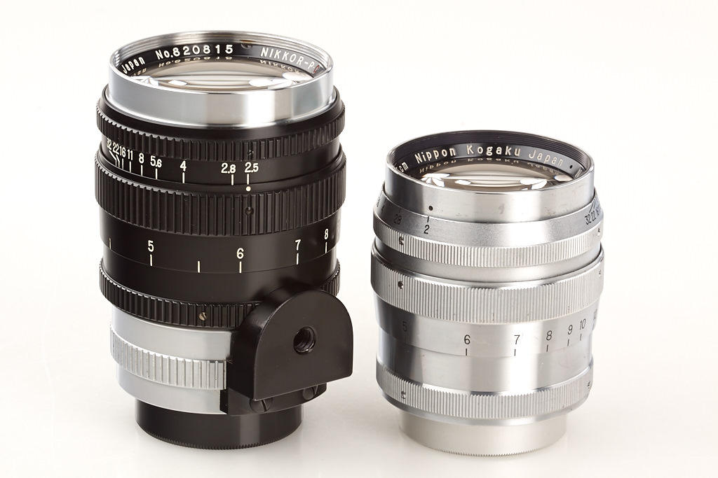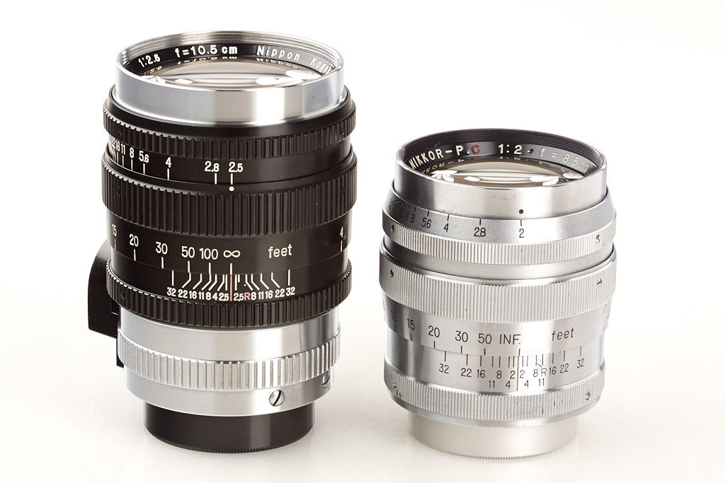both for M39 screw mount, (1) chrome Nikkor-P.C 2/8.5cm no.401753 (a few cleaning marks, hood, caps), (2) black/chrome Nikkor-P.C 2.5/10.5cm no.820815 (clean lenses, hood, caps) (2)