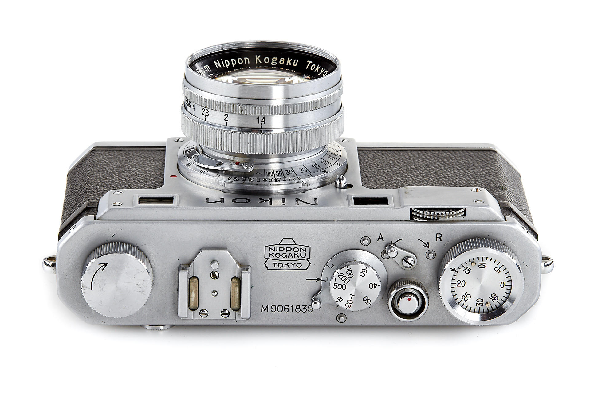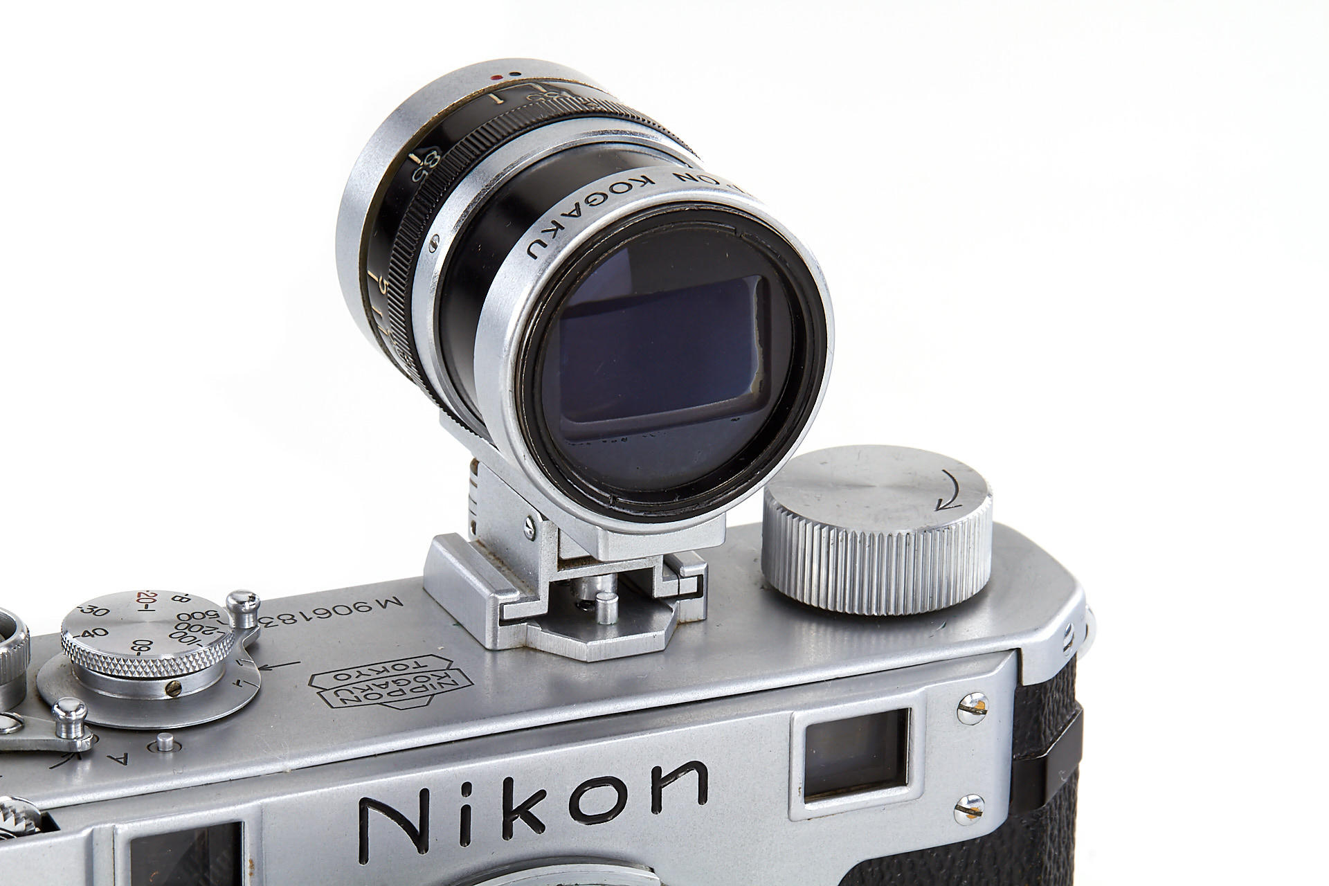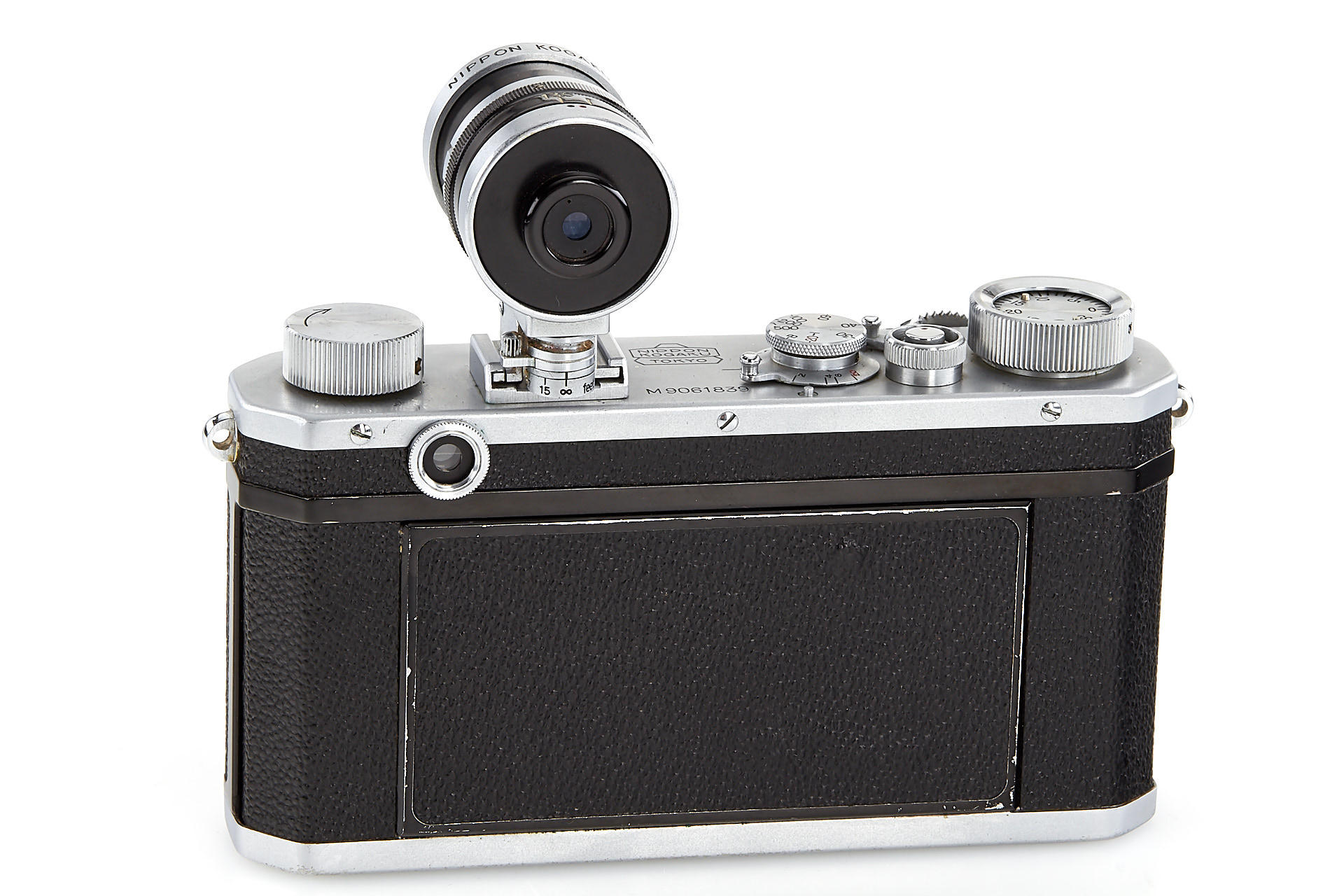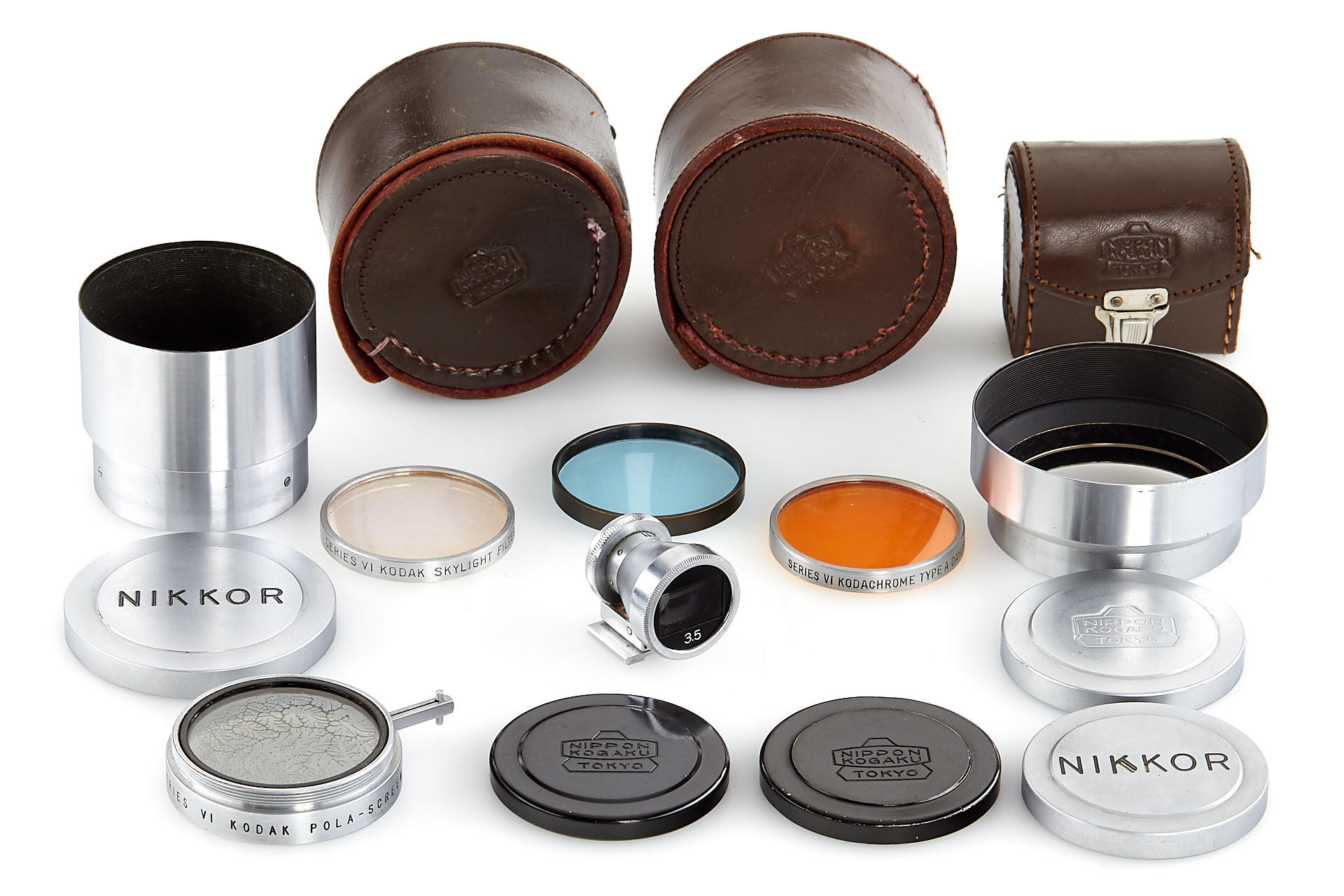 Extremely rare variation of the early Nikon M (without sync. post), with serial number '906xxxx' instead of the correct '609xxxx'; in very good condition, matching serial number inside of the back, with Nikkor-S.C 1.4/5cm no.50051755 (both caps), W-Nikkor.C 3.5/2.8cm no.713740 (both caps), W-Nikkor.C 3.5/3.5cm no.426284 (finder, caps), Nikkor-P.C 2/8.5cm no.80159 (hood, matching caps), Nikkor-Q.C 4/13.5cm no.611127 (hood, matching caps), universal finder, instructions, leather outfit case, everything in very fine to near mint condition. Reportedly only around 125 cameras were erroneously miss-engraved with the '906' number, which makes this example one of the most rare Nikon RF variations.