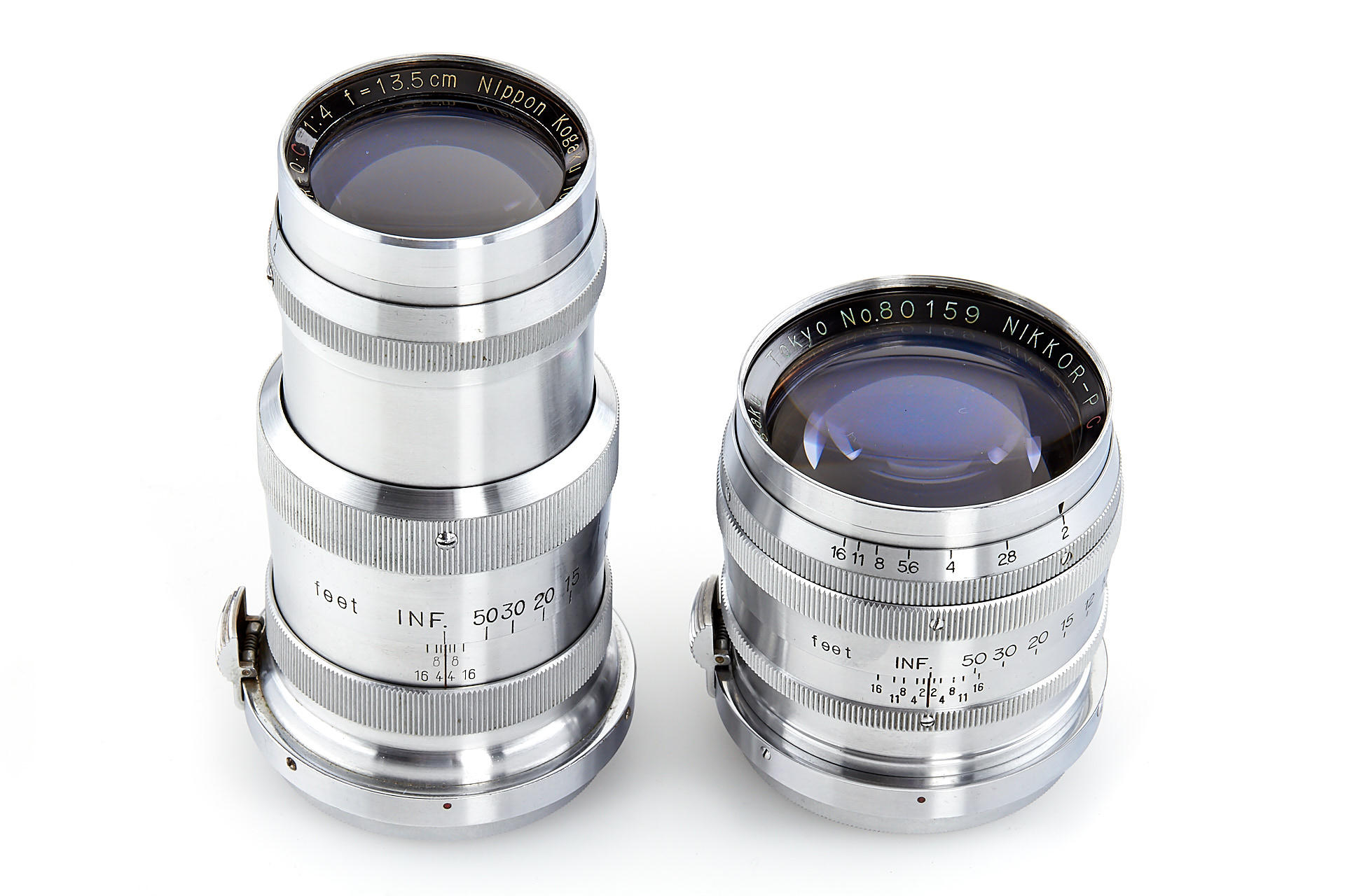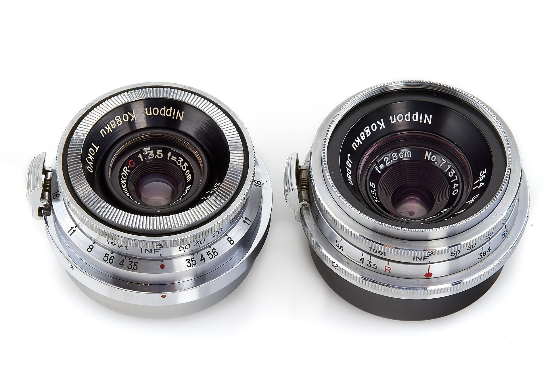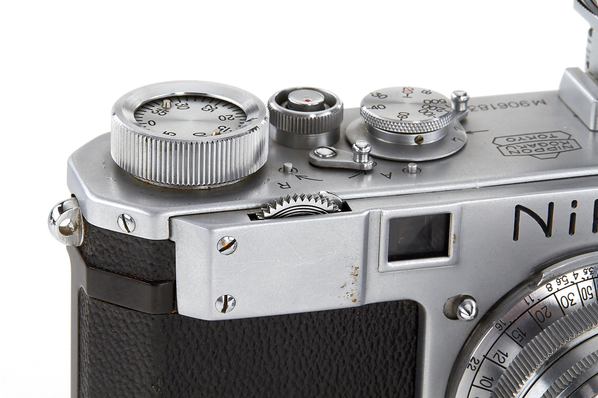 Extremely rare variation of the early Nikon M (without sync. post), with serial number '906xxxx' instead of the correct '609xxxx'; in very good condition, matching serial number inside of the back, with Nikkor-S.C 1.4/5cm no.50051755 (both caps), W-Nikkor.C 3.5/2.8cm no.713740 (both caps), W-Nikkor.C 3.5/3.5cm no.426284 (finder, caps), Nikkor-P.C 2/8.5cm no.80159 (hood, matching caps), Nikkor-Q.C 4/13.5cm no.611127 (hood, matching caps), universal finder, instructions, leather outfit case, everything in very fine to near mint condition. Reportedly only around 125 cameras were erroneously miss-engraved with the '906' number, which makes this example one of the most rare Nikon RF variations.