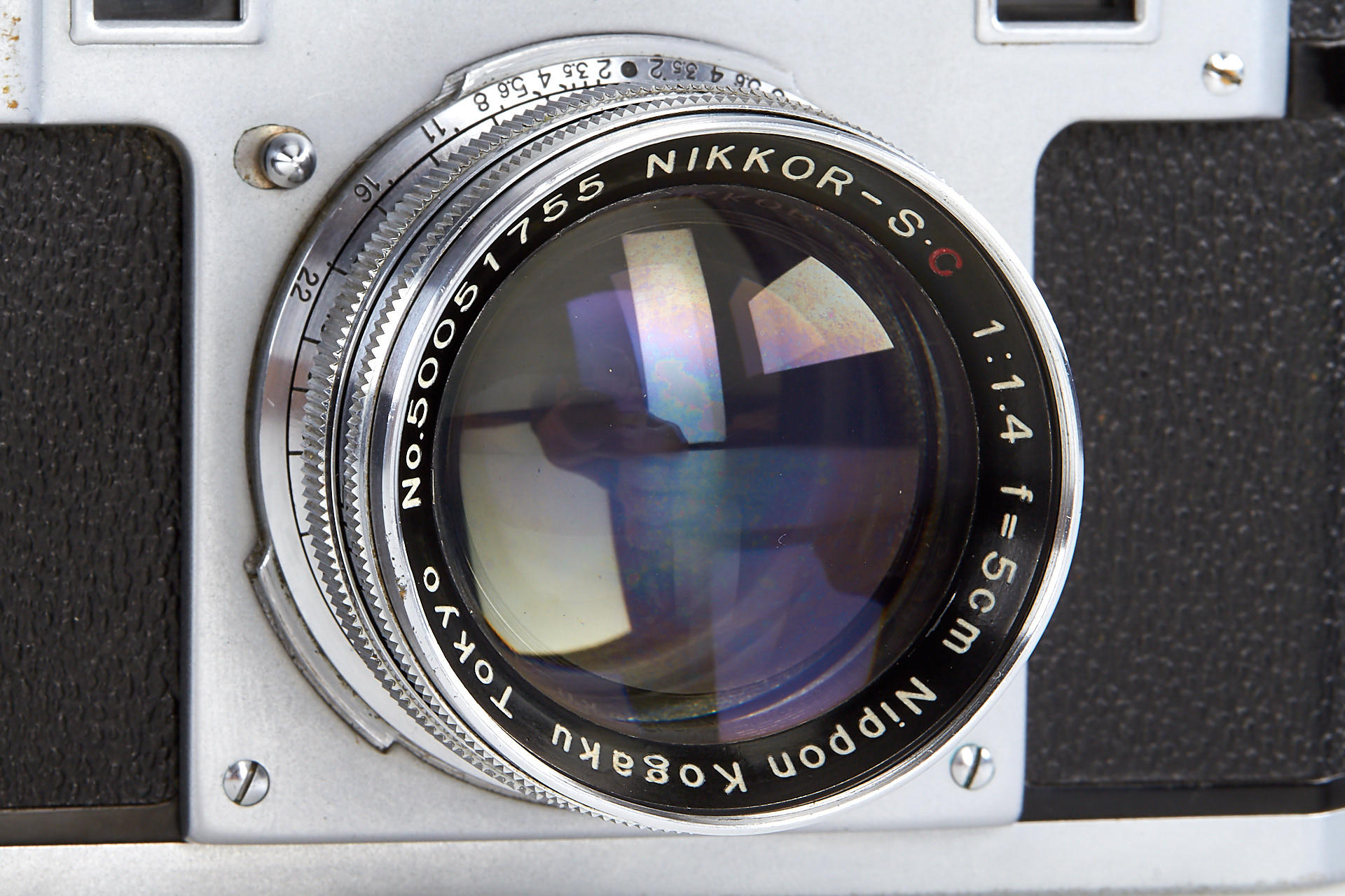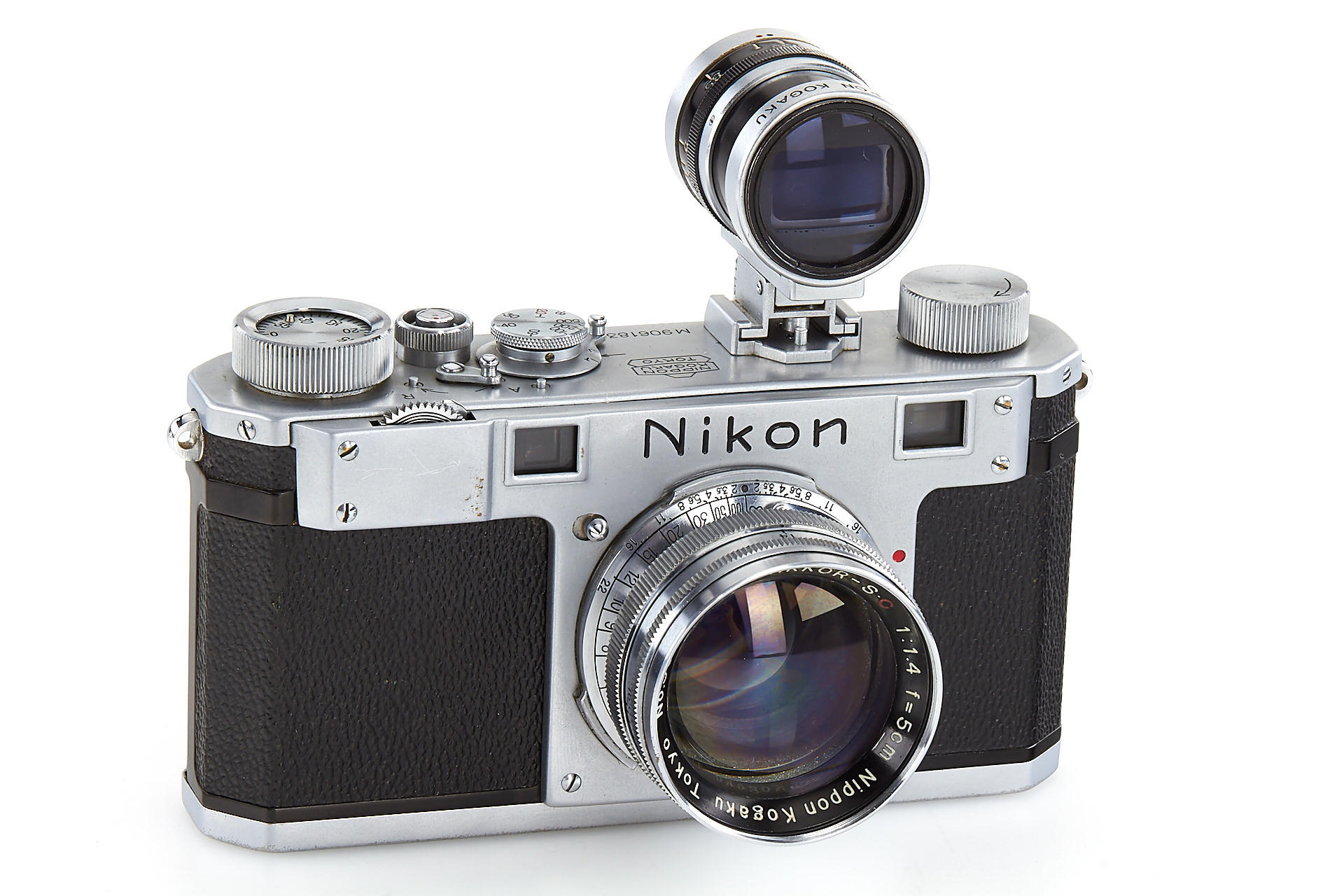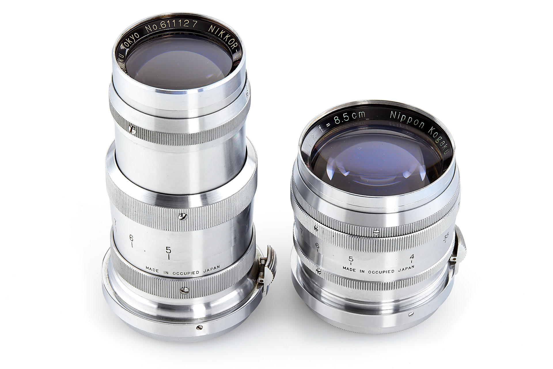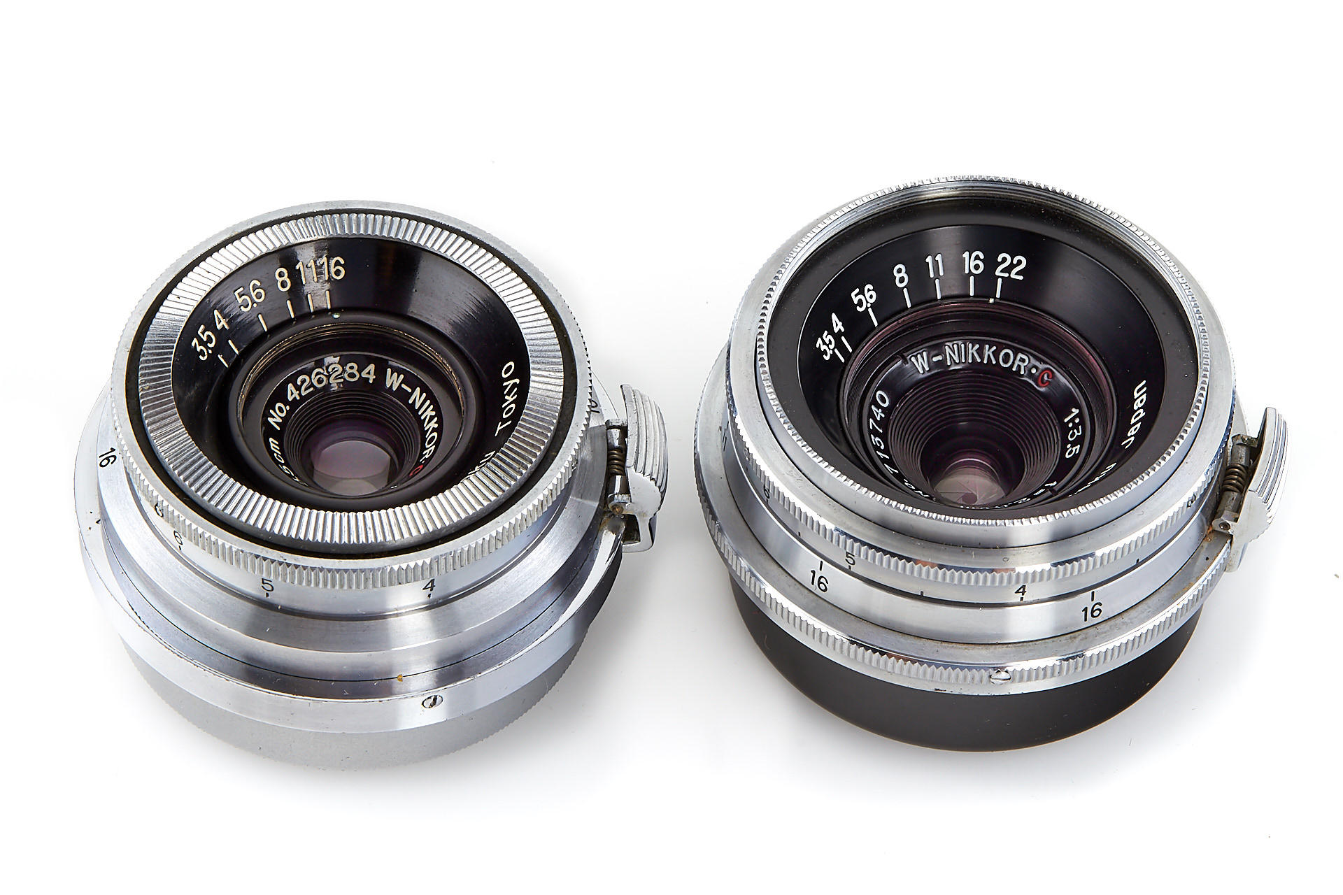 Extremely rare variation of the early Nikon M (without sync. post), with serial number '906xxxx' instead of the correct '609xxxx'; in very good condition, matching serial number inside of the back, with Nikkor-S.C 1.4/5cm no.50051755 (both caps), W-Nikkor.C 3.5/2.8cm no.713740 (both caps), W-Nikkor.C 3.5/3.5cm no.426284 (finder, caps), Nikkor-P.C 2/8.5cm no.80159 (hood, matching caps), Nikkor-Q.C 4/13.5cm no.611127 (hood, matching caps), universal finder, instructions, leather outfit case, everything in very fine to near mint condition. Reportedly only around 125 cameras were erroneously miss-engraved with the '906' number, which makes this example one of the most rare Nikon RF variations.