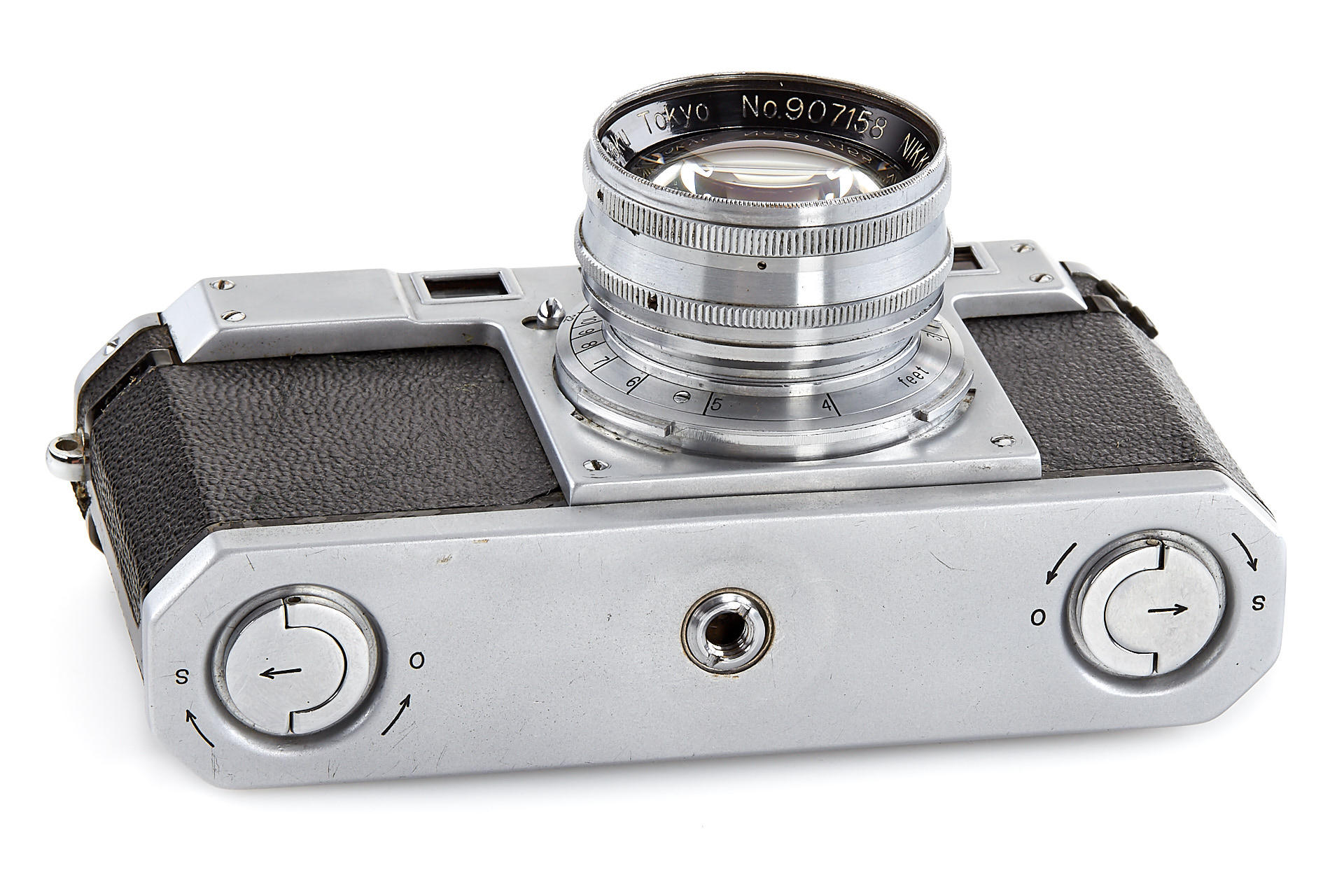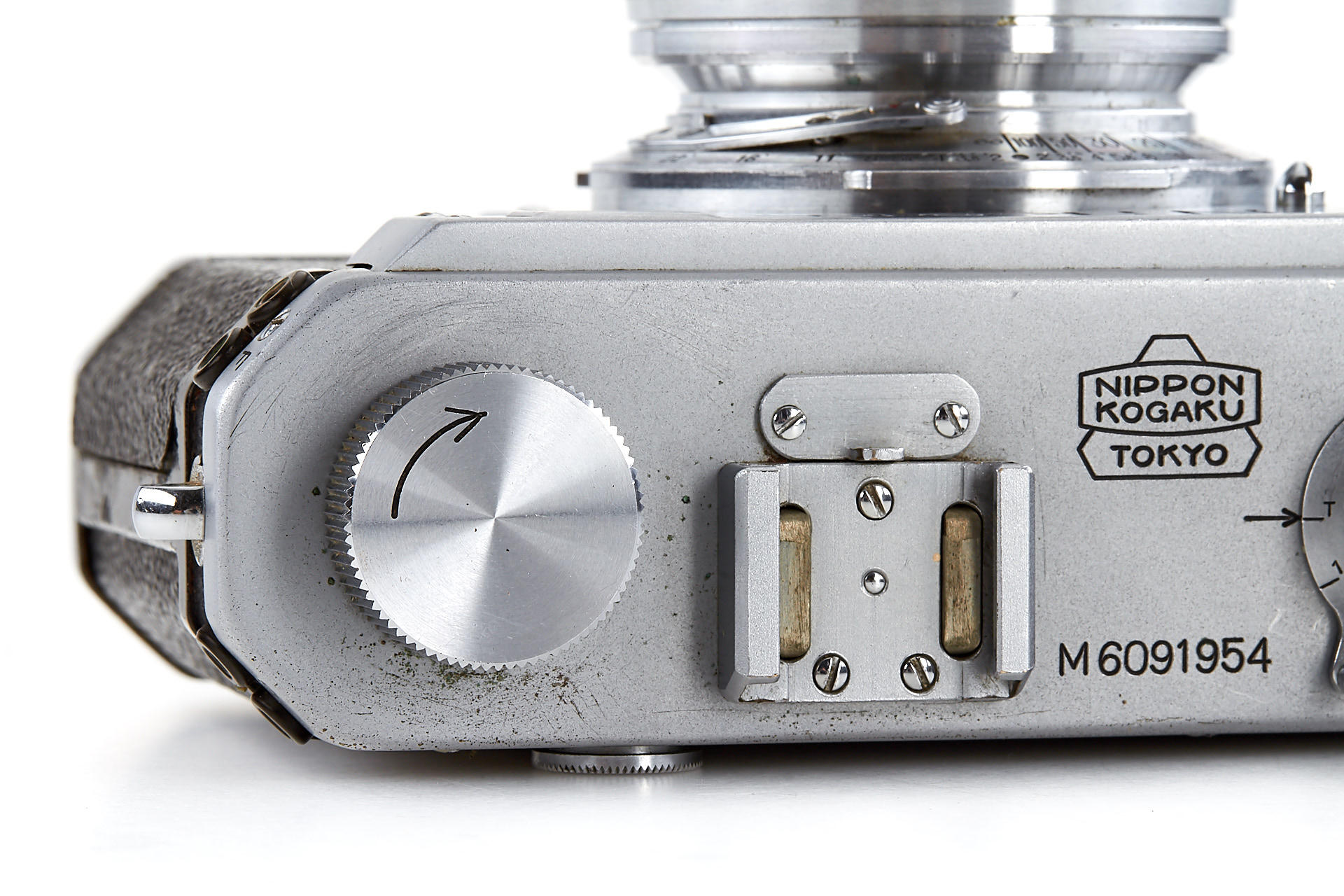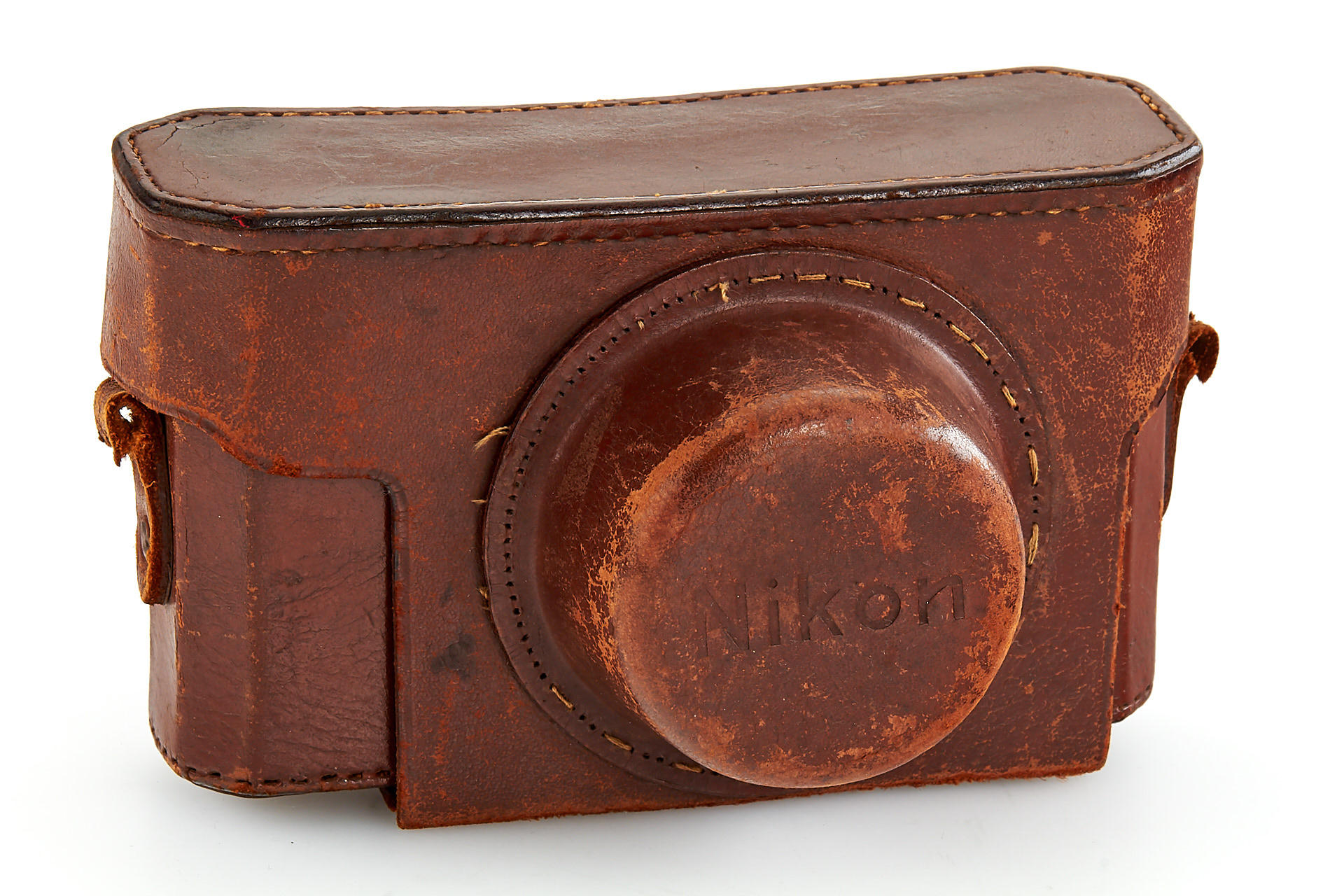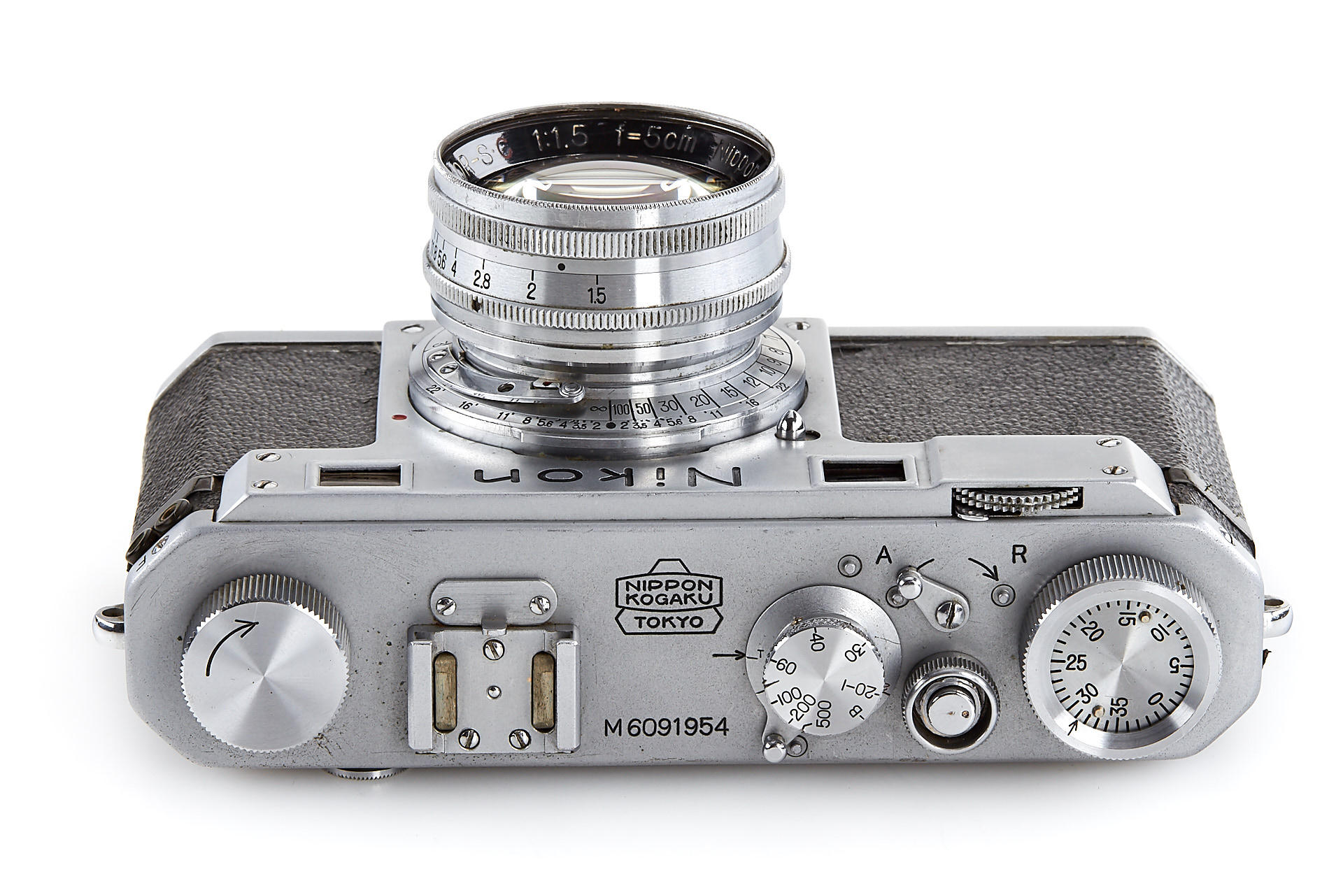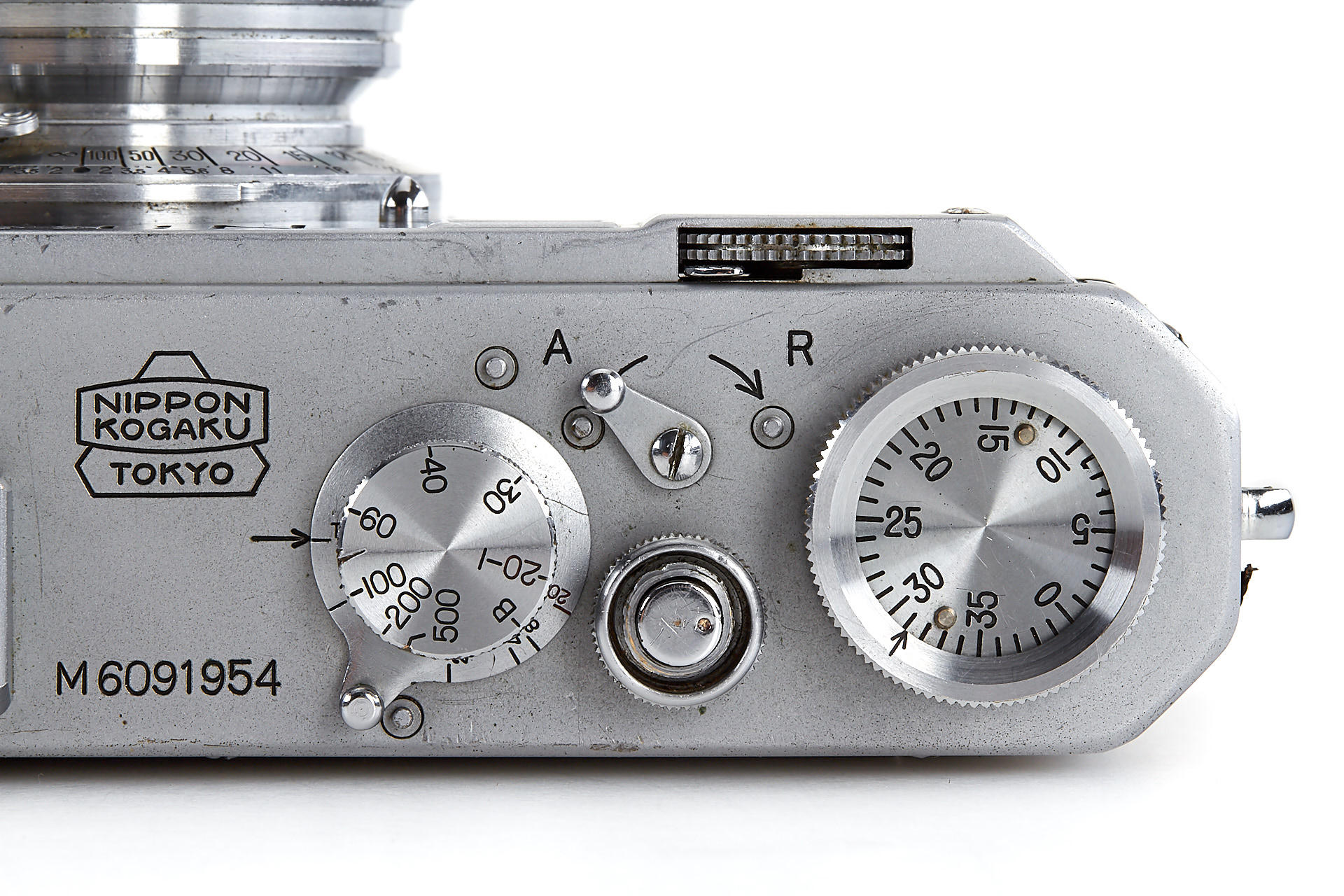 in very fine condition, with later factory added black synch. plugs - M6091948 and M6091975 are unsynched - just a few made with 2-piece accessory shoe, back inside engraved '6091954', one of the first bodies with the 'MIOJ' engraving moved as an imprint into the leather on the lower left side of the back, with very rare and early matching Nikkor-S.C. 1.5/5cm no.907158, only 389 made in Nikon mount, from a total of 797 lenses (clear optics with just a few marks), camera in good working order, with maker's original brown leather ever-ready case, the back stamped 'Made In Occupied Japan'