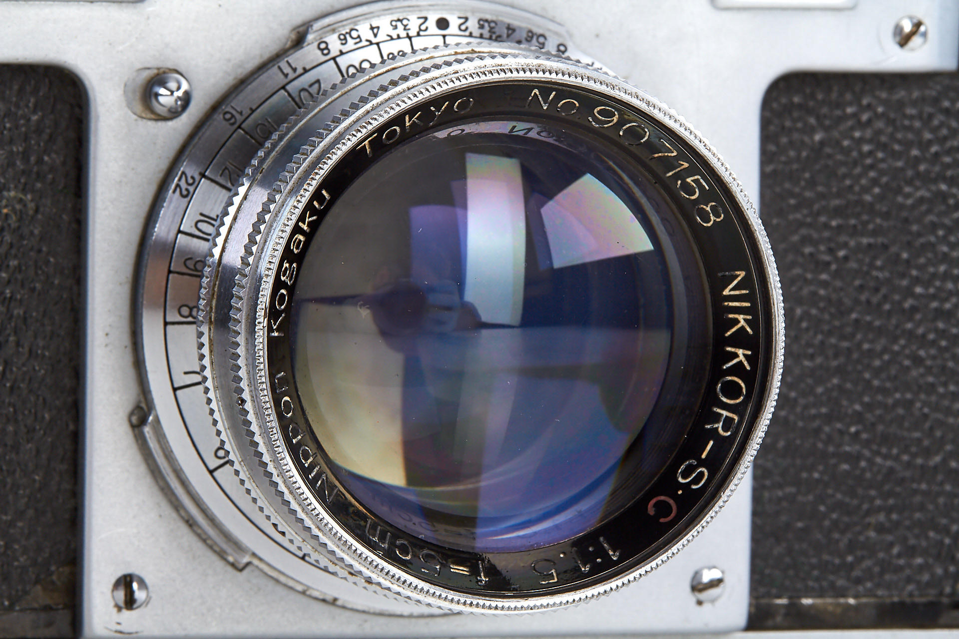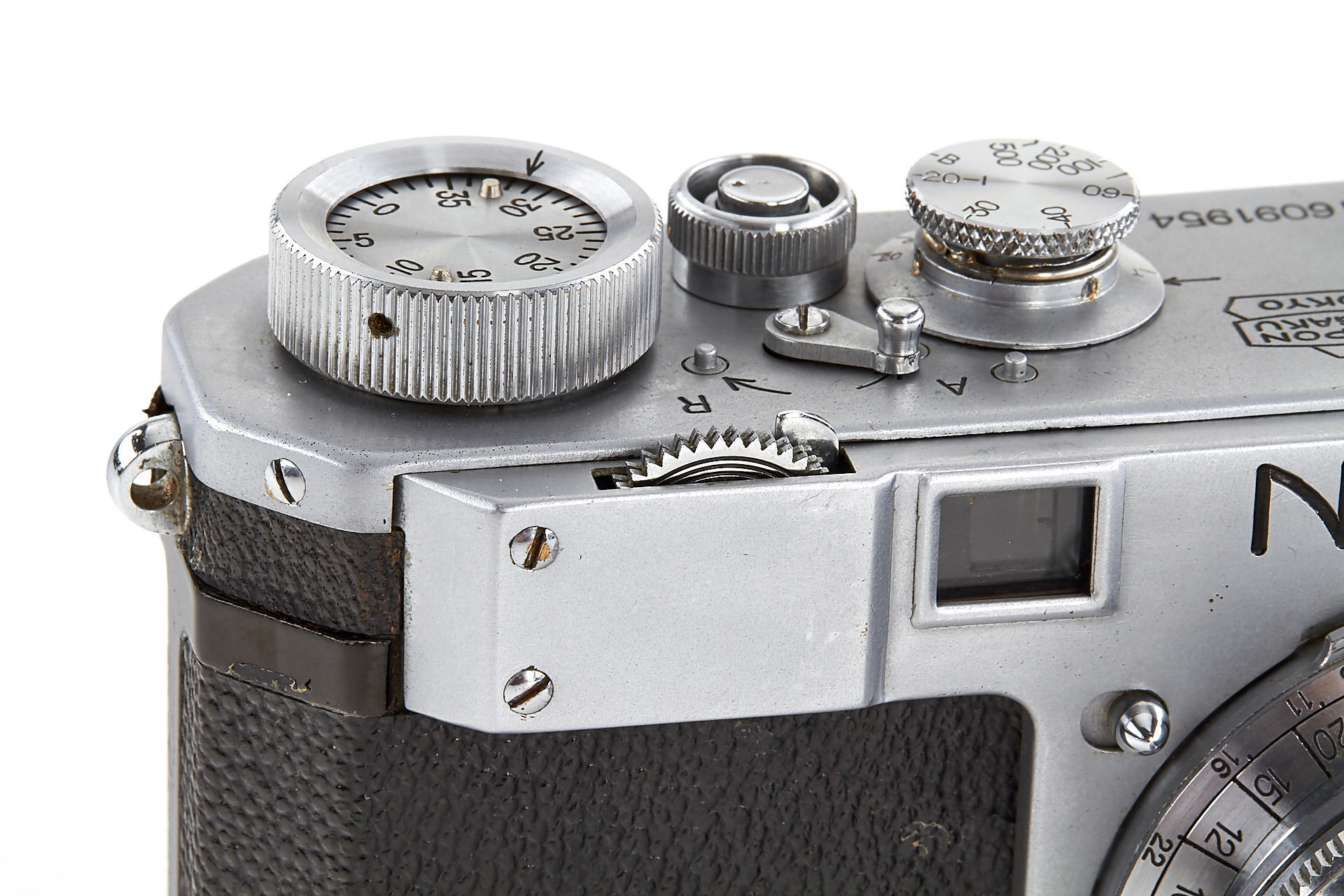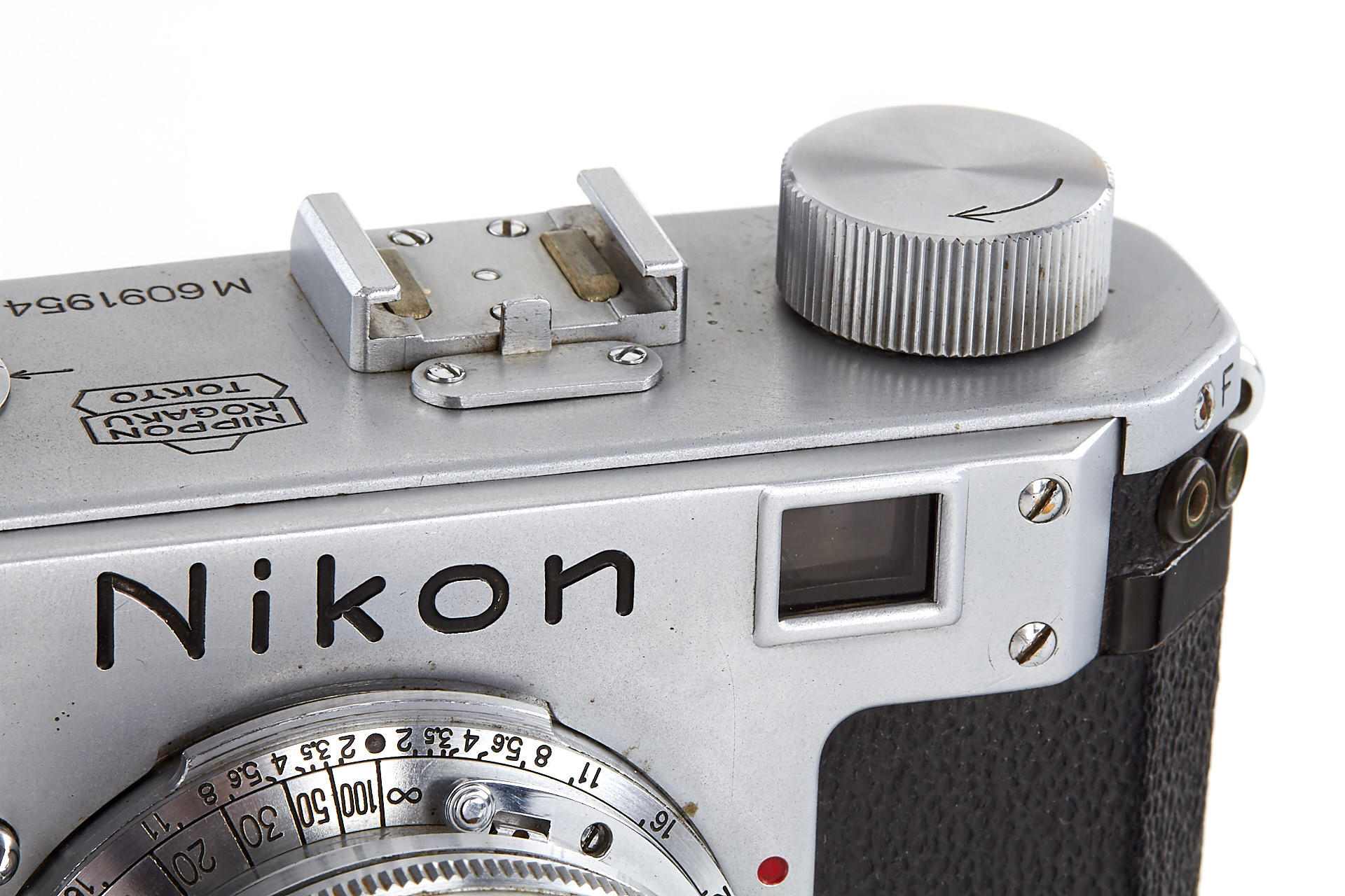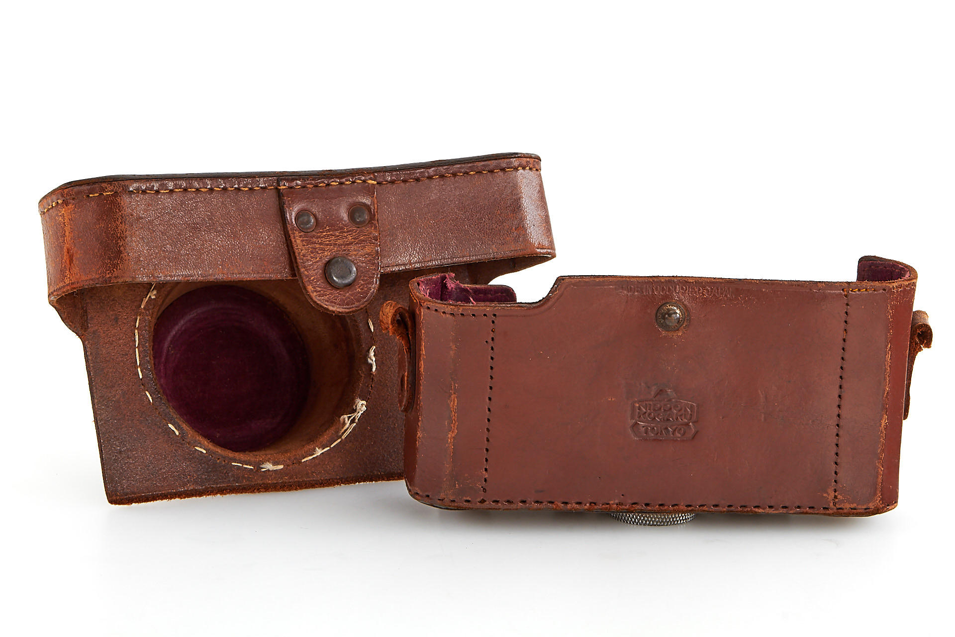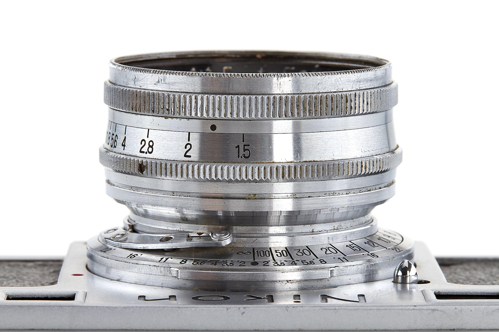 in very fine condition, with later factory added black synch. plugs - M6091948 and M6091975 are unsynched - just a few made with 2-piece accessory shoe, back inside engraved '6091954', one of the first bodies with the 'MIOJ' engraving moved as an imprint into the leather on the lower left side of the back, with very rare and early matching Nikkor-S.C. 1.5/5cm no.907158, only 389 made in Nikon mount, from a total of 797 lenses (clear optics with just a few marks), camera in good working order, with maker's original brown leather ever-ready case, the back stamped 'Made In Occupied Japan'