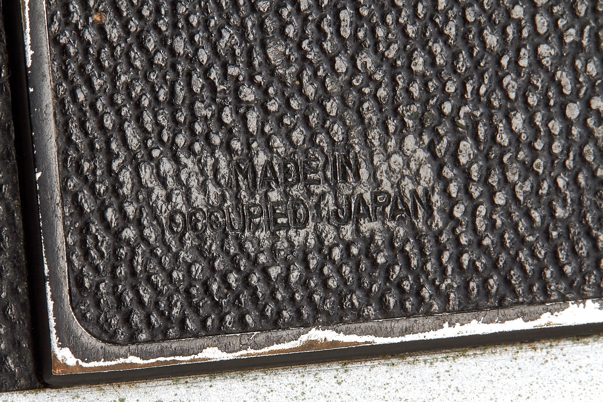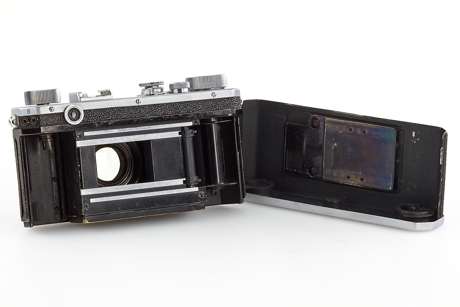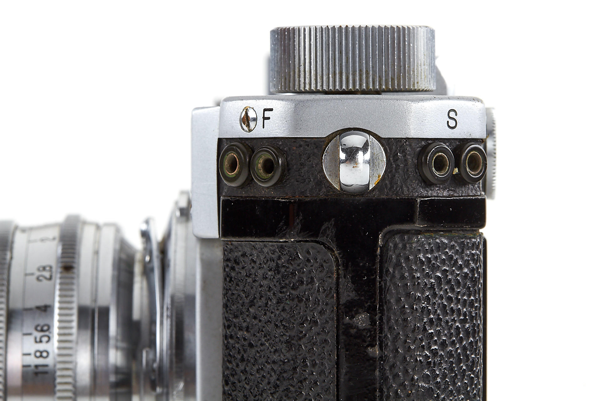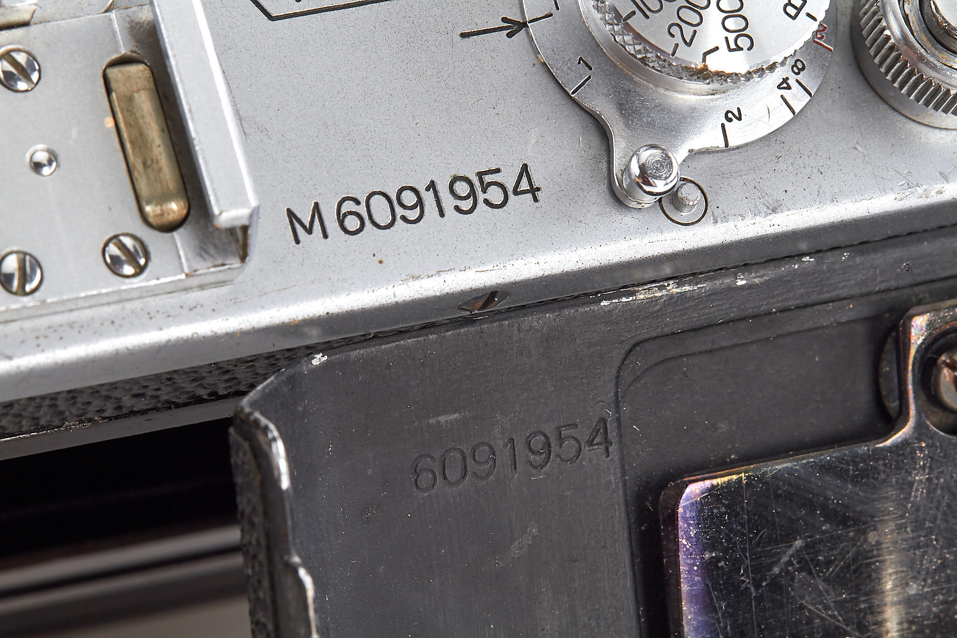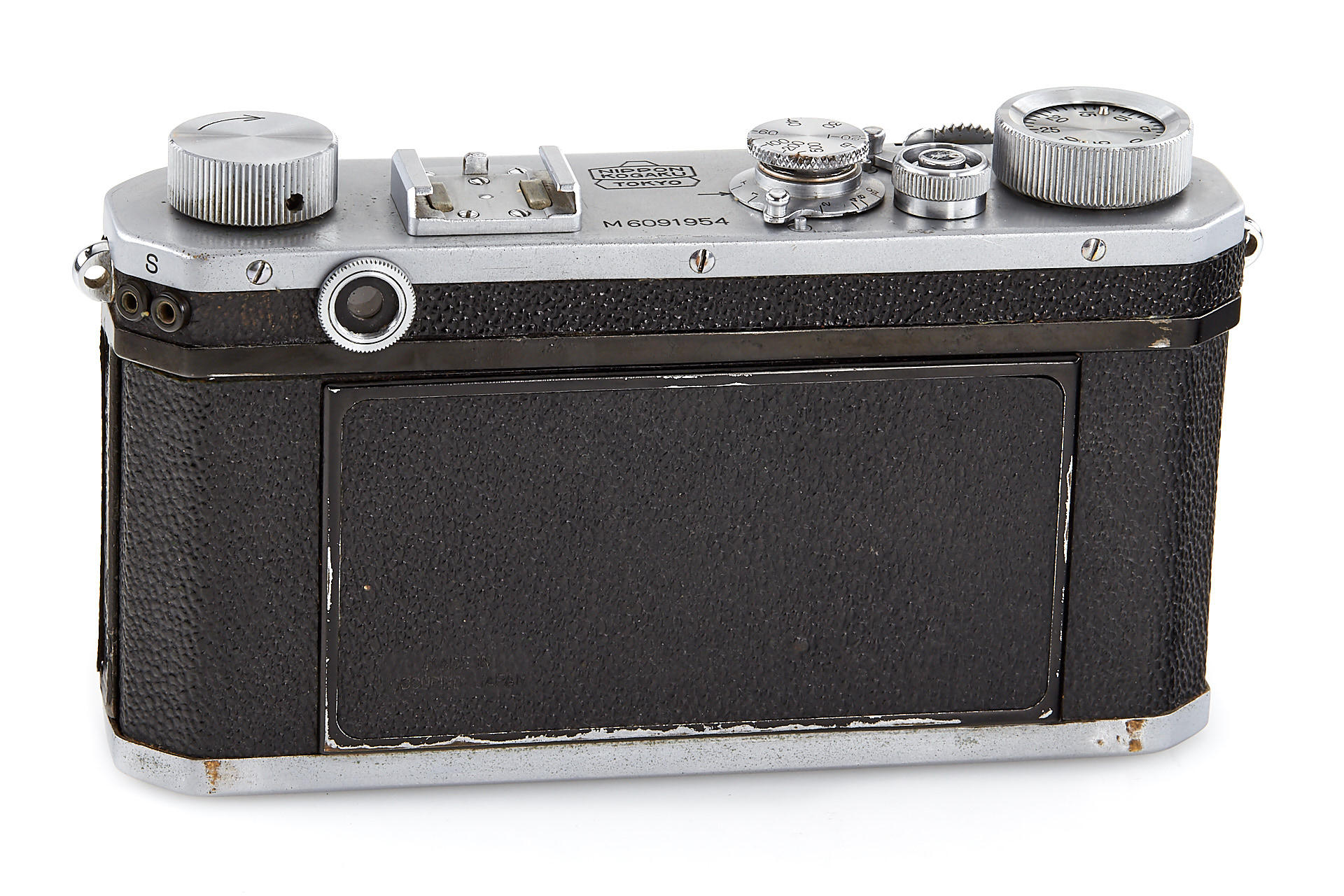 in very fine condition, with later factory added black synch. plugs - M6091948 and M6091975 are unsynched - just a few made with 2-piece accessory shoe, back inside engraved '6091954', one of the first bodies with the 'MIOJ' engraving moved as an imprint into the leather on the lower left side of the back, with very rare and early matching Nikkor-S.C. 1.5/5cm no.907158, only 389 made in Nikon mount, from a total of 797 lenses (clear optics with just a few marks), camera in good working order, with maker's original brown leather ever-ready case, the back stamped 'Made In Occupied Japan'