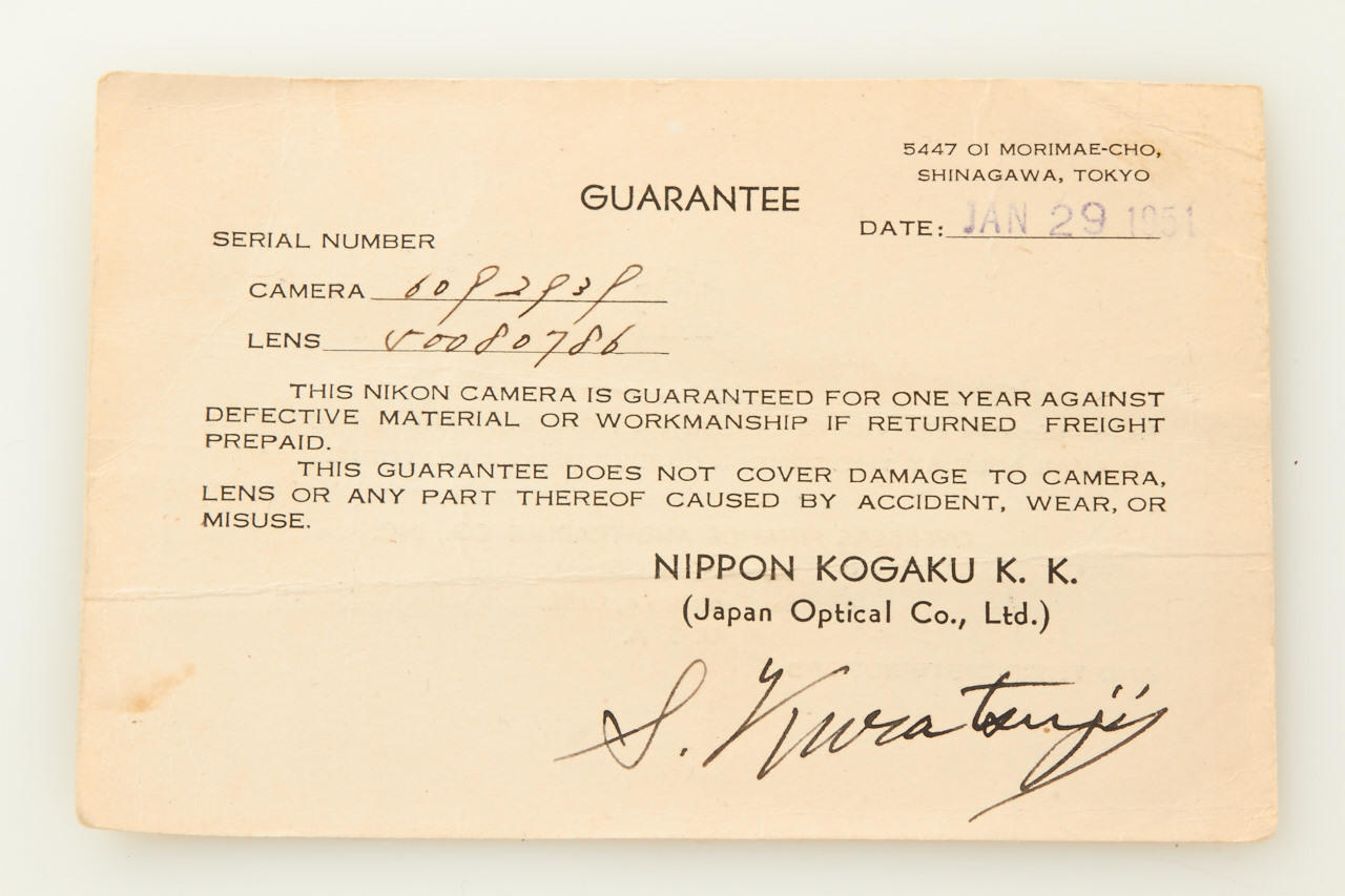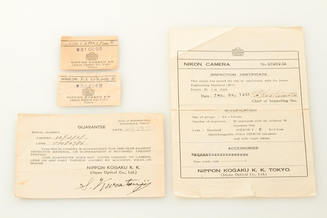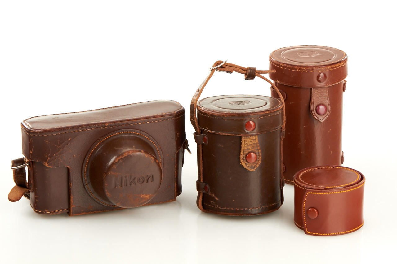 The famous Nikon M outfit illustrated on the front page of the book by Michael Wescott Loder 'The Nikon Camera in America 1946-1953' from the James Kelly collection including Nikon M no.M9062939 ('MADE IN OCCUPIED JAPAN' on leather of back door), with Nikkor-H.C 2/5cm no.50080786, inspection certificate and guarantee - both dated Jan.29,1951 - for camera and lens, everready case, W-Nikkor.C 3.5/3.5cm no.910808 with inspection card dated Febr.19,1951 and leather case, Nikkor-P.C 2/8.5cm no.286806 with hood, cap, leather case, Nikkor-Q.C 4/13.5cm no.904268 with hood, cap, inspection card from Dec.22,1950, leather case, matching Nikon Variframe finder no.M901187 with chain and eyepiece - the whole equipment which seems to be as acquired in early 1951 is in perfect near mint condition, the lenses clean and clear - the beautiful and extremely rare outfit comes with a copy the mentioned book