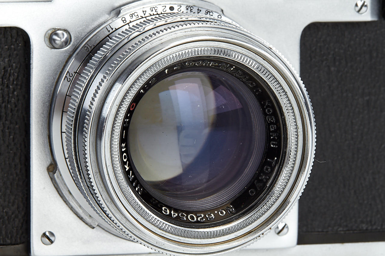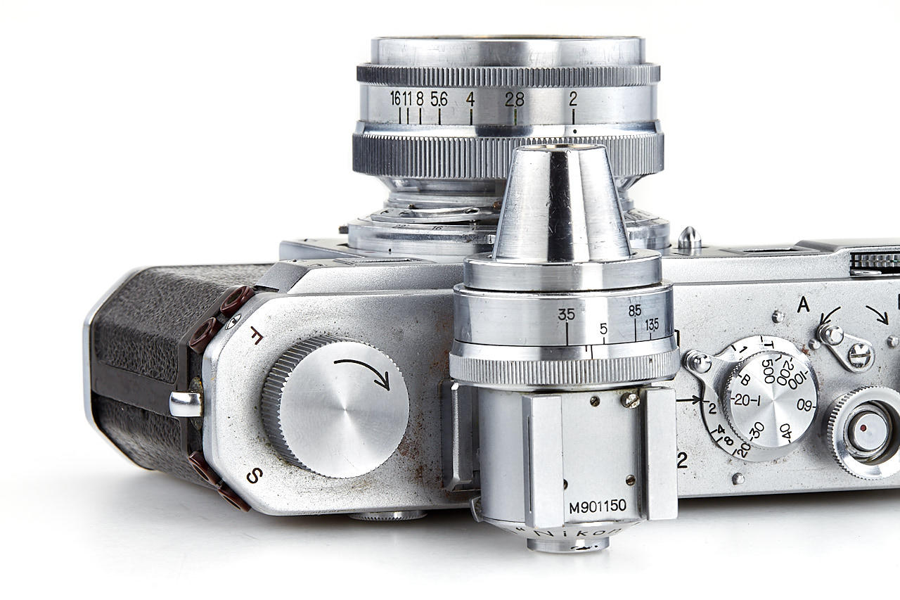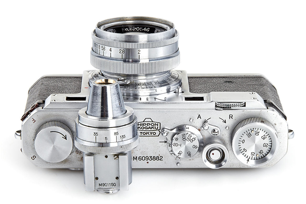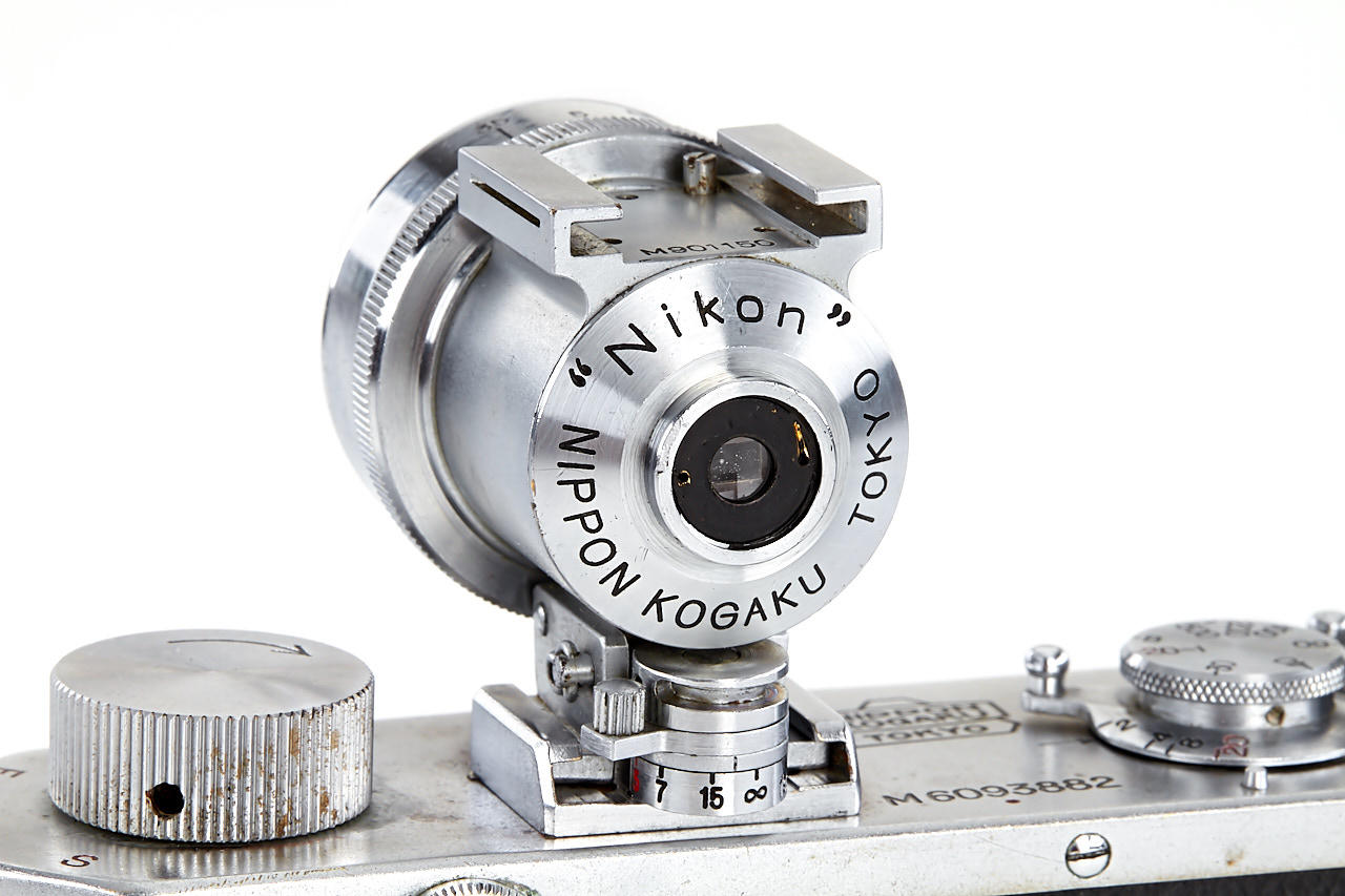 very late synchronized M (production ceased with serial no.M6094091) in fully working order, bright chrome finish, factory synchronized with original red plugs, matching back numbered 6093882, with MIOJ imprint in the leather, with matching and uncommon Tokyo Nikkor H-C 2/5cm no.620546 (minimal cleaning marks), featuring a chrome inne rfront ring within the filter rim, thus unseen so far, with Type 3 Variframe finder no.M901150 (need repair)