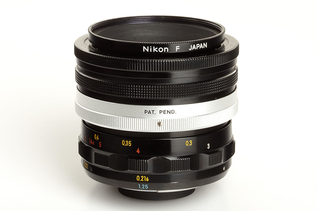 very early and very rare, first type 1:1 macro lens, the first for Nikon F, meter scale, in excellent condition with M-B filter-ring, keeper