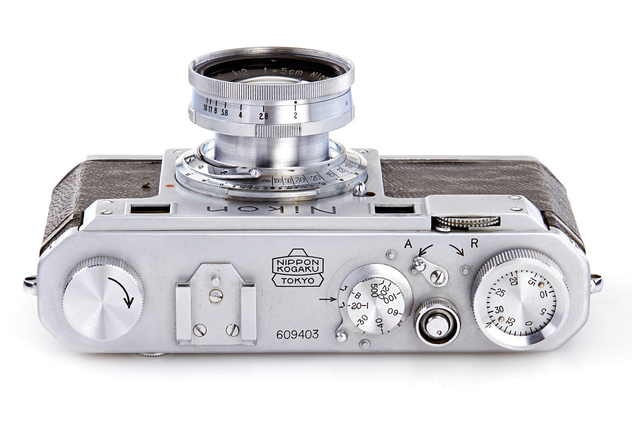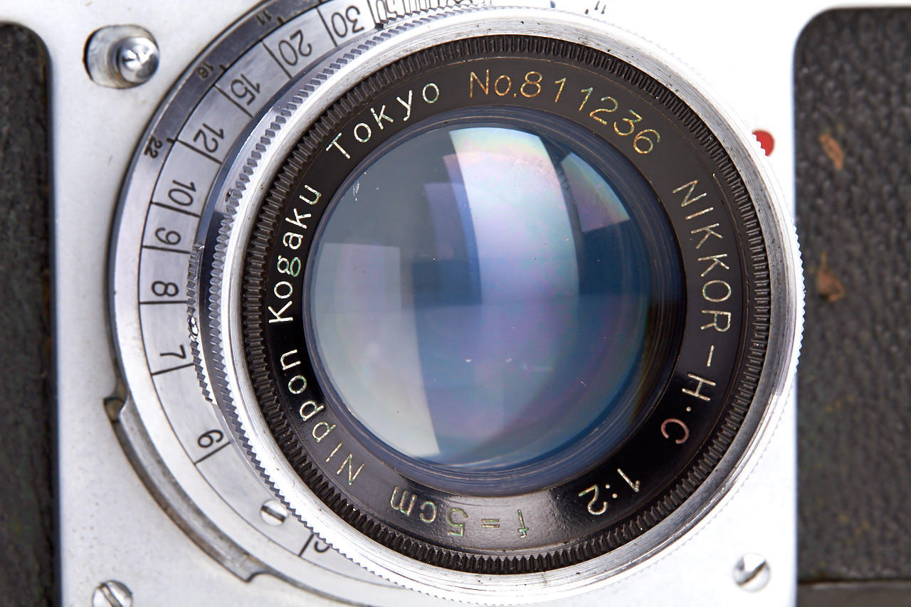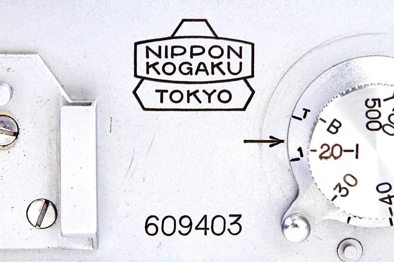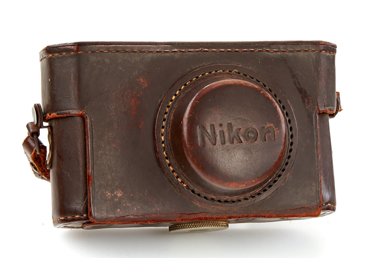 wonderful example of the first Nikon model in 100% original condition, version with 4 film guide rails, fixed spool, original shutter blinds, matching back door engraved '609403' + 'MADE IN OCCUPIED JAPAN', Nikkor-H.C. 2/5cm no.811236 with Nikon cap, UV filter, with early brown everready case