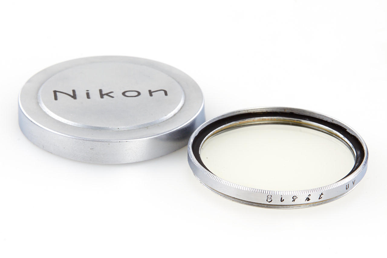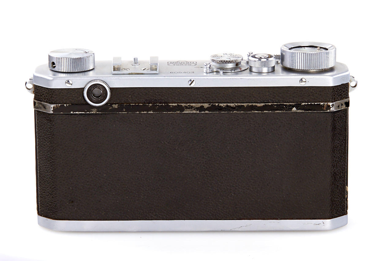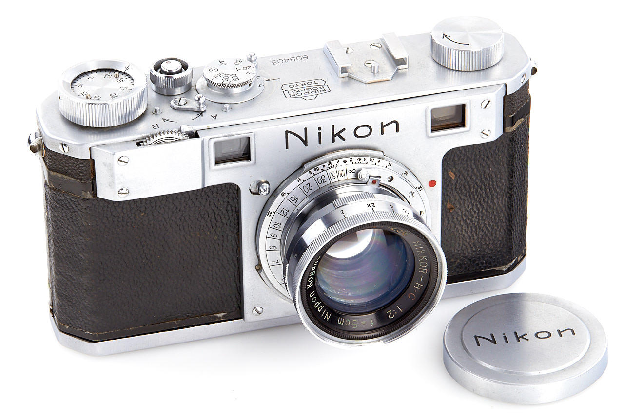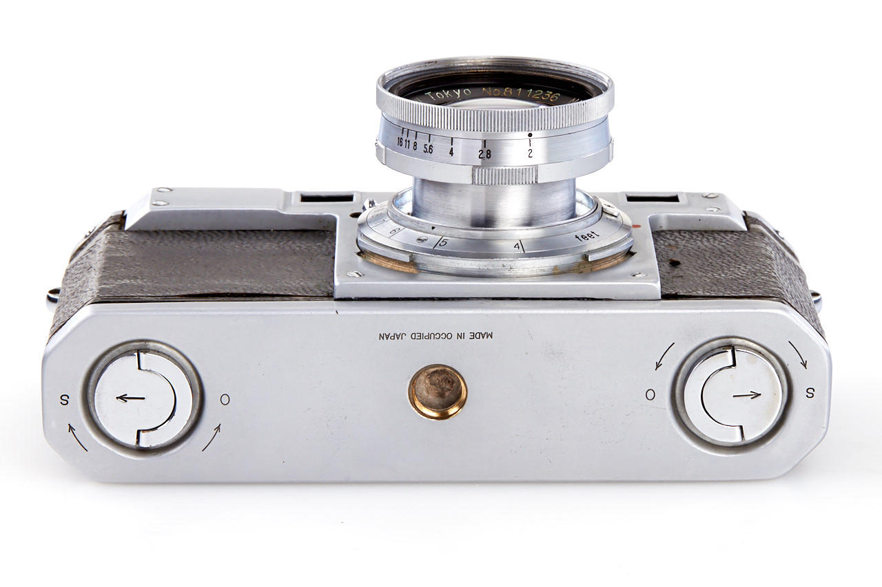 wonderful example of the first Nikon model in 100% original condition, version with 4 film guide rails, fixed spool, original shutter blinds, matching back door engraved '609403' + 'MADE IN OCCUPIED JAPAN', Nikkor-H.C. 2/5cm no.811236 with Nikon cap, UV filter, with early brown everready case