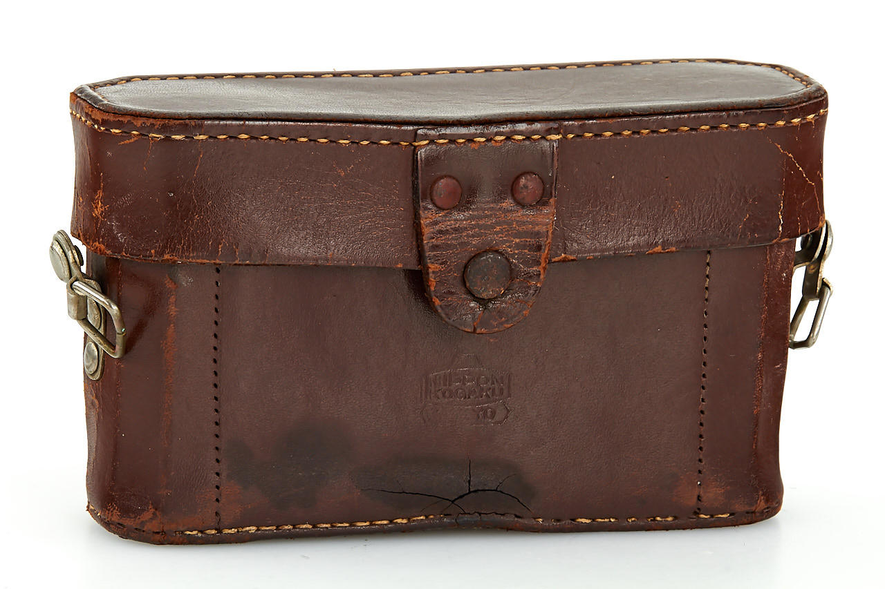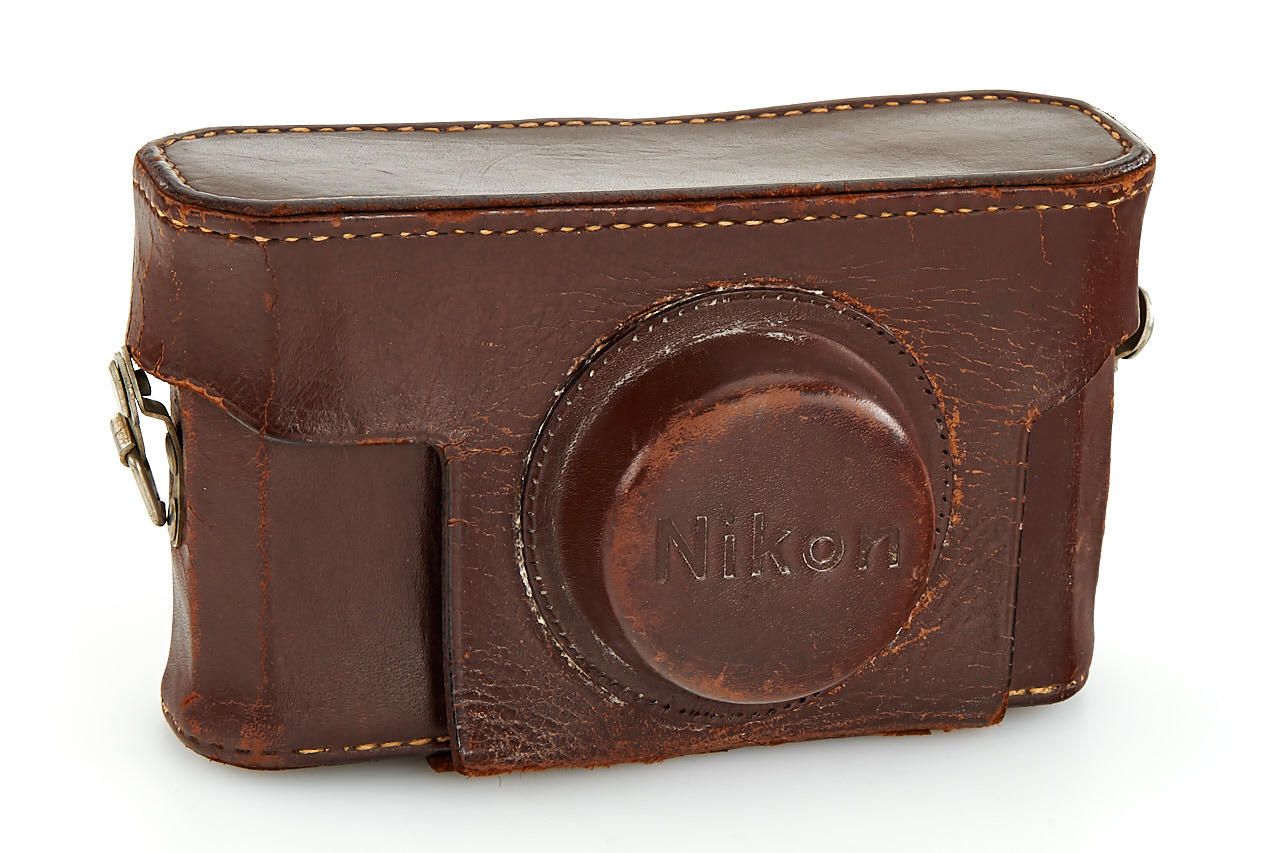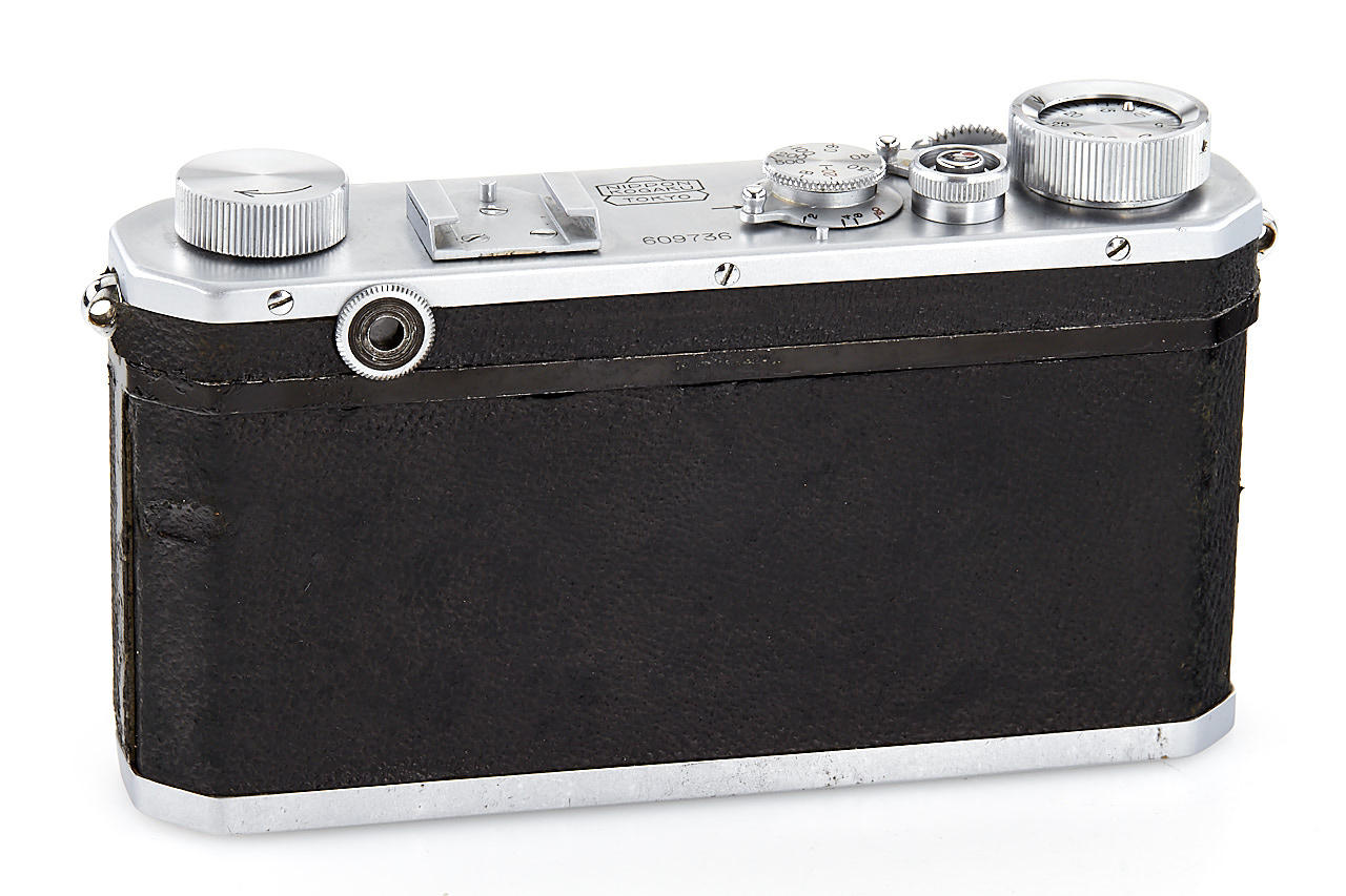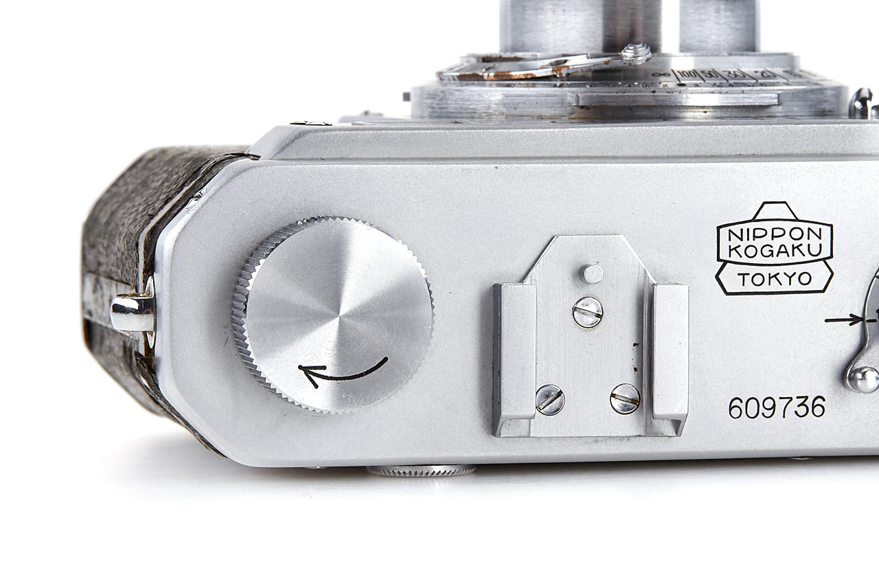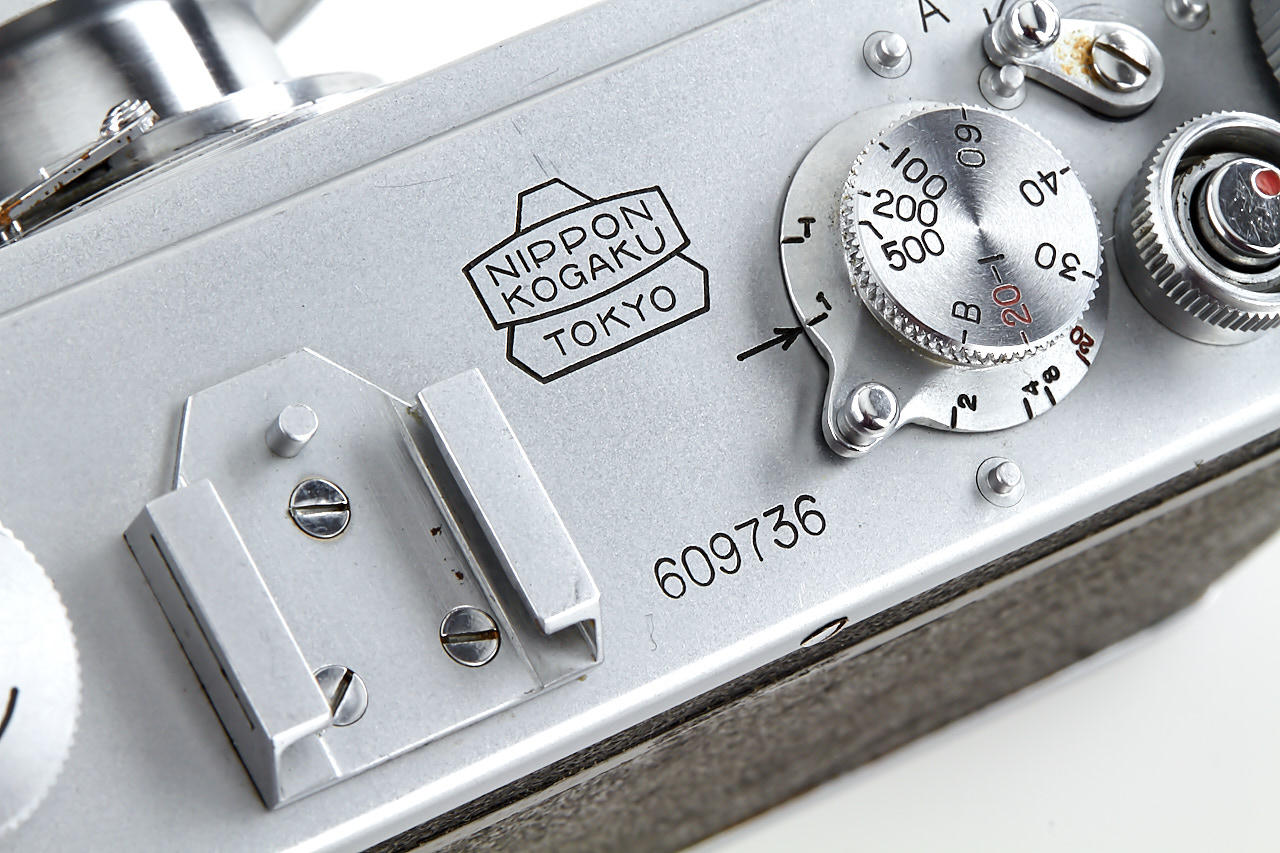 interesting example of the first Nikon model in very good condition, version with 4 film guide rails, fixed spool, 32x24mm frame size, back door engraved '609736' inside + 'MADE IN OCCUPIED JAPAN', with matching Nikkor-H.C. 2/5cm no.811185 early, worn everready case. This is one of the last Nikon I made - production was ceased with no.609759.