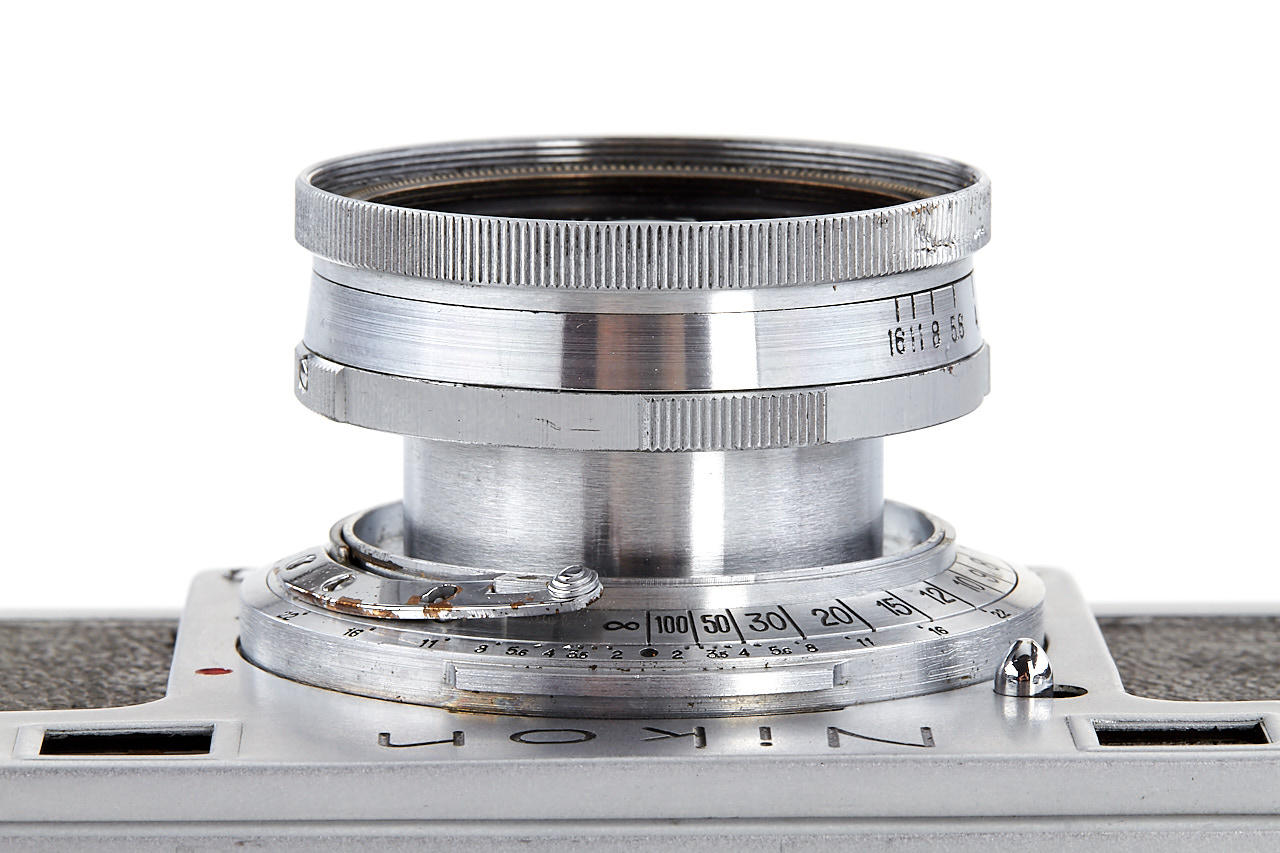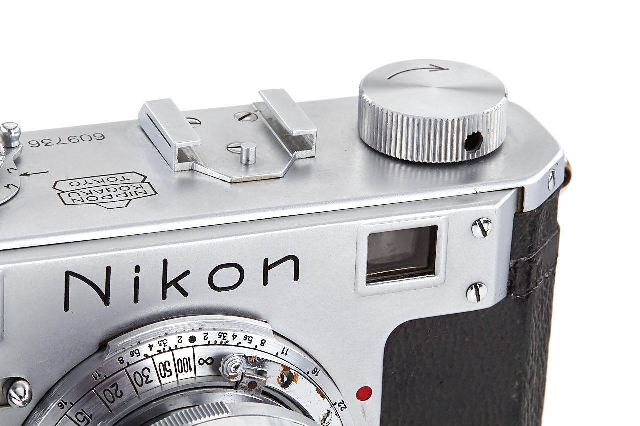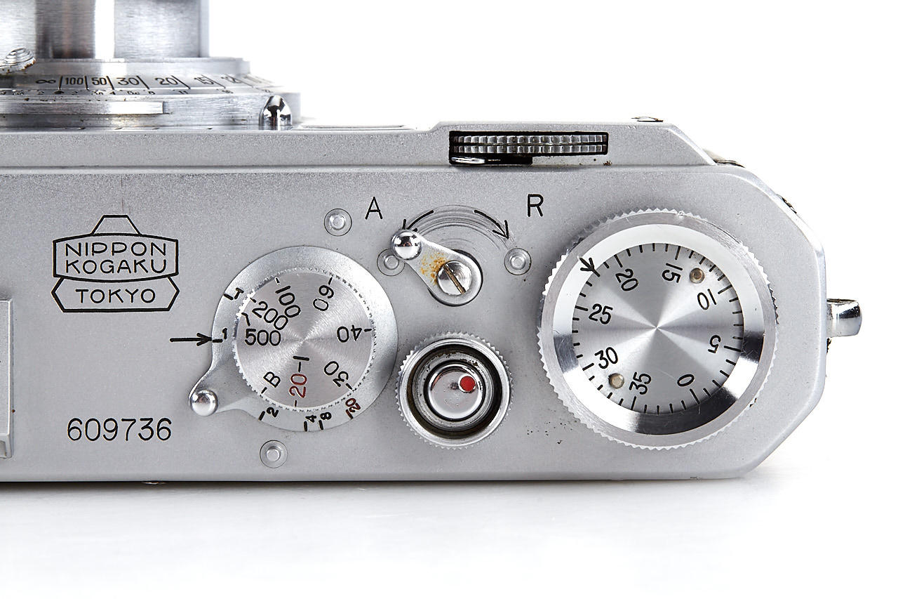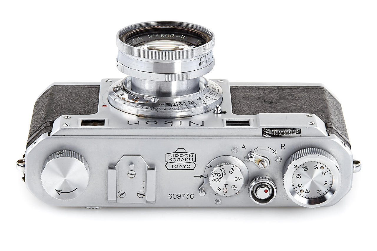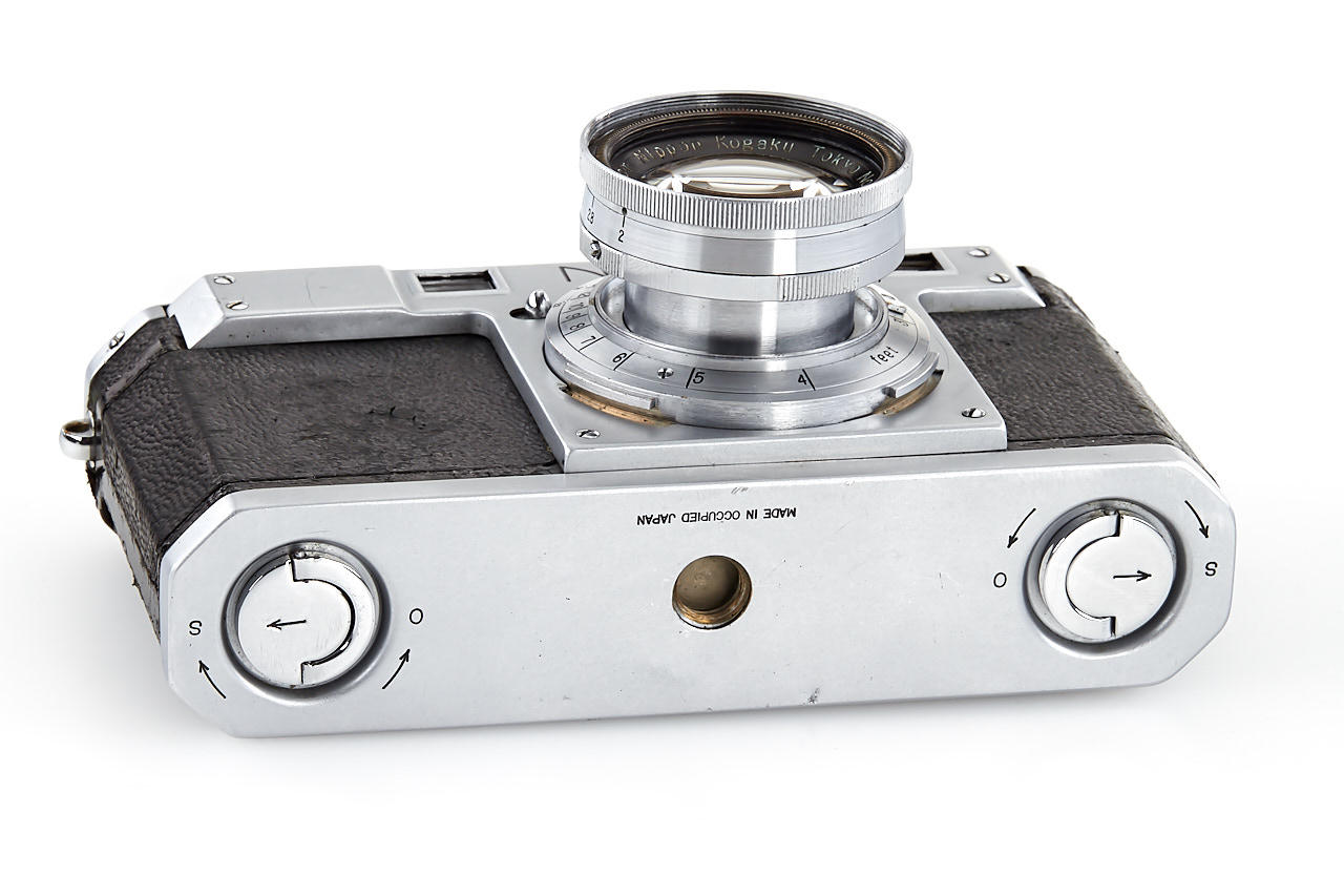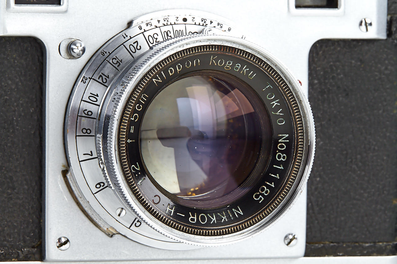 interesting example of the first Nikon model in very good condition, version with 4 film guide rails, fixed spool, 32x24mm frame size, back door engraved '609736' inside + 'MADE IN OCCUPIED JAPAN', with matching Nikkor-H.C. 2/5cm no.811185 early, worn everready case. This is one of the last Nikon I made - production was ceased with no.609759.