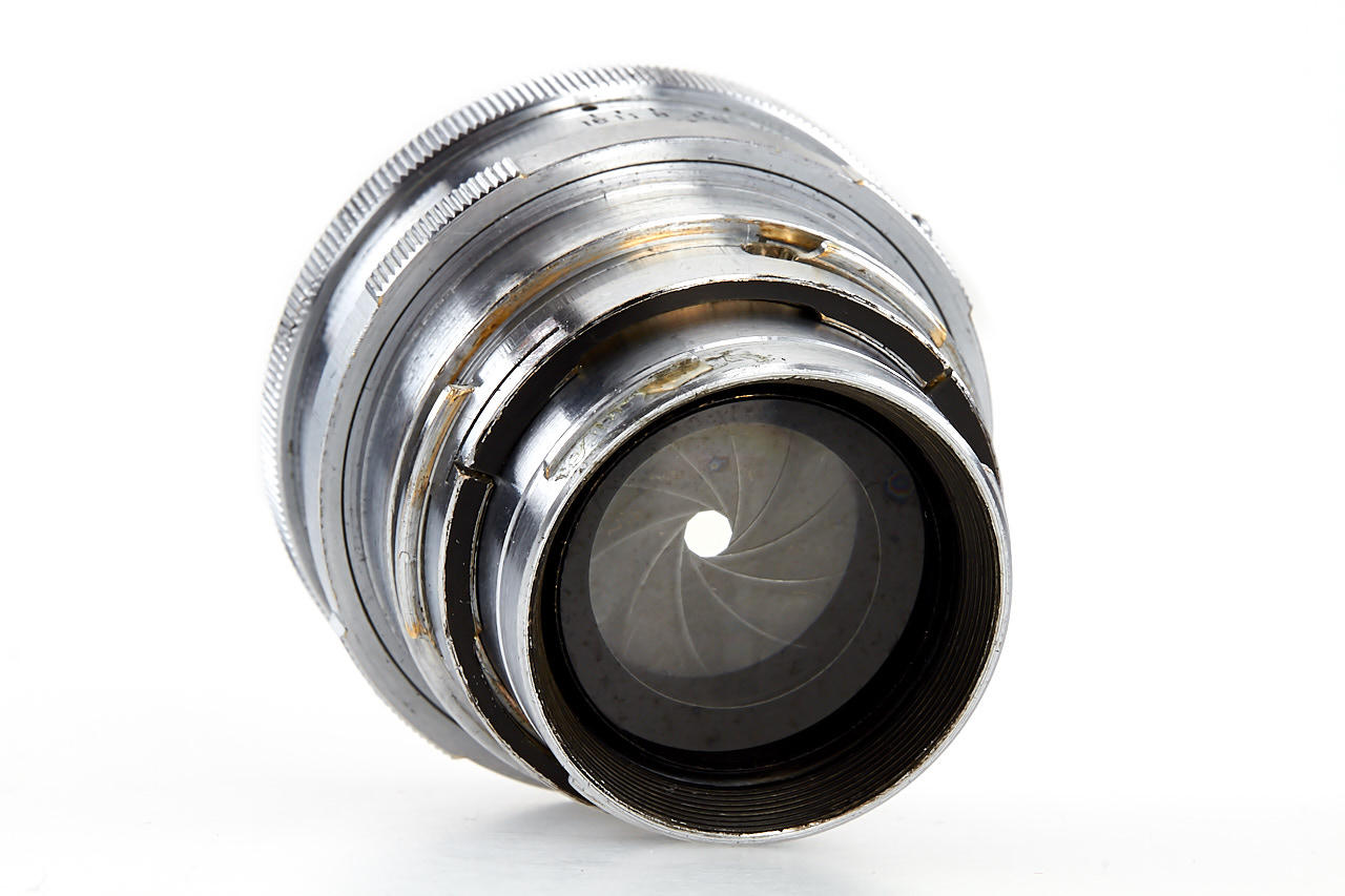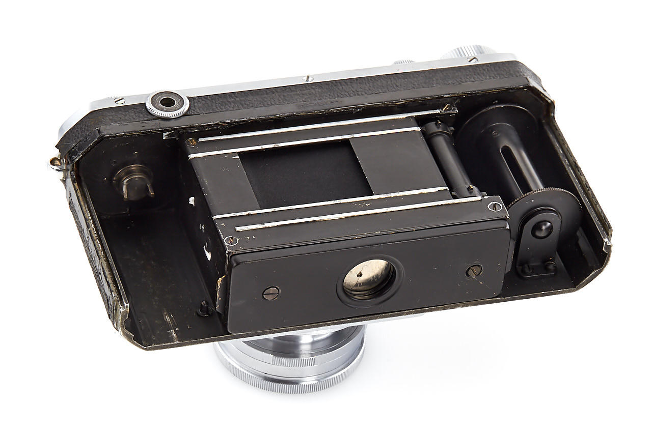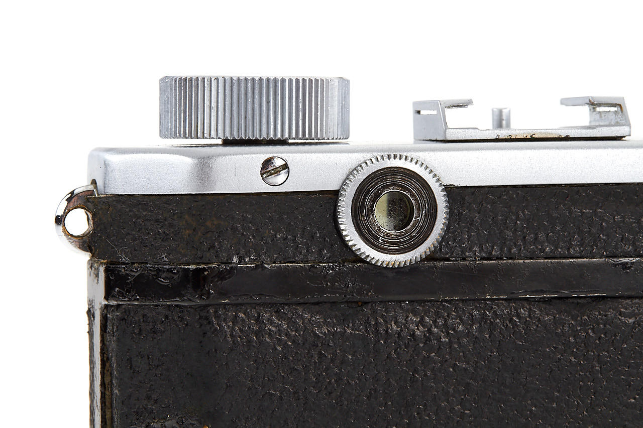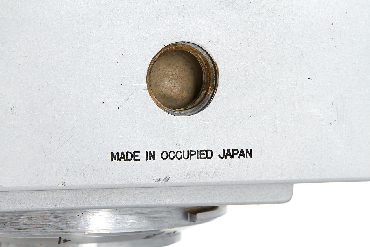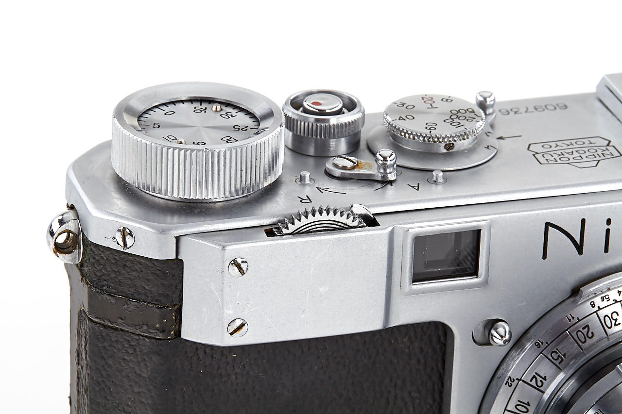 interesting example of the first Nikon model in very good condition, version with 4 film guide rails, fixed spool, 32x24mm frame size, back door engraved '609736' inside + 'MADE IN OCCUPIED JAPAN', with matching Nikkor-H.C. 2/5cm no.811185 early, worn everready case. This is one of the last Nikon I made - production was ceased with no.609759.