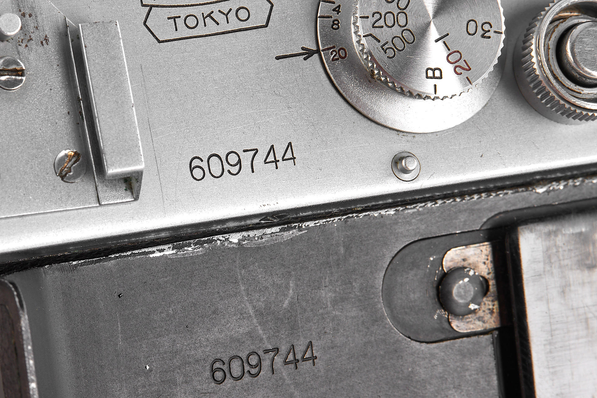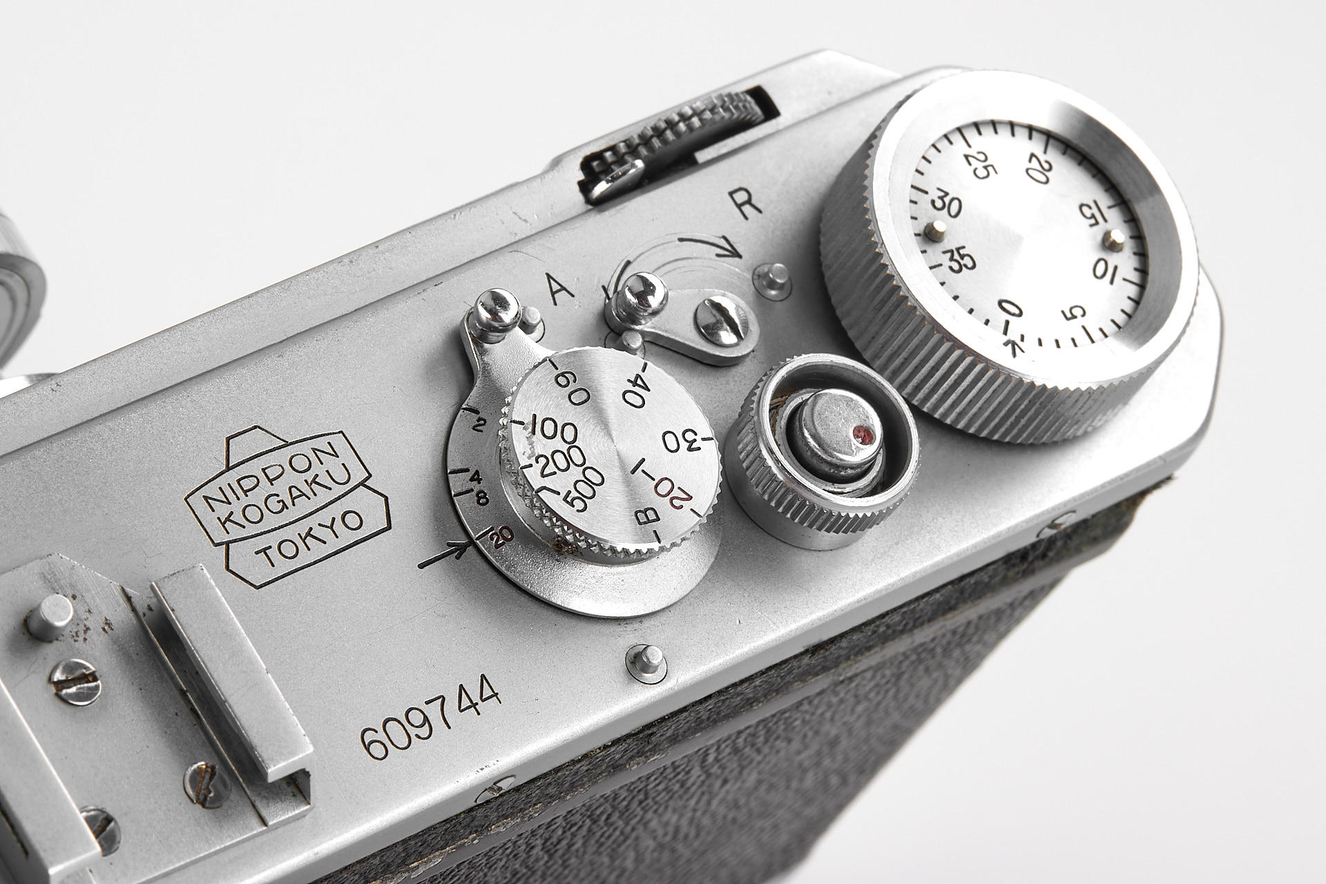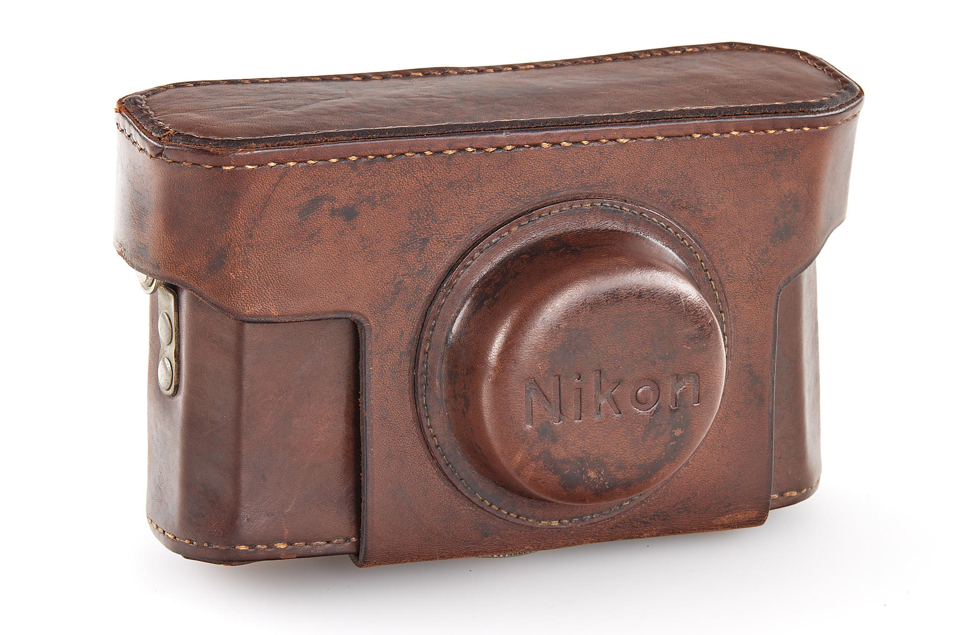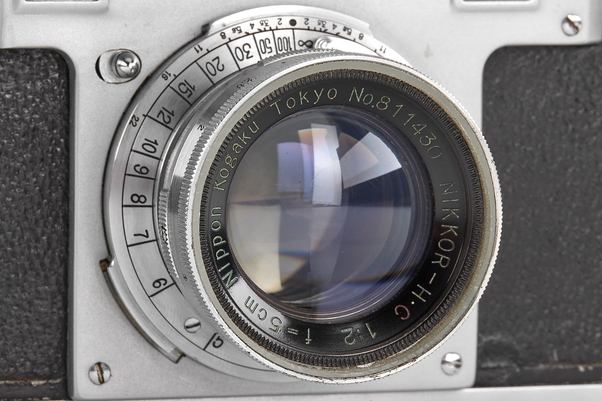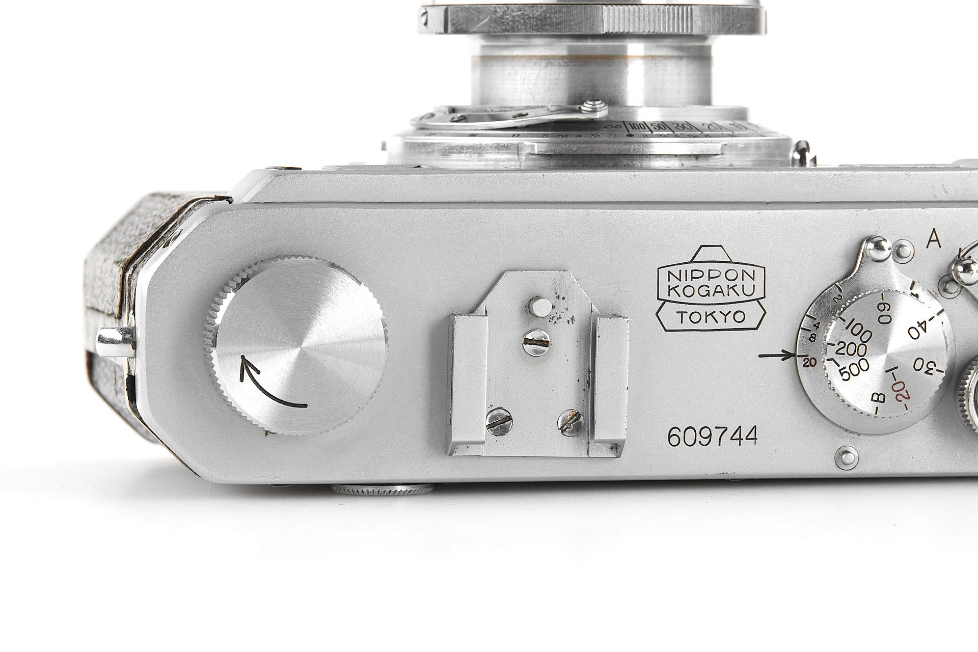 very late example of the first Nikon model in excellent condition, version with 4 film guide rails, fixed spool, 32x24mm frame size, back door engraved '609744' inside + 'MADE IN OCCUPIED JAPAN', with matching Nikkor-H.C. 2/5cm no.811430 and early eveready case. This is one of the last Nikon I made - production was ceased with no.609759.