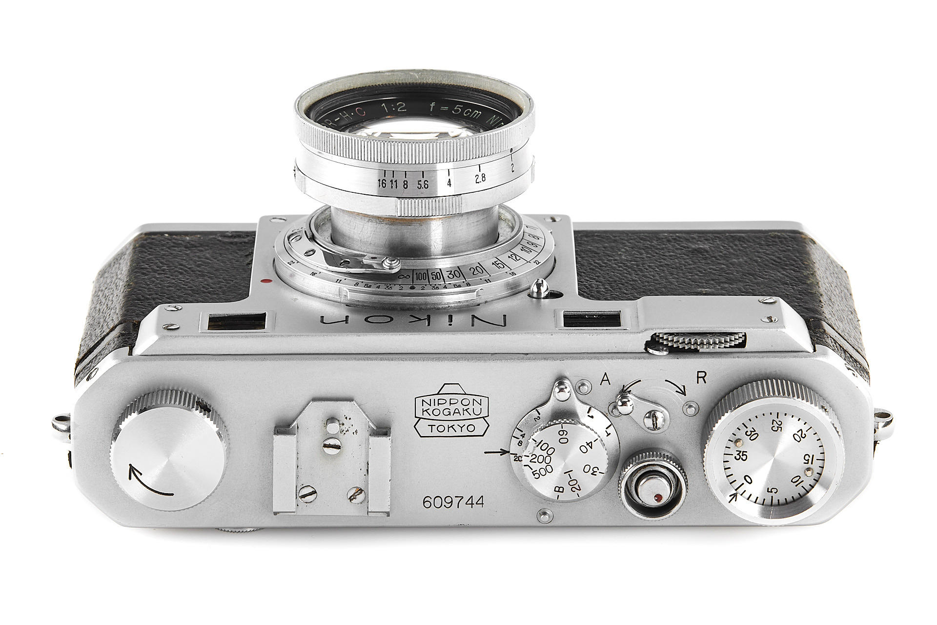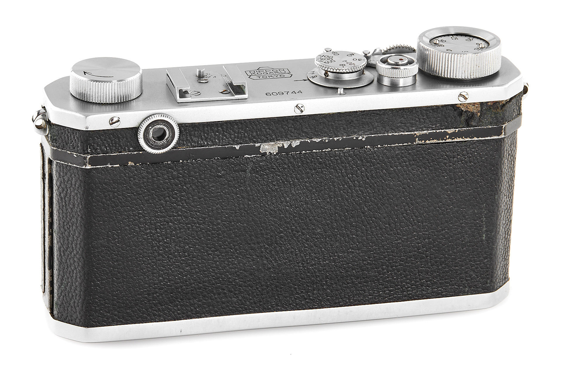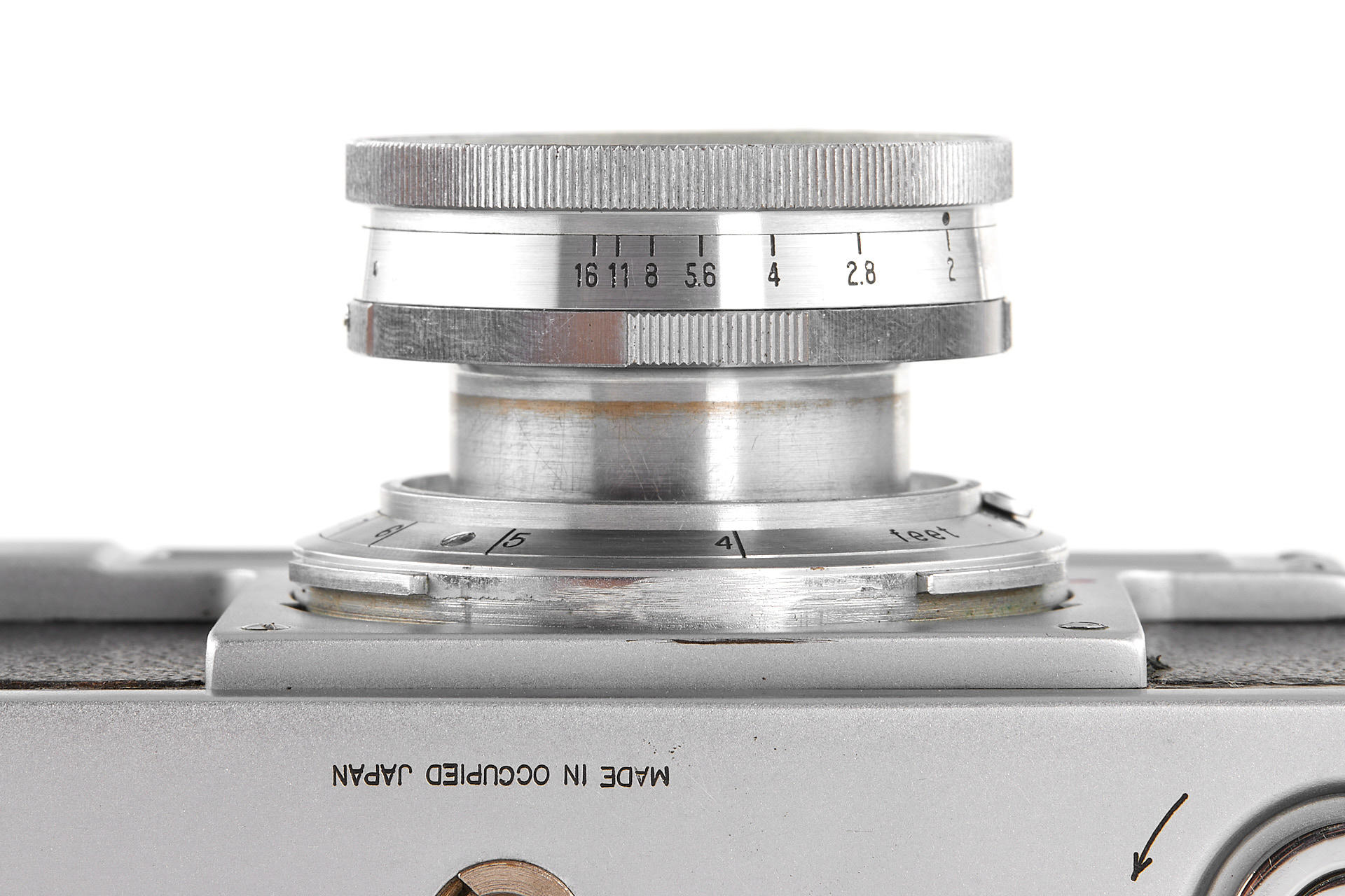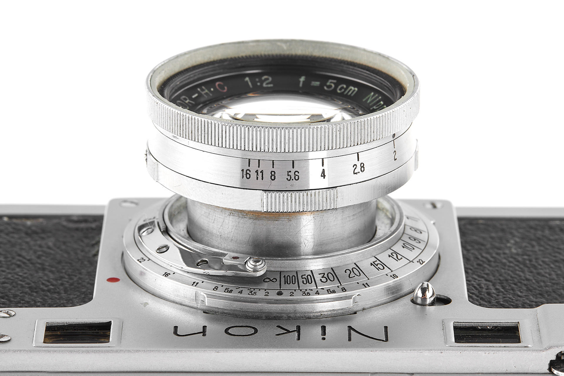 very late example of the first Nikon model in excellent condition, version with 4 film guide rails, fixed spool, 32x24mm frame size, back door engraved '609744' inside + 'MADE IN OCCUPIED JAPAN', with matching Nikkor-H.C. 2/5cm no.811430 and early eveready case. This is one of the last Nikon I made - production was ceased with no.609759.
