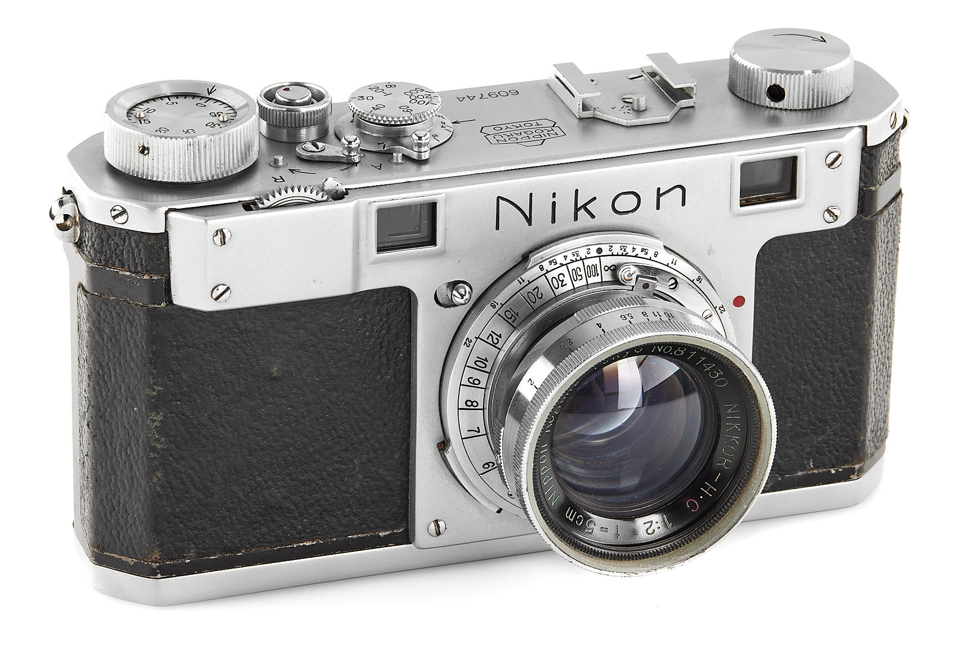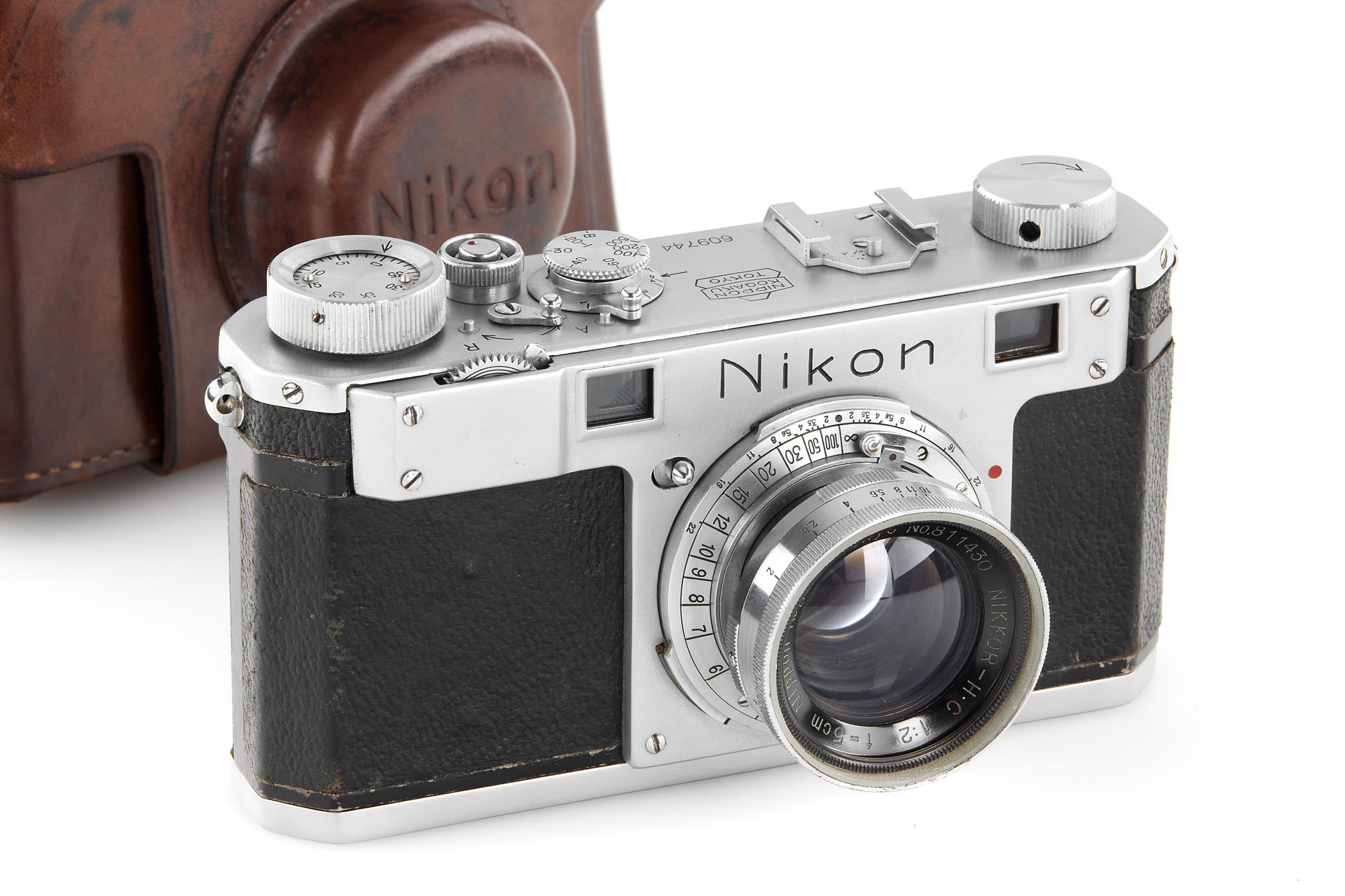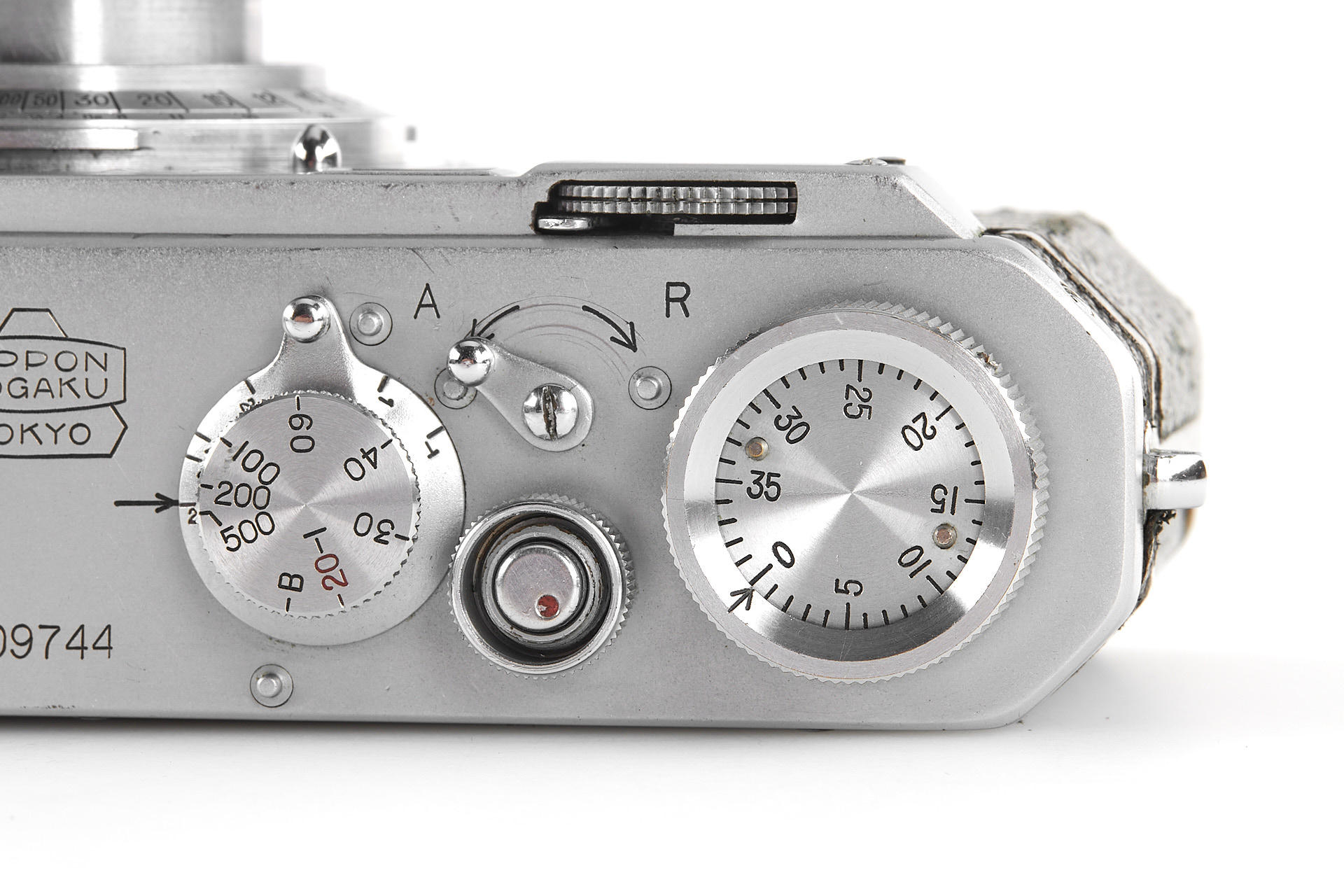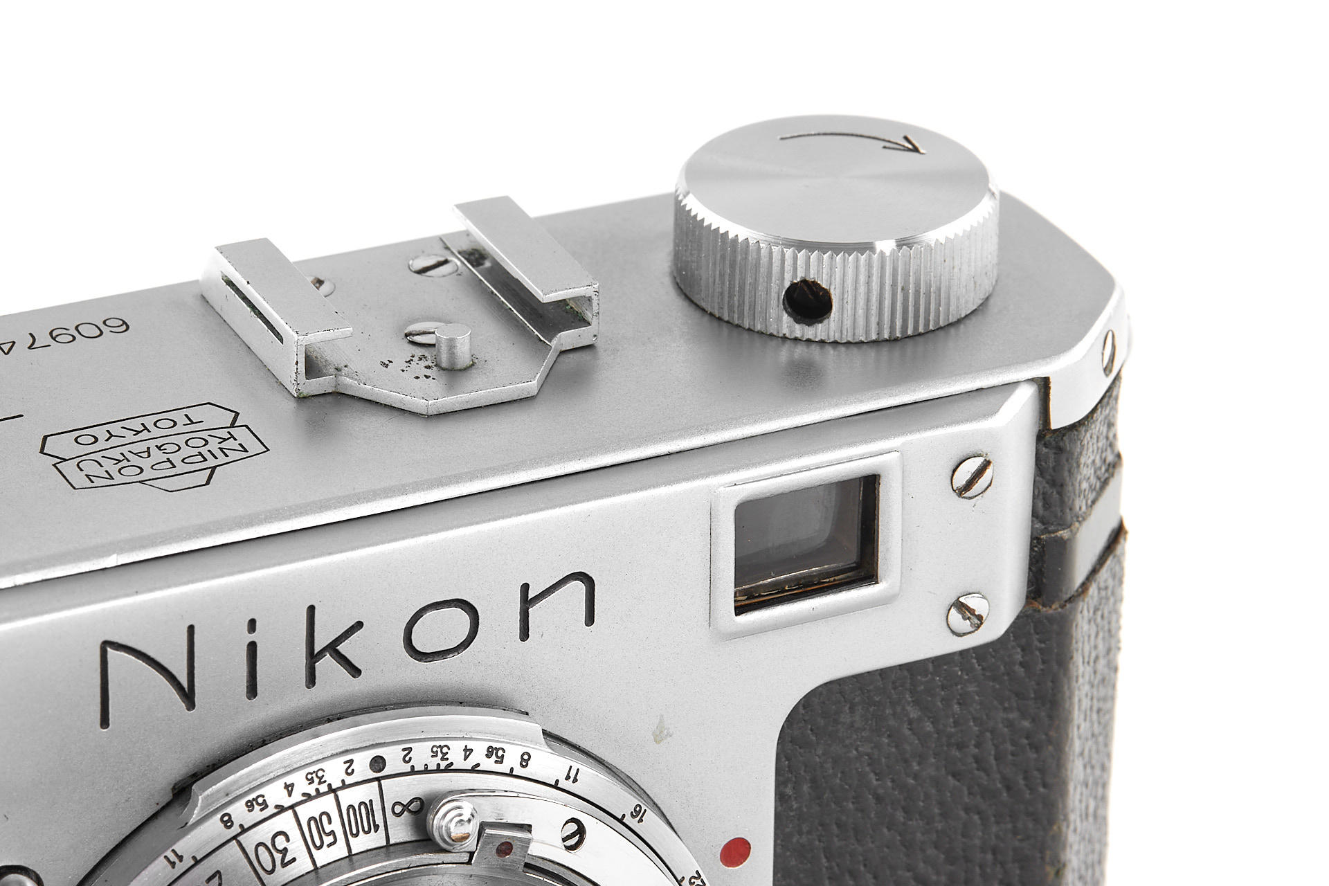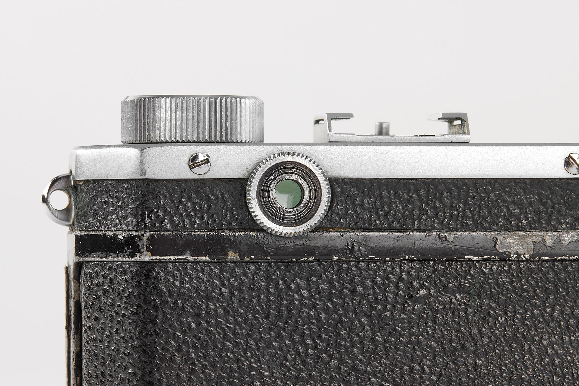 very late example of the first Nikon model in excellent condition, version with 4 film guide rails, fixed spool, 32x24mm frame size, back door engraved '609744' inside + 'MADE IN OCCUPIED JAPAN', with matching Nikkor-H.C. 2/5cm no.811430 and early eveready case. This is one of the last Nikon I made - production was ceased with no.609759.