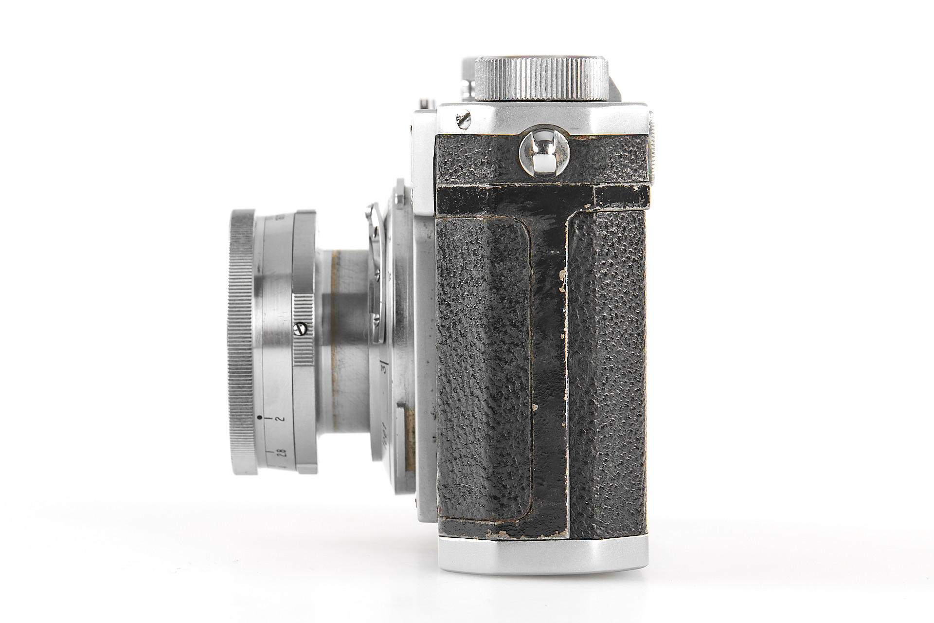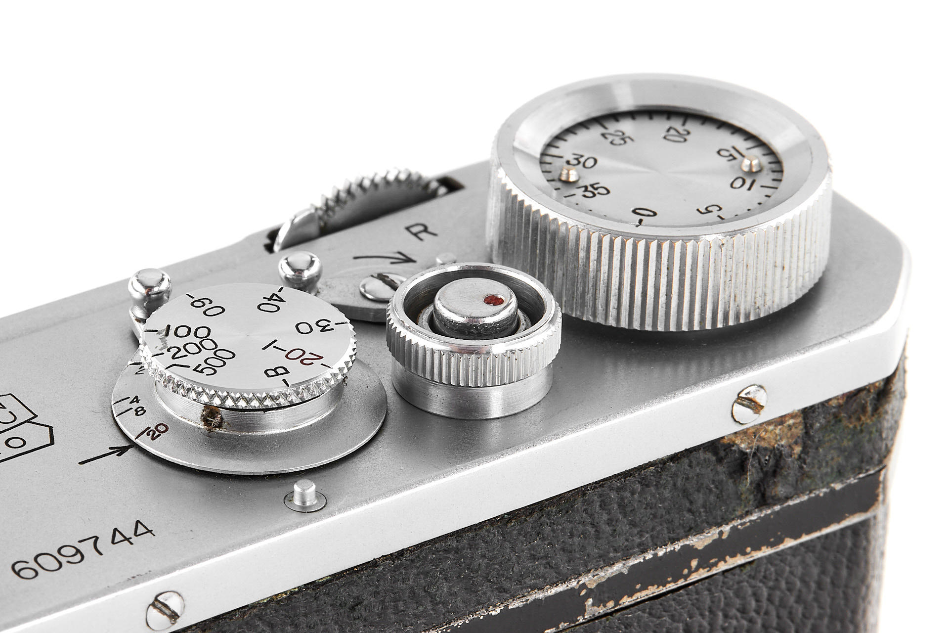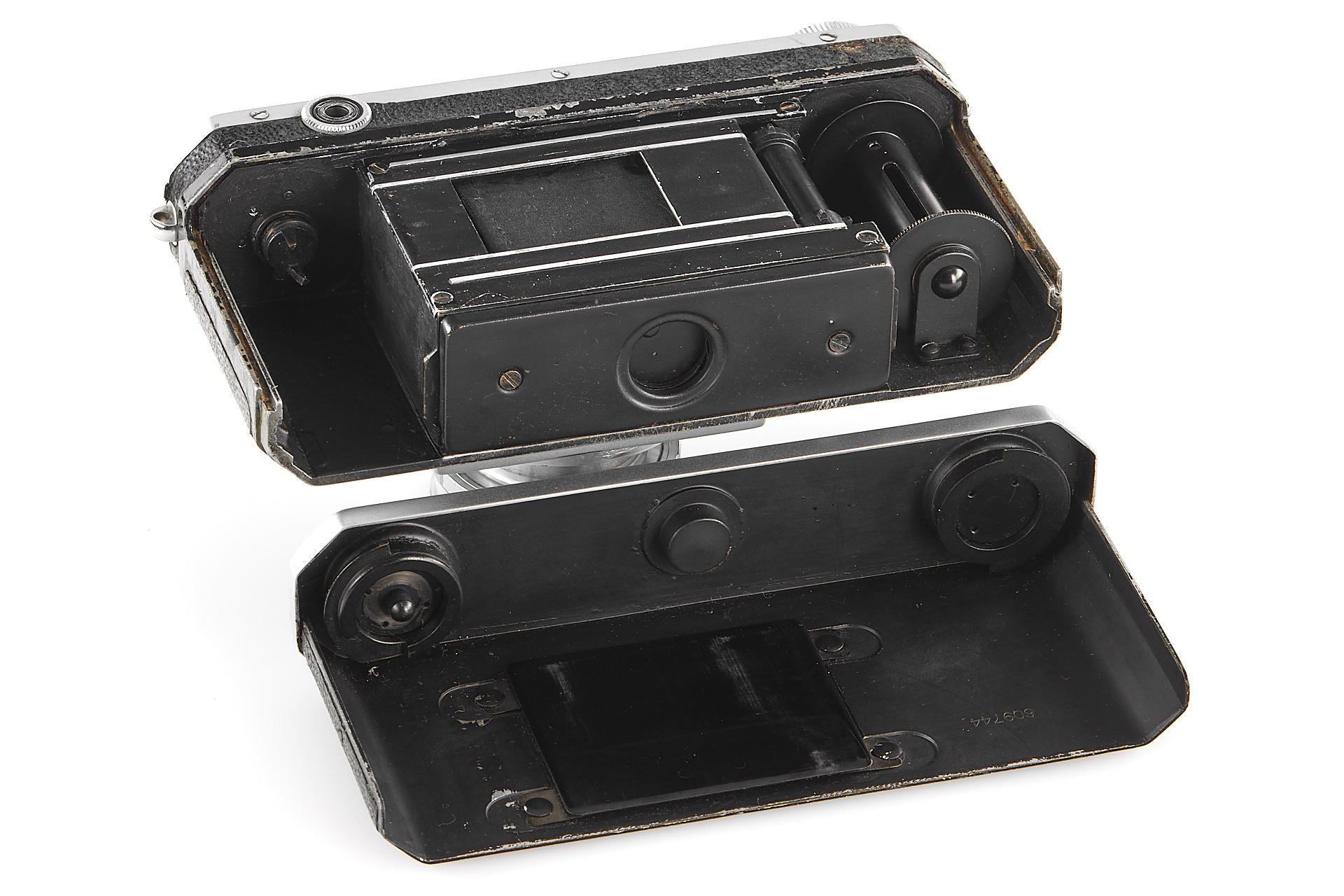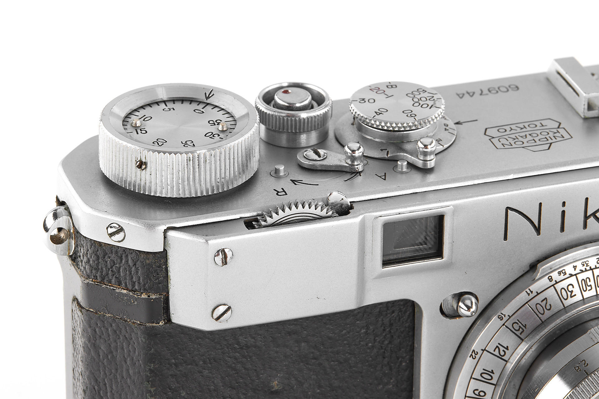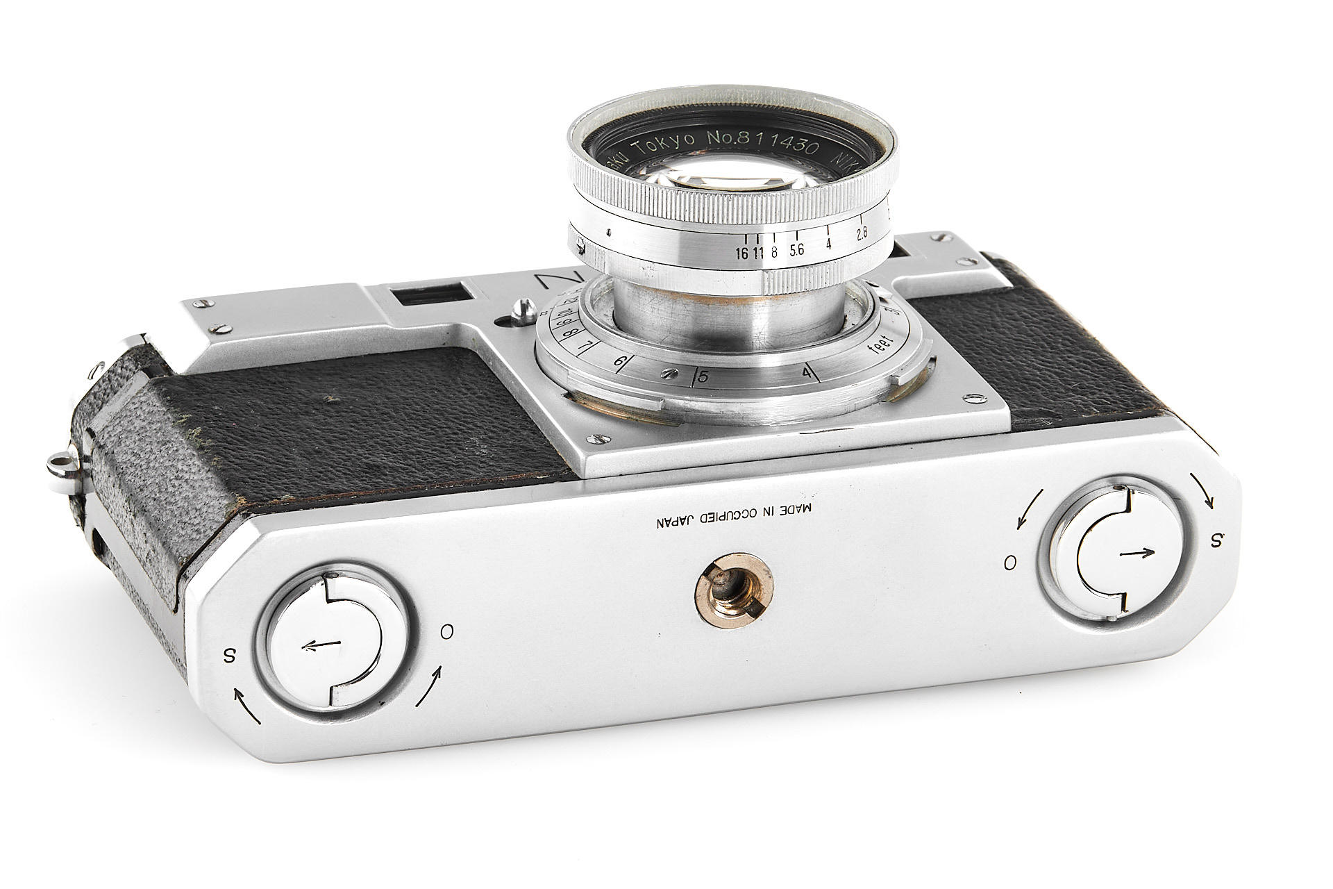 very late example of the first Nikon model in excellent condition, version with 4 film guide rails, fixed spool, 32x24mm frame size, back door engraved '609744' inside + 'MADE IN OCCUPIED JAPAN', with matching Nikkor-H.C. 2/5cm no.811430 and early eveready case. This is one of the last Nikon I made - production was ceased with no.609759.