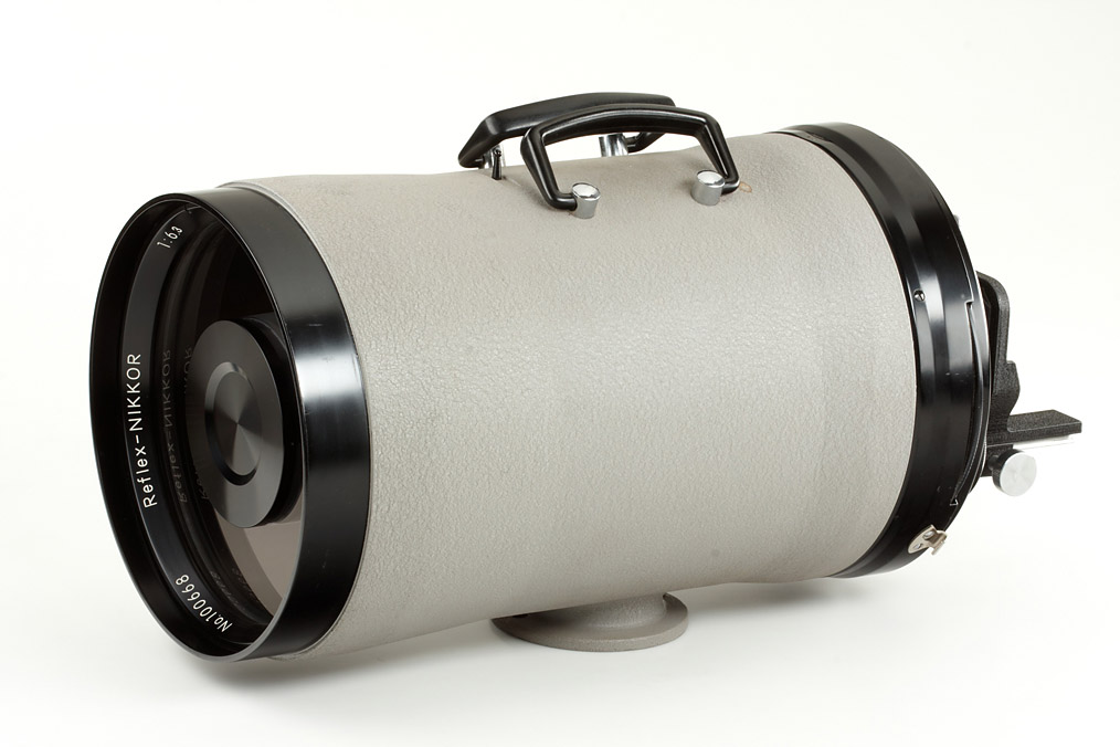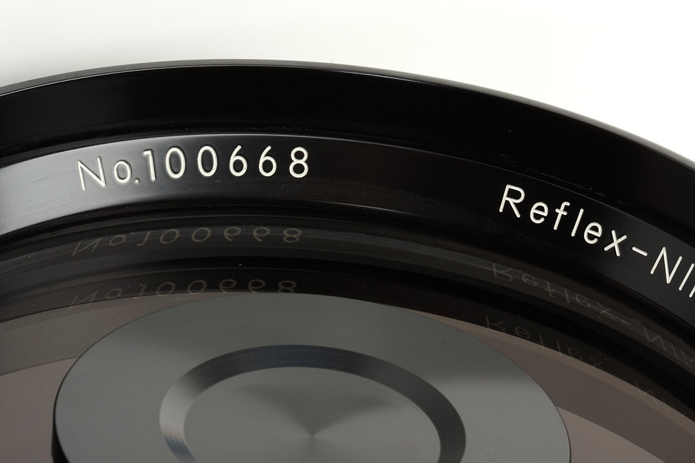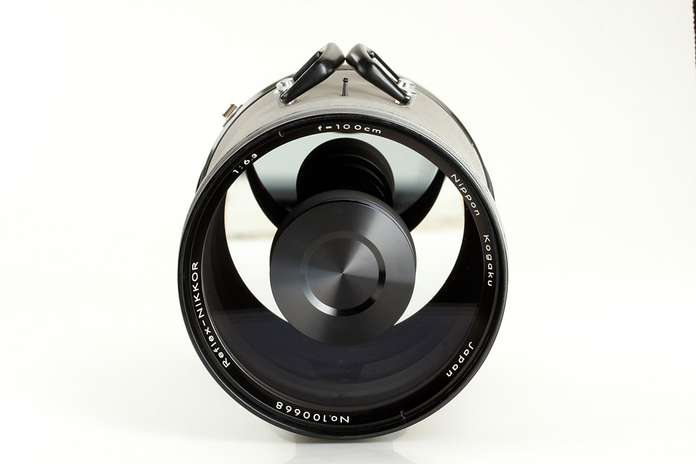 grey version of the extremely rare 100cm mirror lens (total production less than 40 lenses in Nikon rangefinder mount), in perfect condition with hood, front cap and rear protection cover, original grey metal case