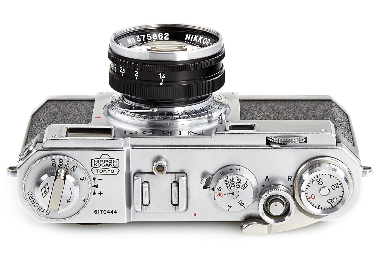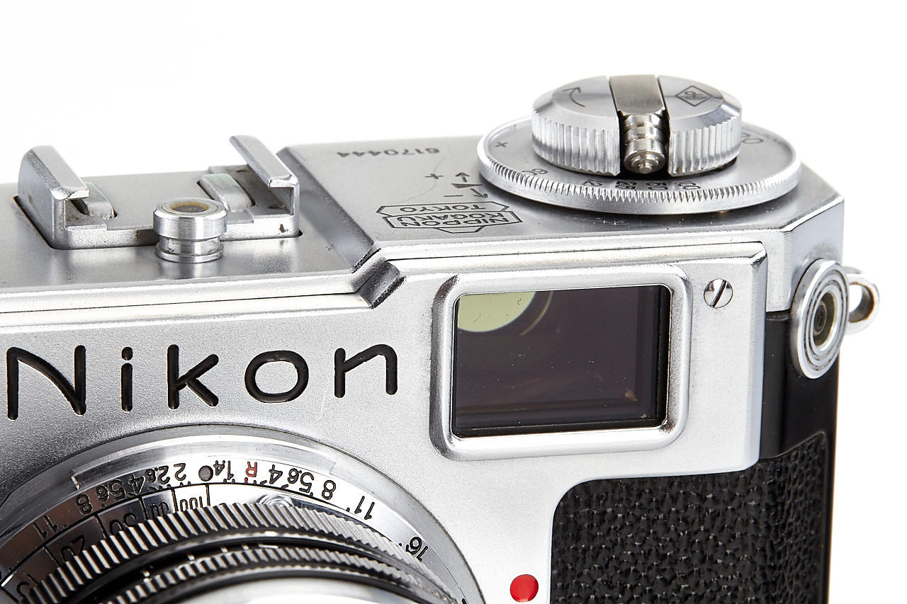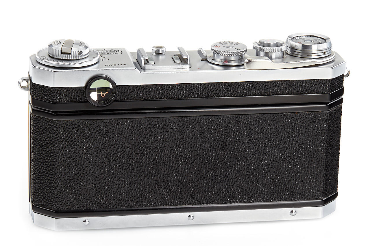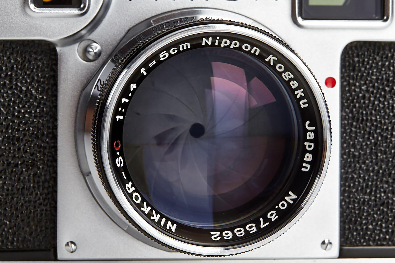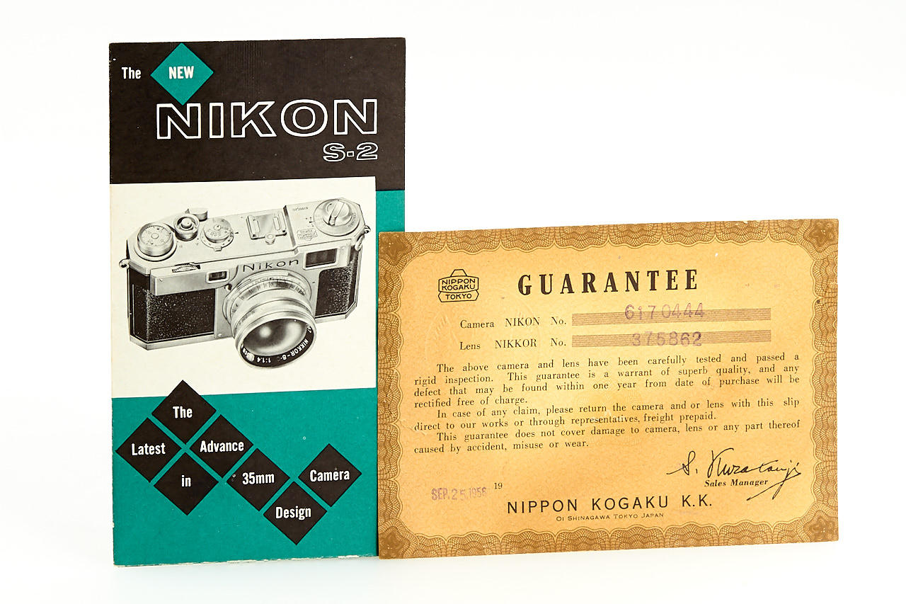 body in excellent cosmetic condition, with black Nikkor-S.C 1.4/5cm no.375862 (very good optics with only a few hairline marks), original warranty card from 1956, instructions and maker's box