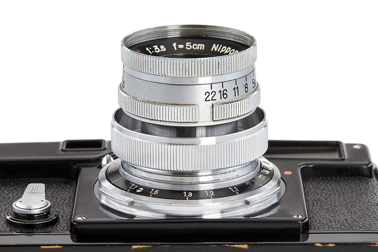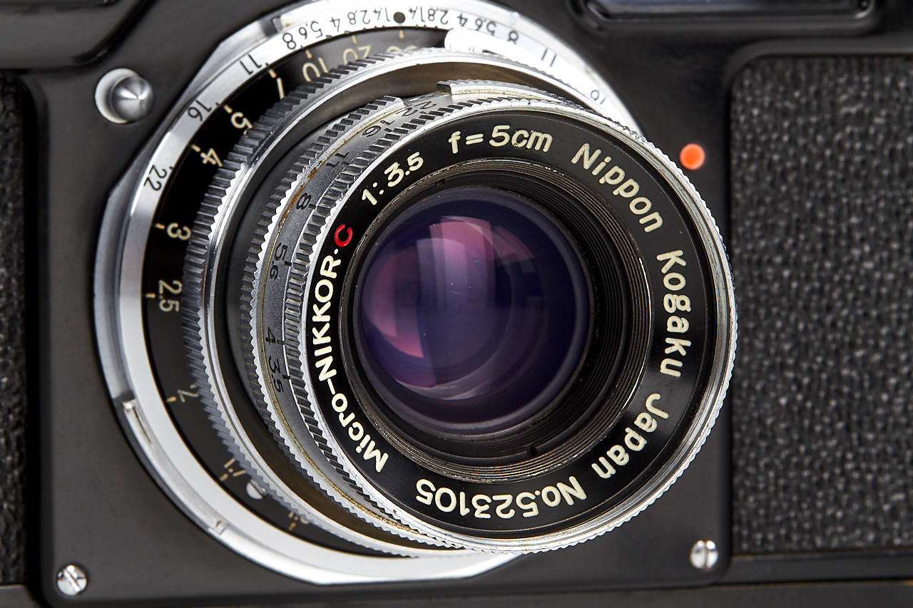 original black paint camera, made in one batch of 2010 units in 1964, in very good condition, titanium shutter, in good working order, with uncommon Micro-Nikkor 3.5/5cm no.523105 (cond. B/A, good optics, both caps)