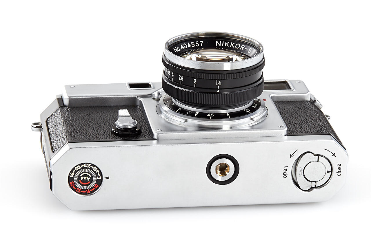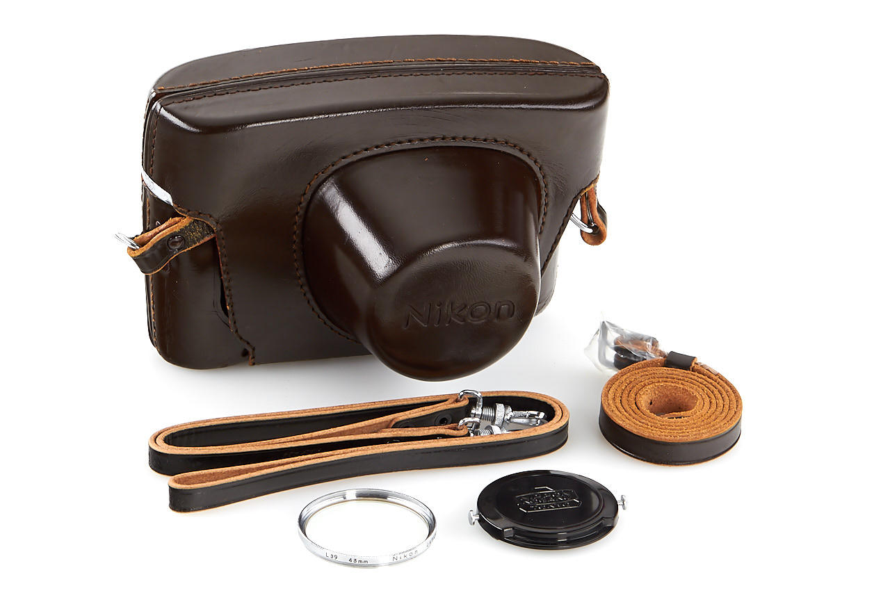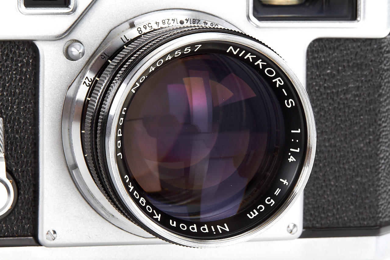 body in beautiful, near mint condition and in good working order, with Nikkor-S 1.4/5cm no.404557 (UV filter, cap), leather case, original strap, matching warranty card, English instructions and maker's box