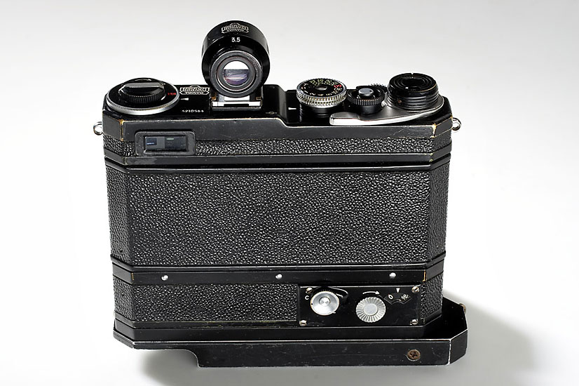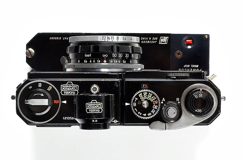 SP with original black paint, cloth shutter, W-Nikkor 1.8/3.5cm no.358568 (clean lenses), rare black 3.5cm BL finder, S-36 motor-drive no.94529 with very rare jpi POWERCON S36 battery pack no.617 (Jacobson Photographic Instruments, 862 N.Vine St. Hollywood Calif. 90038), a very rare outfit in lovely condition