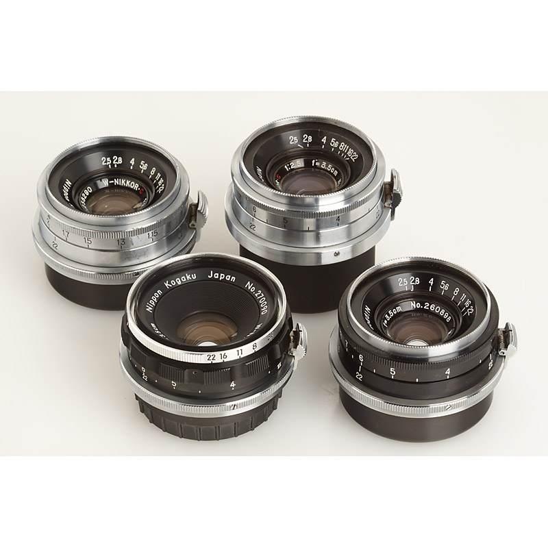 (1) chrome W-Nikkor-C 2.5/3.5cm no.249369 (cond. B+, few cleaning marks, feet scale, rear cap), (2) chrome W-Nikkor-C 2.5/3.5cm no.258290 (cond. B+, clean lenses, meter scale, rear cap), (3) black W-Nikkor-C 2.5/3.5cm no.260898 (cond. A/B, clean lenses, meter scale, both caps), (4) black/chrome 2nd type W-Nikkor 2.5/3.5cm no.270090 (cond. A/B, few cleaning marks, feet scale, both caps) - ex Tad Sato collection (4)
