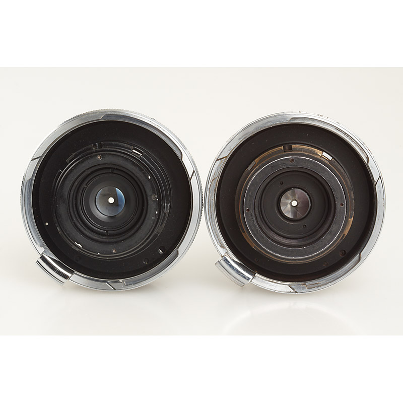 (1) chrome W-Nikkor-C 3.5/3.5cm no.437384 (cond. B-, cleaning marks), (2) near mint black/chrome W-Nikkor 3.5/3.5cm no.441794 (cond. A/B, few cleaning marks, both caps) - ex Tad Sato collection