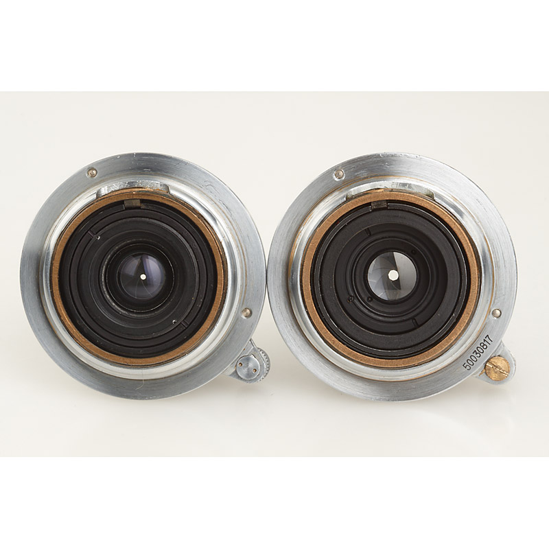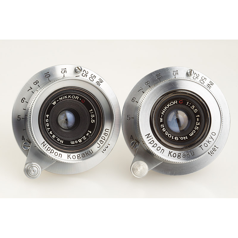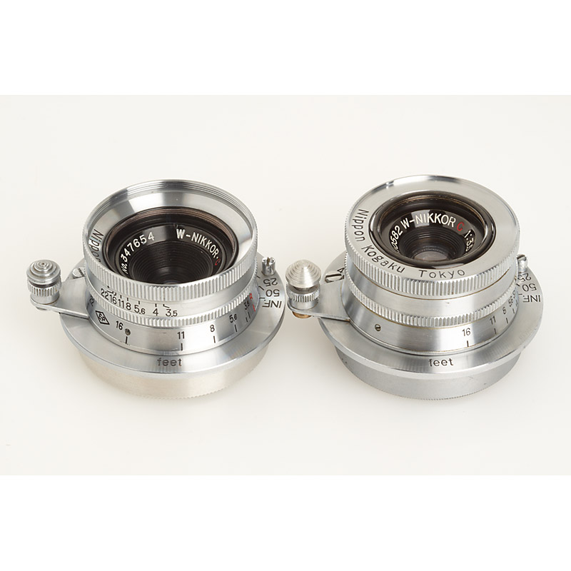 two wide-angle Nikkor lenses in RF coupled M39 screw mount: (1) W-Nikkor-C 3.5/2.8cm no.347654, E-P engraved (cond. B/A, rear cap), (2) quite rare and early Tokyo W-Nikkor-C 3.5/3.5cm no.910582, on rear engraved '50030817' (cond. B/A, good lenses, rear cap) - ex Tad Sato collection (2)