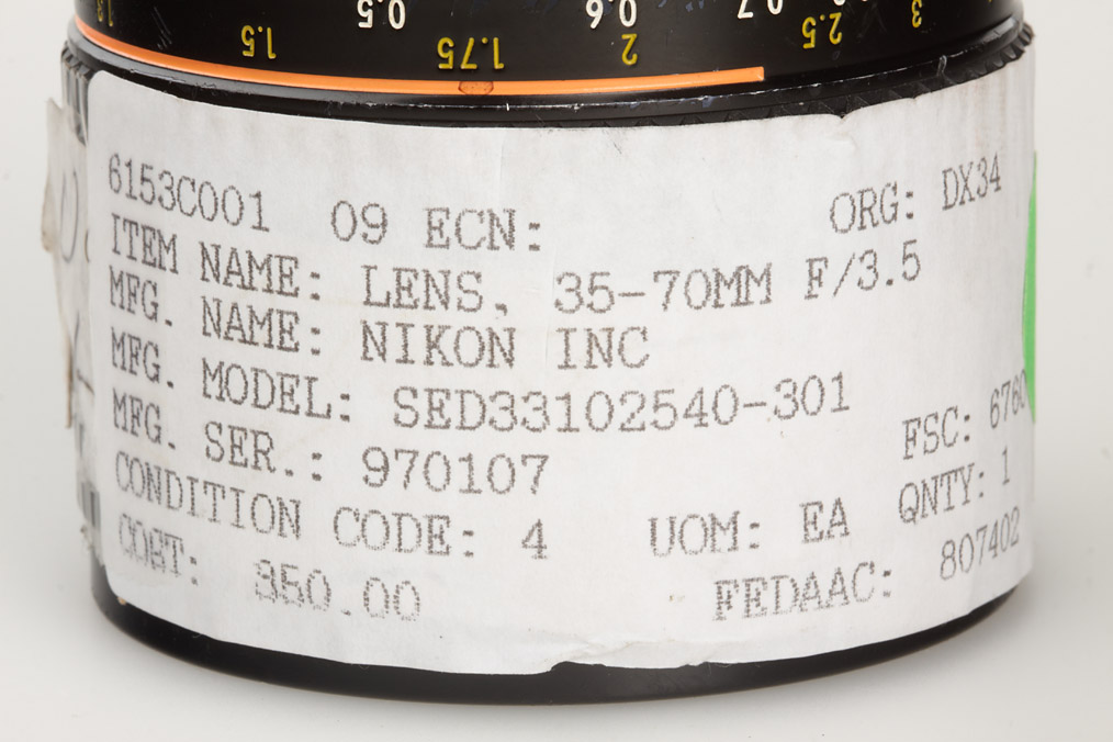AI/S Nikkor with typical NASA Property and inventory stickers and hand engraved number 728338, cap