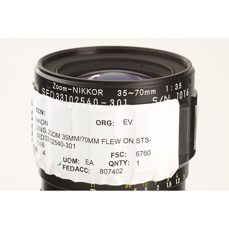 AI/S Nikkor with different design with typical NASA number: SED 33102540-301, S/N 1016, with NASA inventory sticker and hand engraved number 727064, both caps, flight record (flew on STS-48 Space Shuttle Discovery Mission on September 12th 1991)