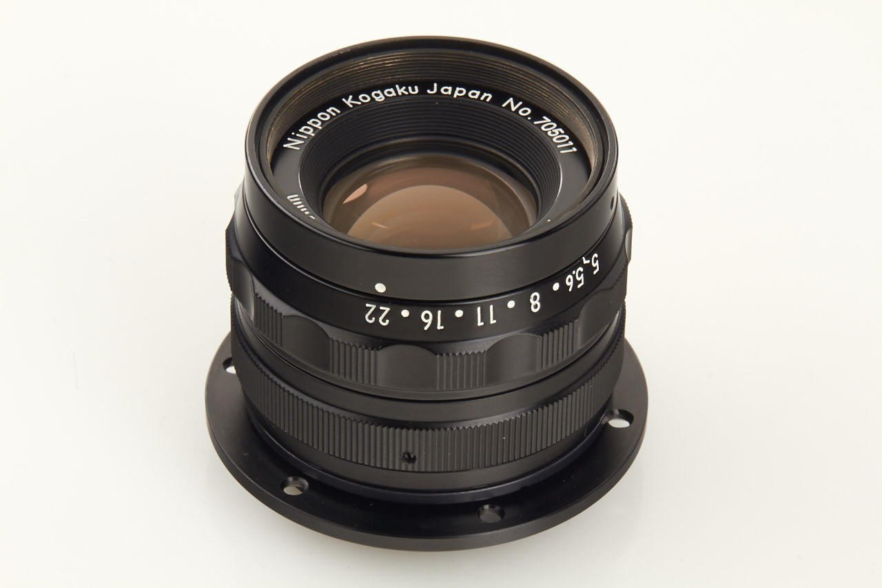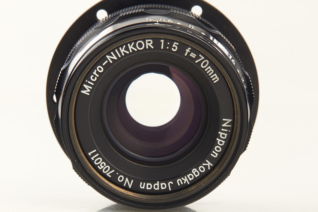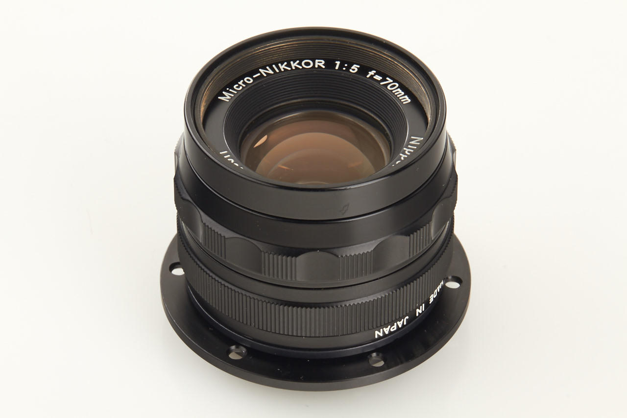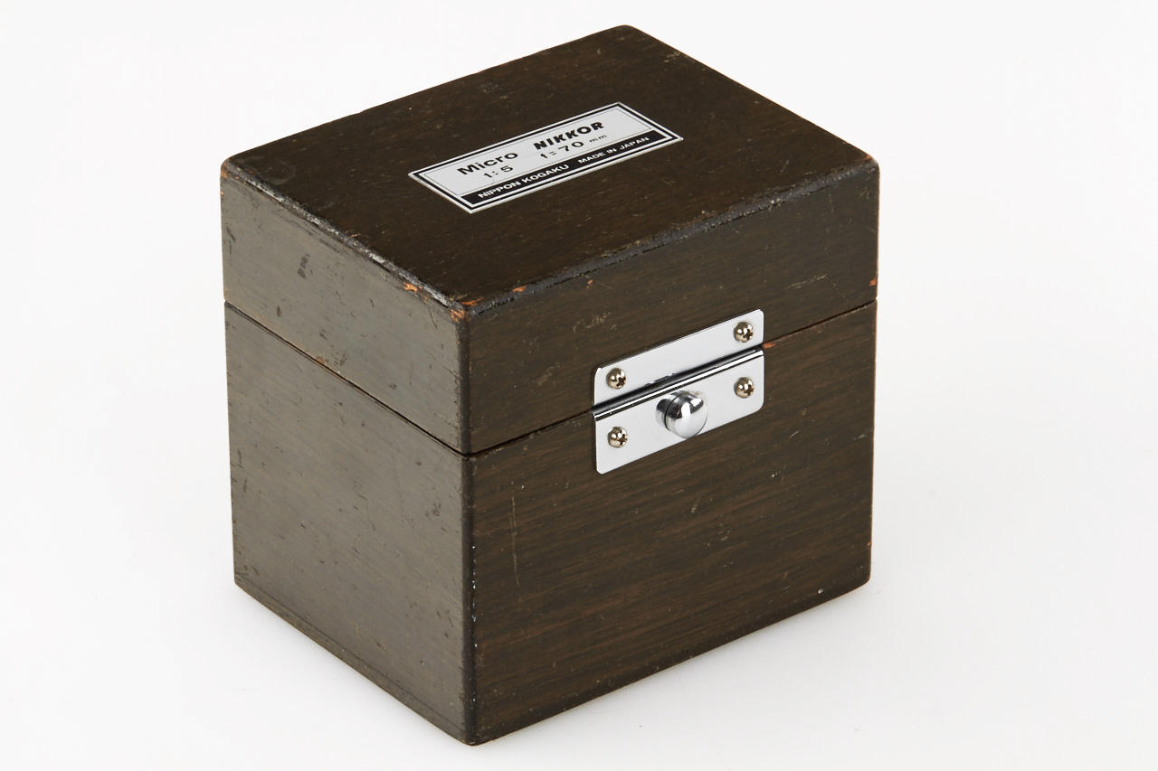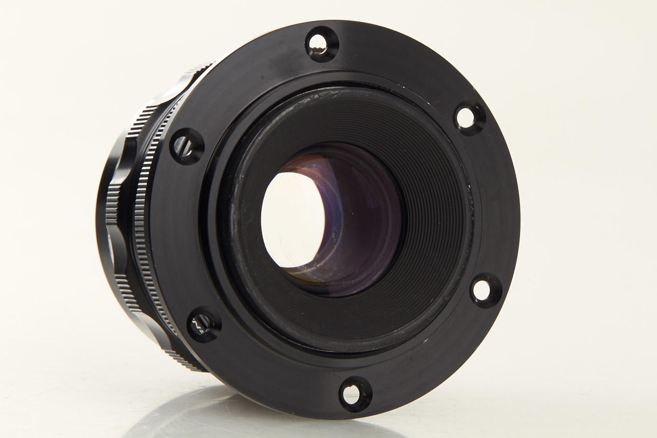 rare high resolution macro lens in near mint condition, as opposed to conventional lenses which are corrected at infinity focus, this lens is corrected for aberrations at its standard reduction ratio - 1/12x, 55mm image size, with mounting ring, front cap and padded wooden maker's box, very early - the production started with 705001