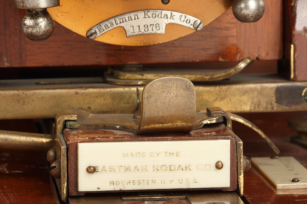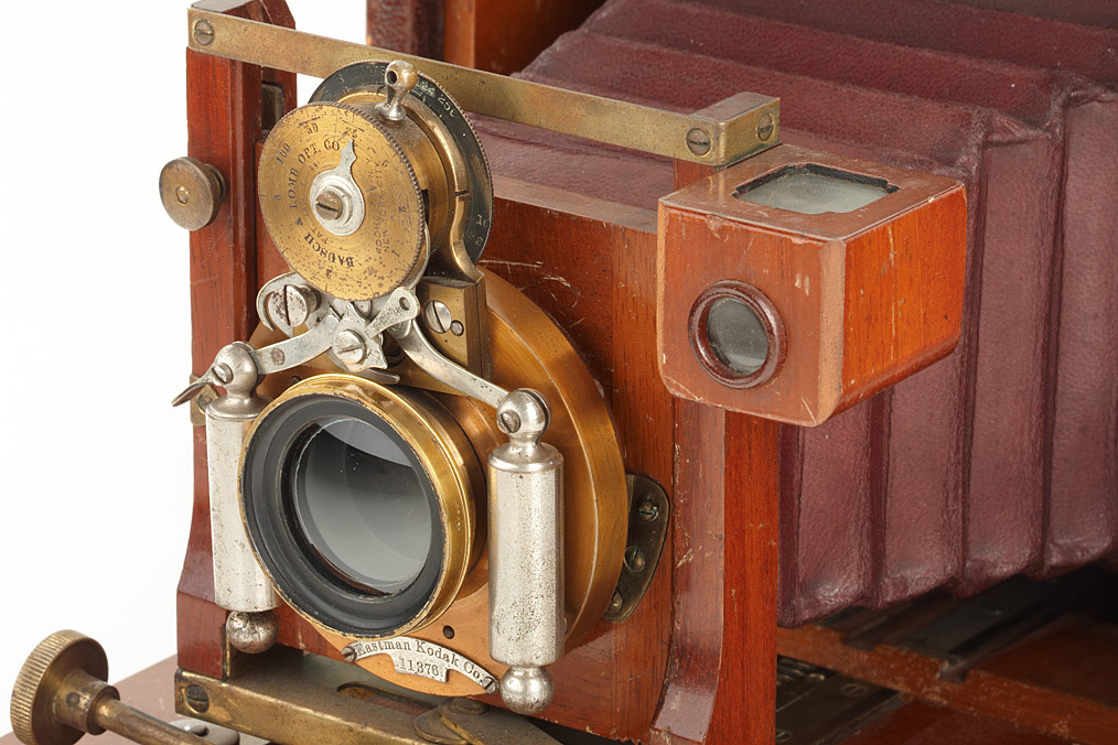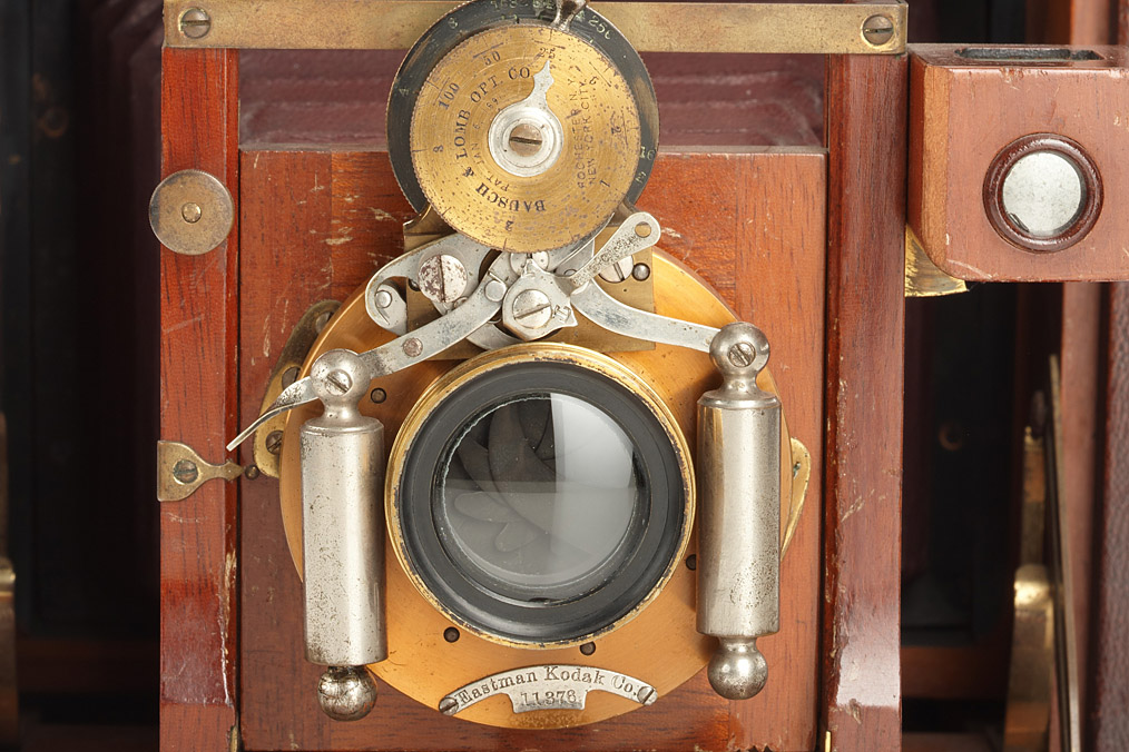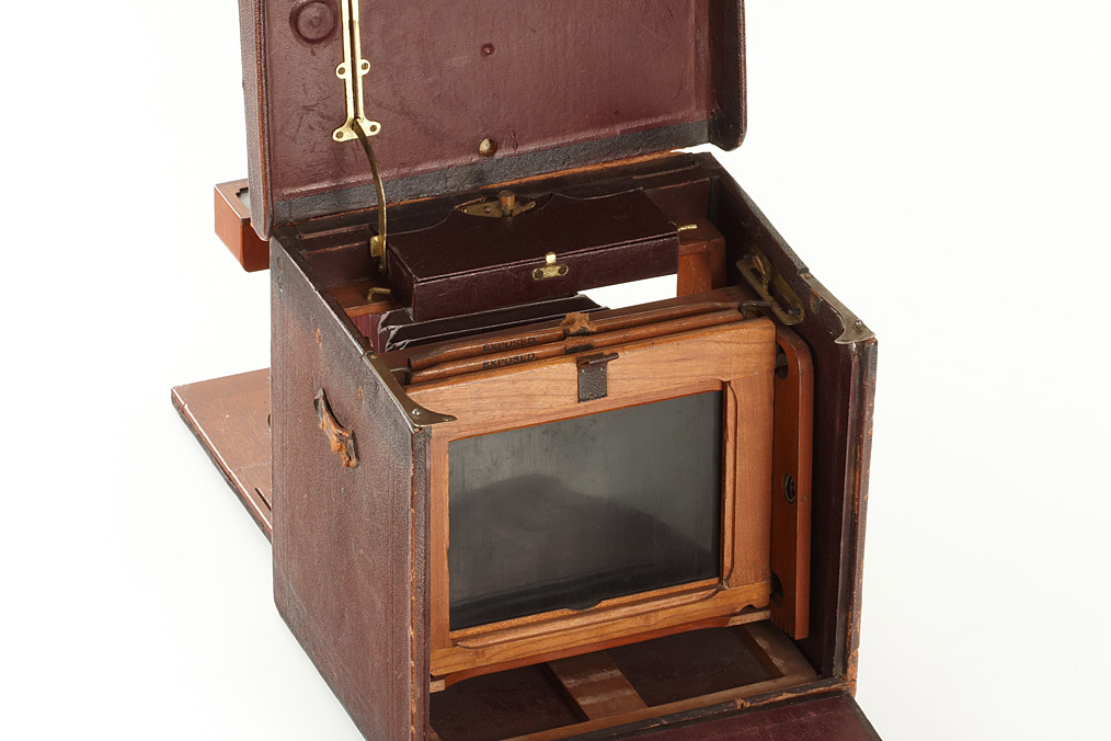 the folding camera resembles a leather carrying case when closed, for plates 4x5", with unmarked lens in B&L pneumatic shutter