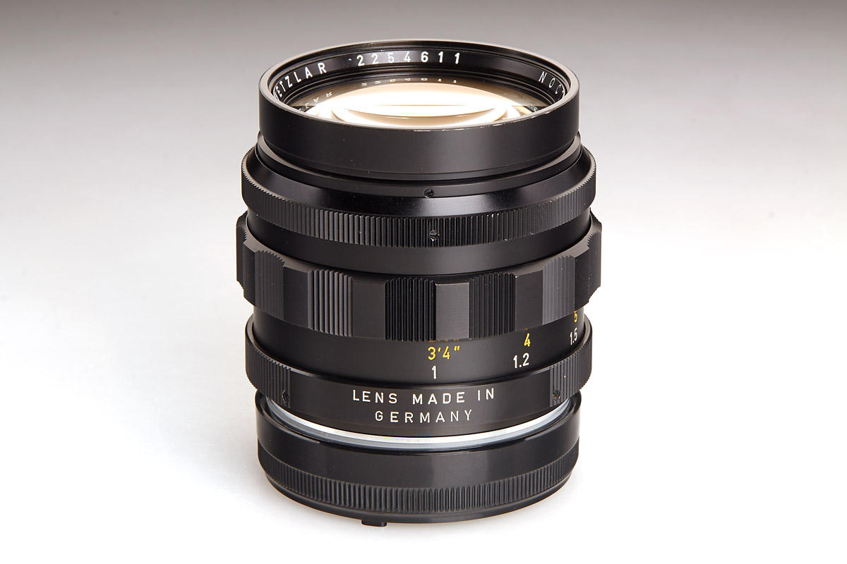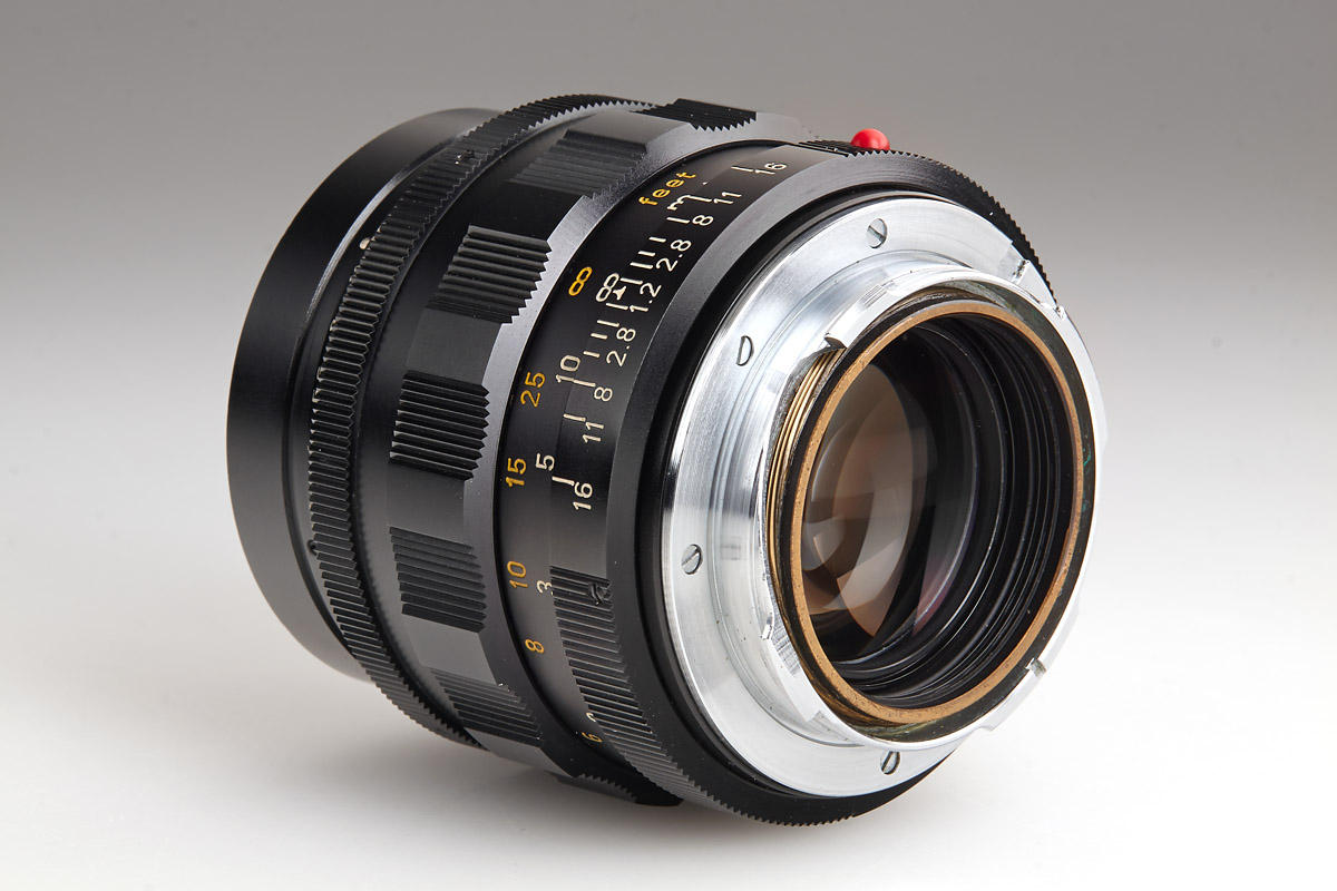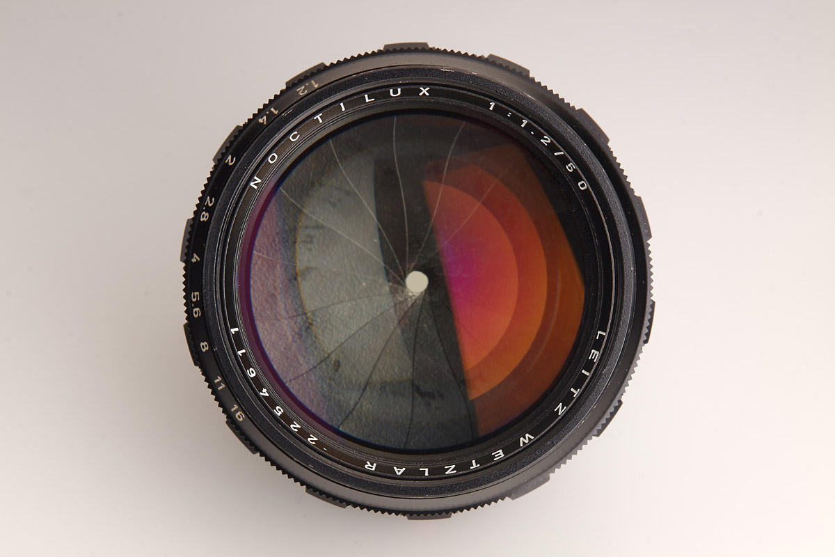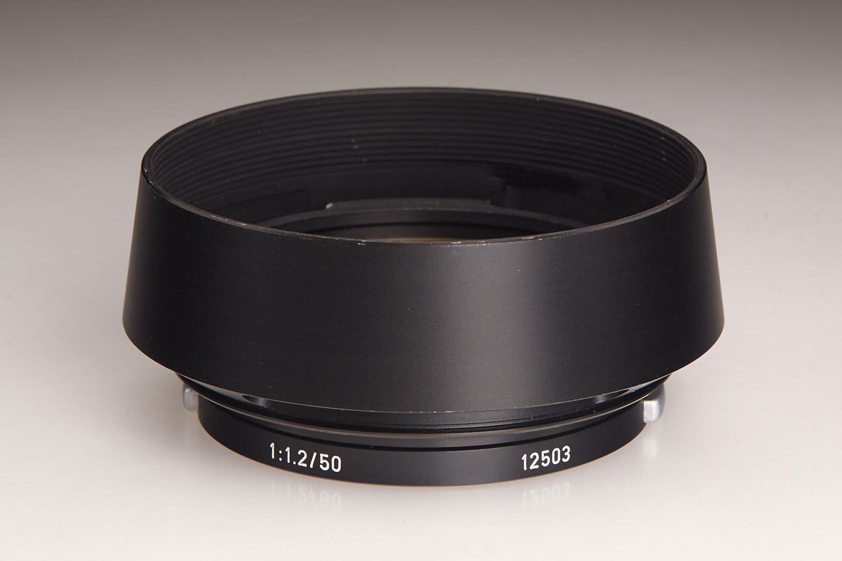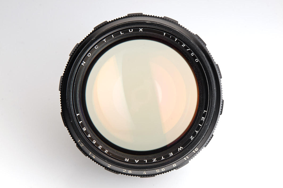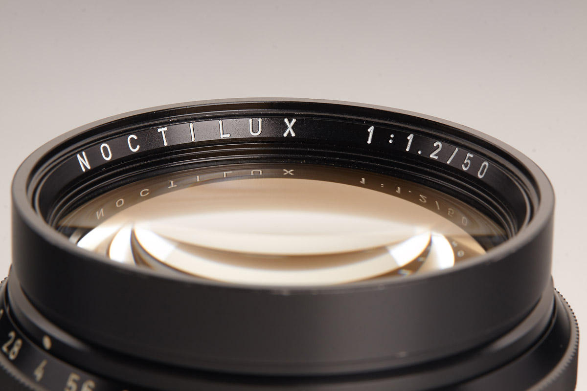 Rare lens in perfect condition with clean optics. With both caps, hood 12503 sunshade and series 8 UVA filter. Literature: James L. Lager (ed.), Leica Illustrated History, Vol. II, 1994, p. 174. The Leitz 50 mm Noctilux f/1.2 lens was the first 35 mm taking lens in the world containing an aspheric element. Leitz Wetzlar optical designers Helmut Frenk and Dr. Paul Sindel were responsible for the optical computation. The lens was introduced in 1966 and was received by the market as a sensation. It is almost entirely free of spherical aberration and coma while producing an exceptionally high degree of contrast. 45 years ago, however, even for Leitz it was quite a challenge to produce such a lens, a fact reflected in its price as well: the lens was almost twice as expensive as the body of the Leica M4. It was replaced by the 50 mm Noctilux f/1 in 1976, which – using optical glasses new at the time – could be calculated without aspherical elements and was even cheaper than its predecessor. In ten years of its production, only about 2,500 units of the 50 mm Noctilux f/1.2 were produced in total, which represents a proportion of one unit per business day. The Noctilux f/1.2 lens can truly be called a legend within the technical development of the Leica lenses. It is not only sought-after by collectors, but still also a favourite of some photographers. Das Leitz Noctilux 1:1,2/50 mm war weltweit das erste serienmäßig hergestellte Kleinbild Fotoaufnahmeobjektiv mit asphärischer Linse. Die Konstruktion geht zurück auf die Leitz Optikrechner Helmut Frenk und Dr. Paul Sindel. Es wurde im Jahr 1966 vorgestellt und wurde vom Markt als Sensation aufgenommen. Bei hoher Kontrastleistung konnten sphärische Aberration wie auch die Komazeichung auf ein Minimum reduziert werden. Das Objektiv zu fertigen war vor 45 Jahren allerdings selbst für die Firma Leitz mit erheblichem Aufwand verbunden, und dies hatte auch seinen Preis: Das sechslinsige Noctilux war fast doppelt so teurer wie das Gehäuse der Leica M4. Erst im Jahr 1976 wurde es durch das Noctilux 1:1/50 abgelöst, das aufgrund neuer Glassorten dann ohne asphärische Linsen gerechnet werden konnte und dadurch sogar einen niedrigeren Preis als sein Vorgänger hatte. Von dem Noctilux 1:1,2/50 mm wurden in zehn Jahren seiner Produktion nur etwa 2.500 Objektive gefertigt, was durchschnittlich einem Exemplar pro Werktag entspricht. Das Noctilux 1:1,2 gilt als Legende innerhalb der Entwicklungsgeschichte der Leica Objektive und wird nicht nur von Sammlern gesucht, sondern auch von Fotografen zum Teil heute noch eingesetzt.