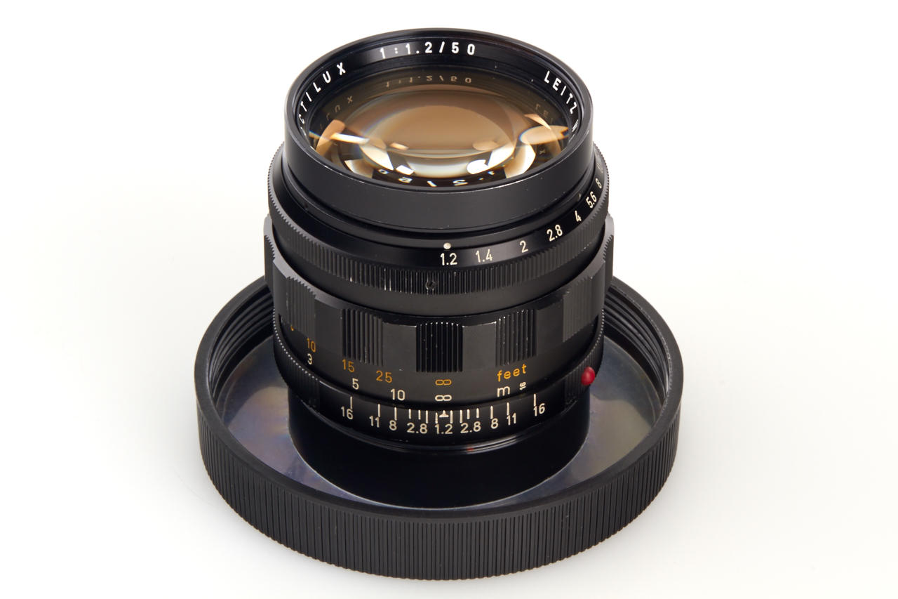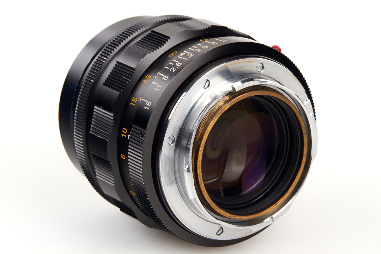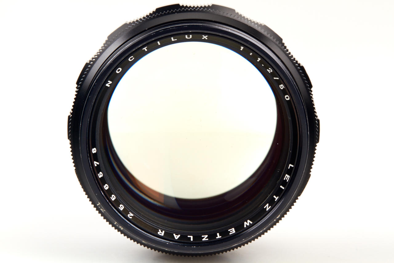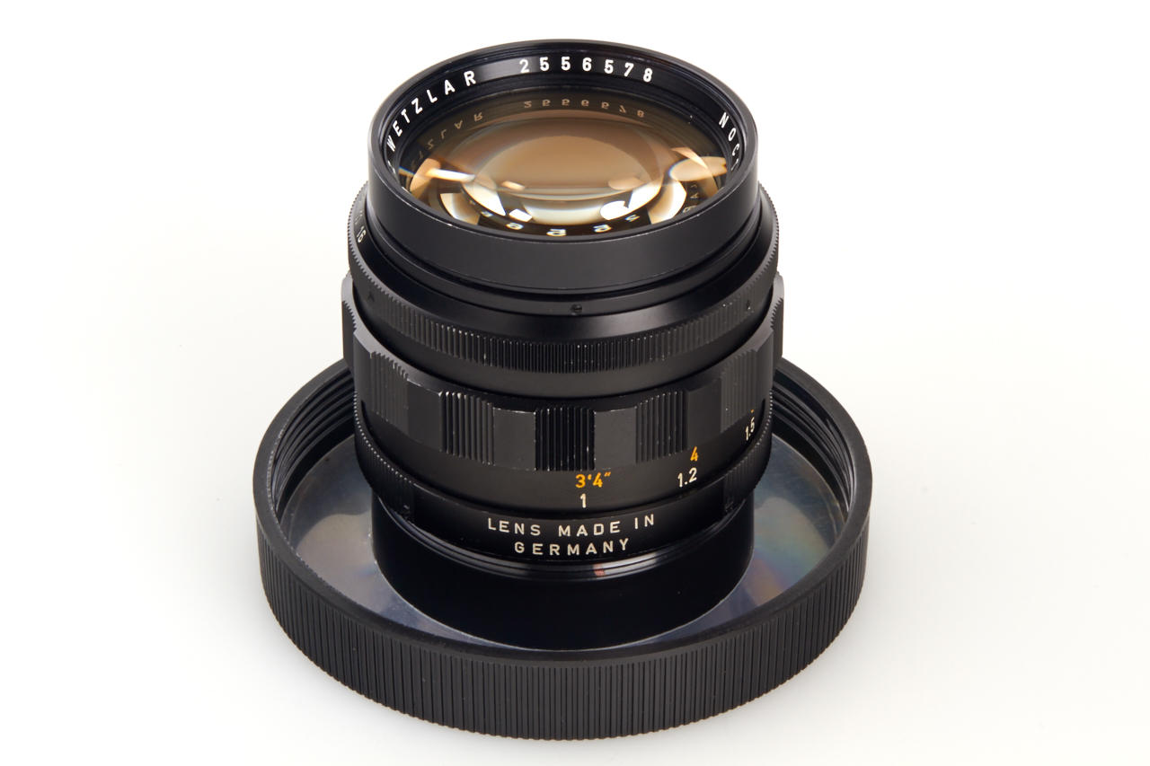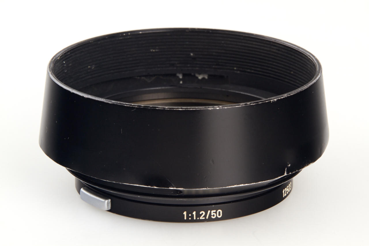 sought-after lens with two aspherical surfaces, in very good condition, clean optics, original metal hood 12503 (Cond. B-), with UVa filter, front cap, plastic case, warranty card and maker's box with matching serial number